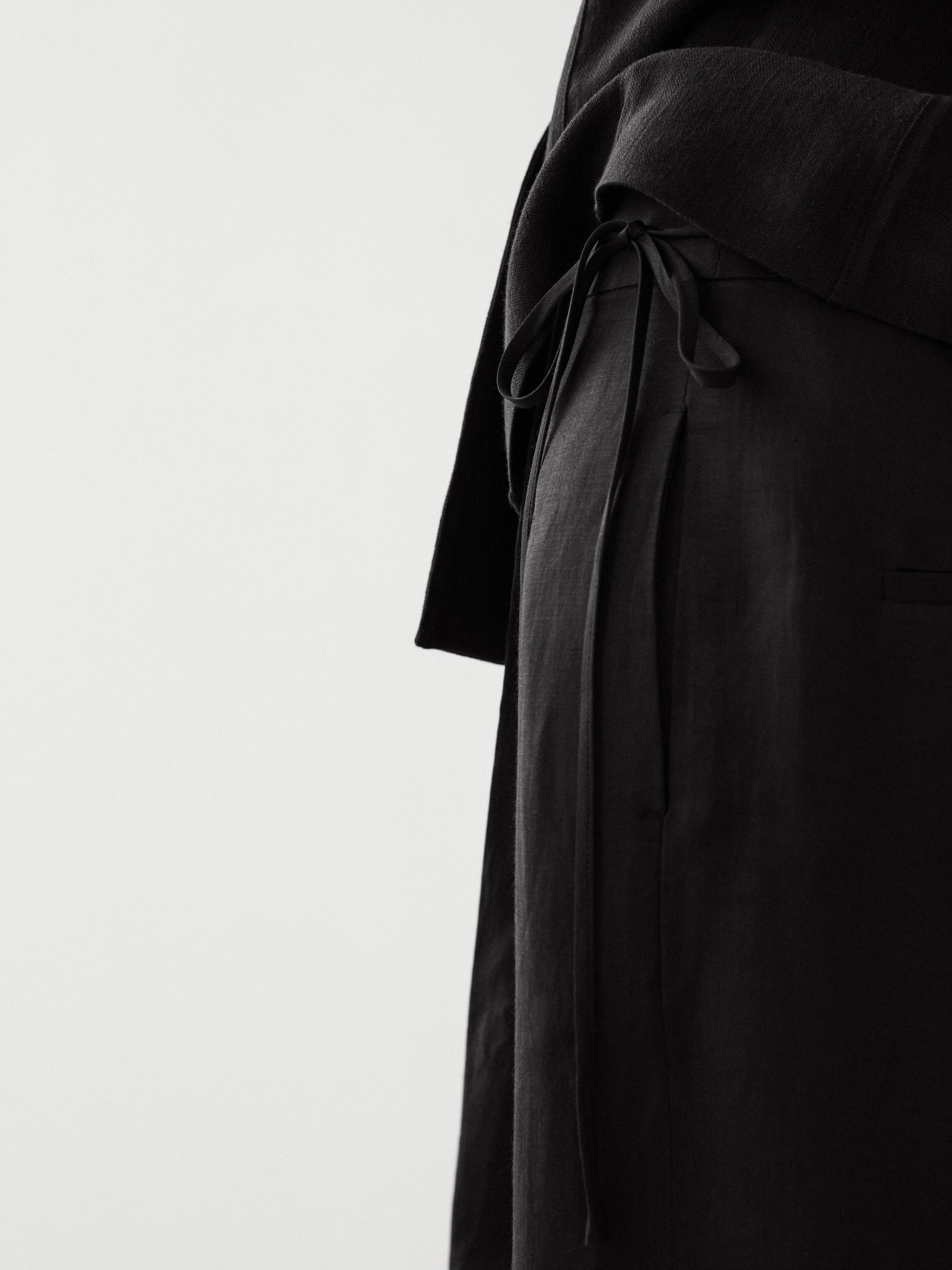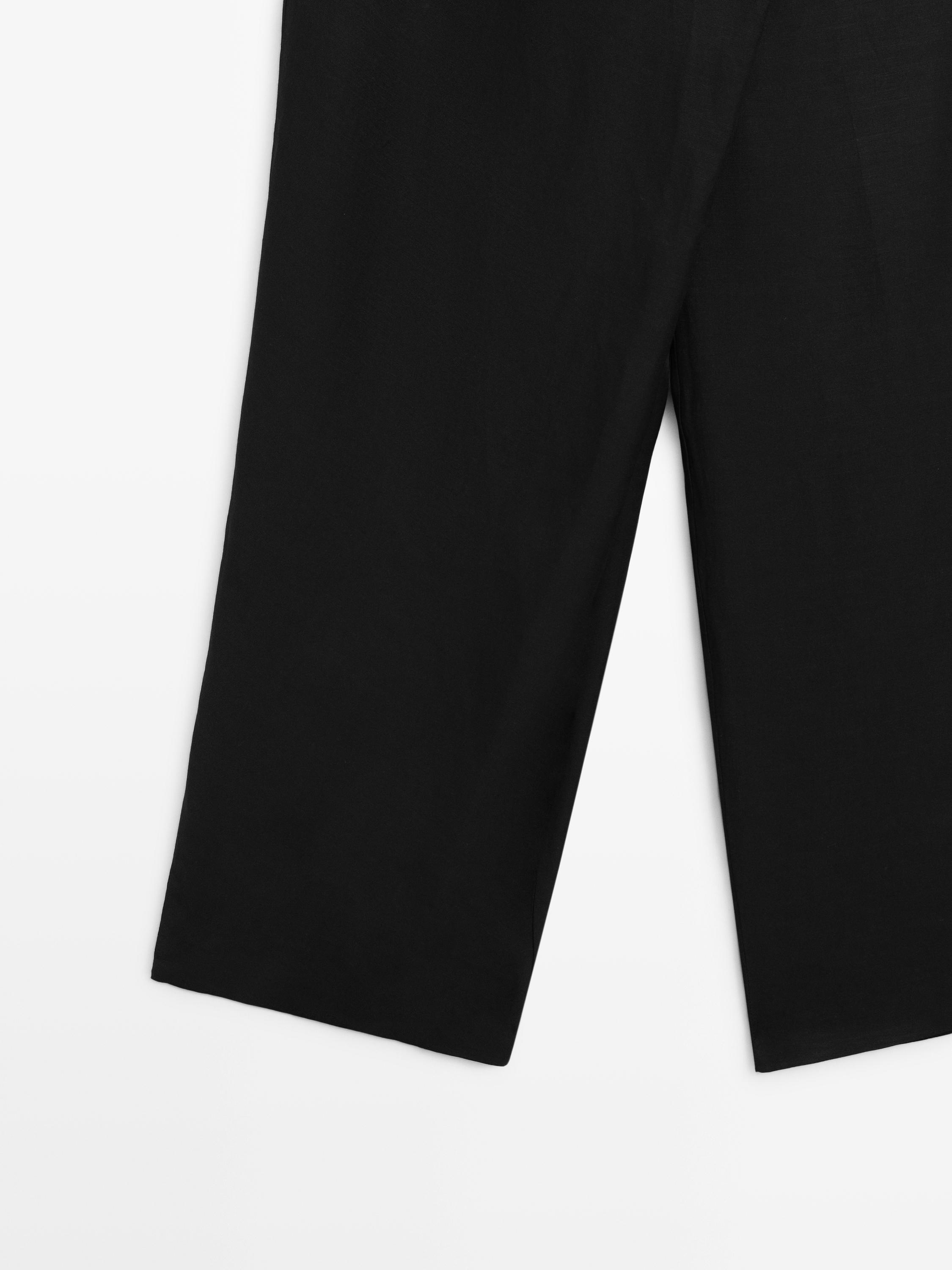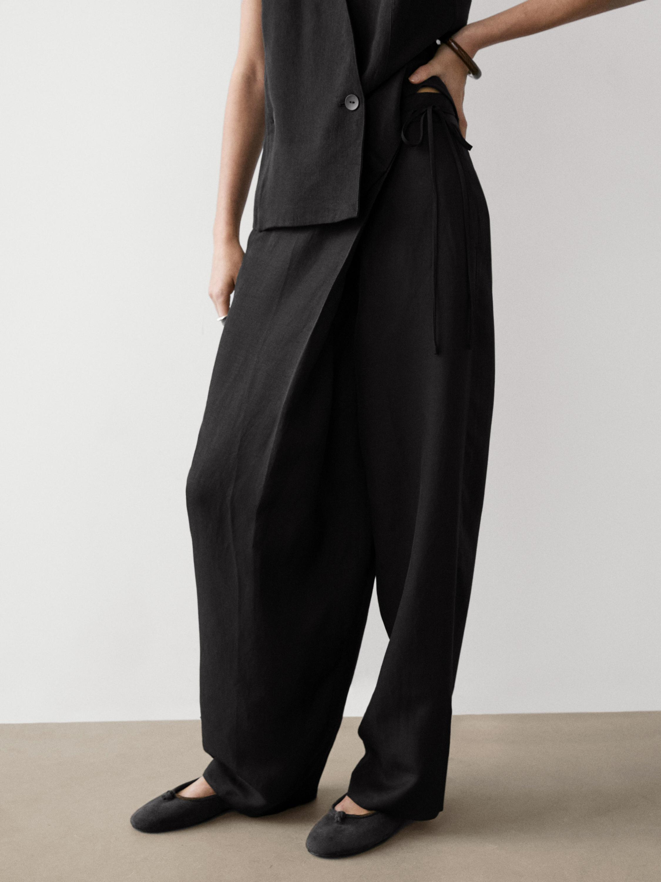 Брюки-парео. Пояс с петлями для ремня. Застежка на потайные пуговицы и завязку. Два прорезных кармана сзади. Струящаяся и легкая ткань.