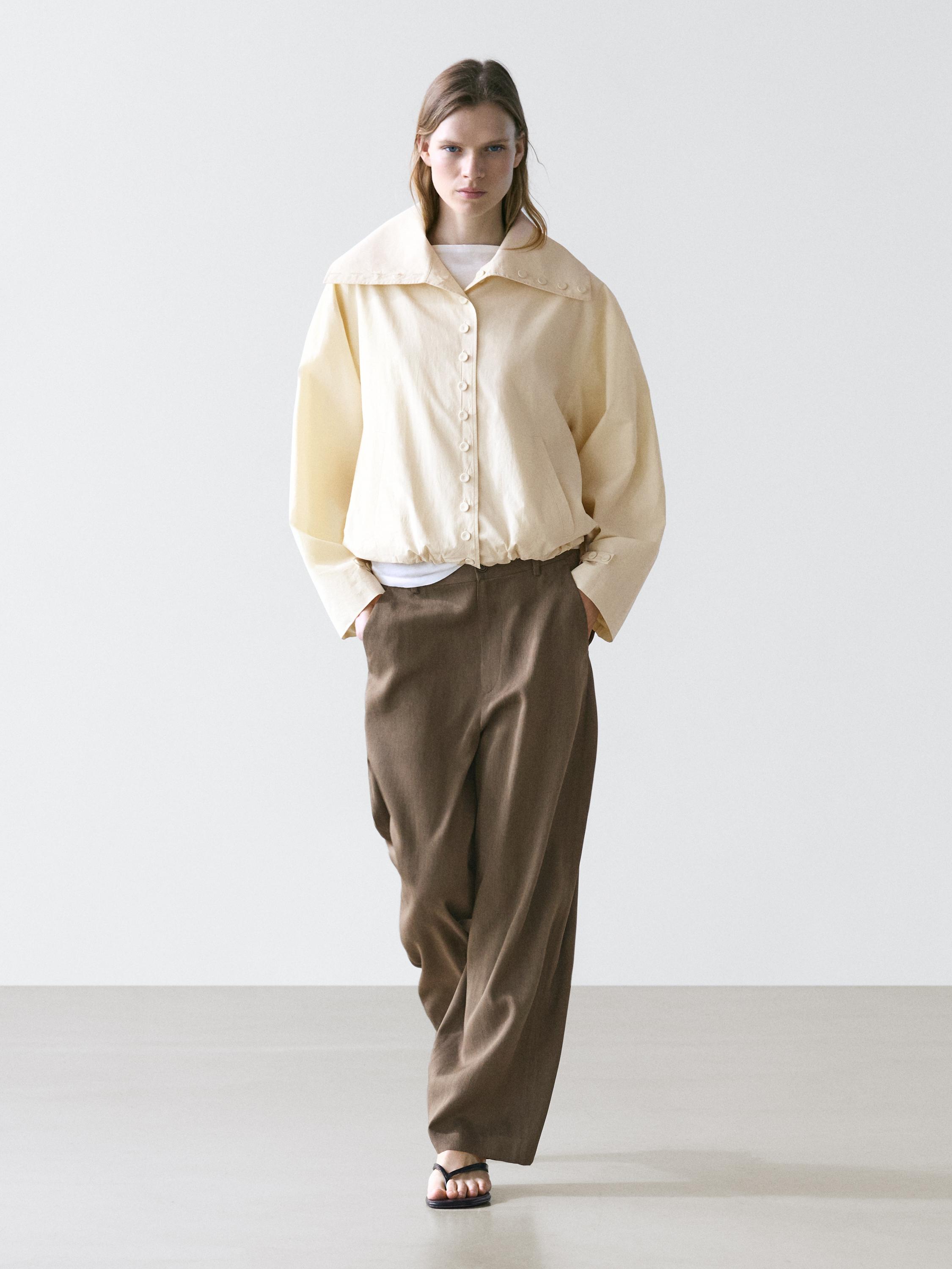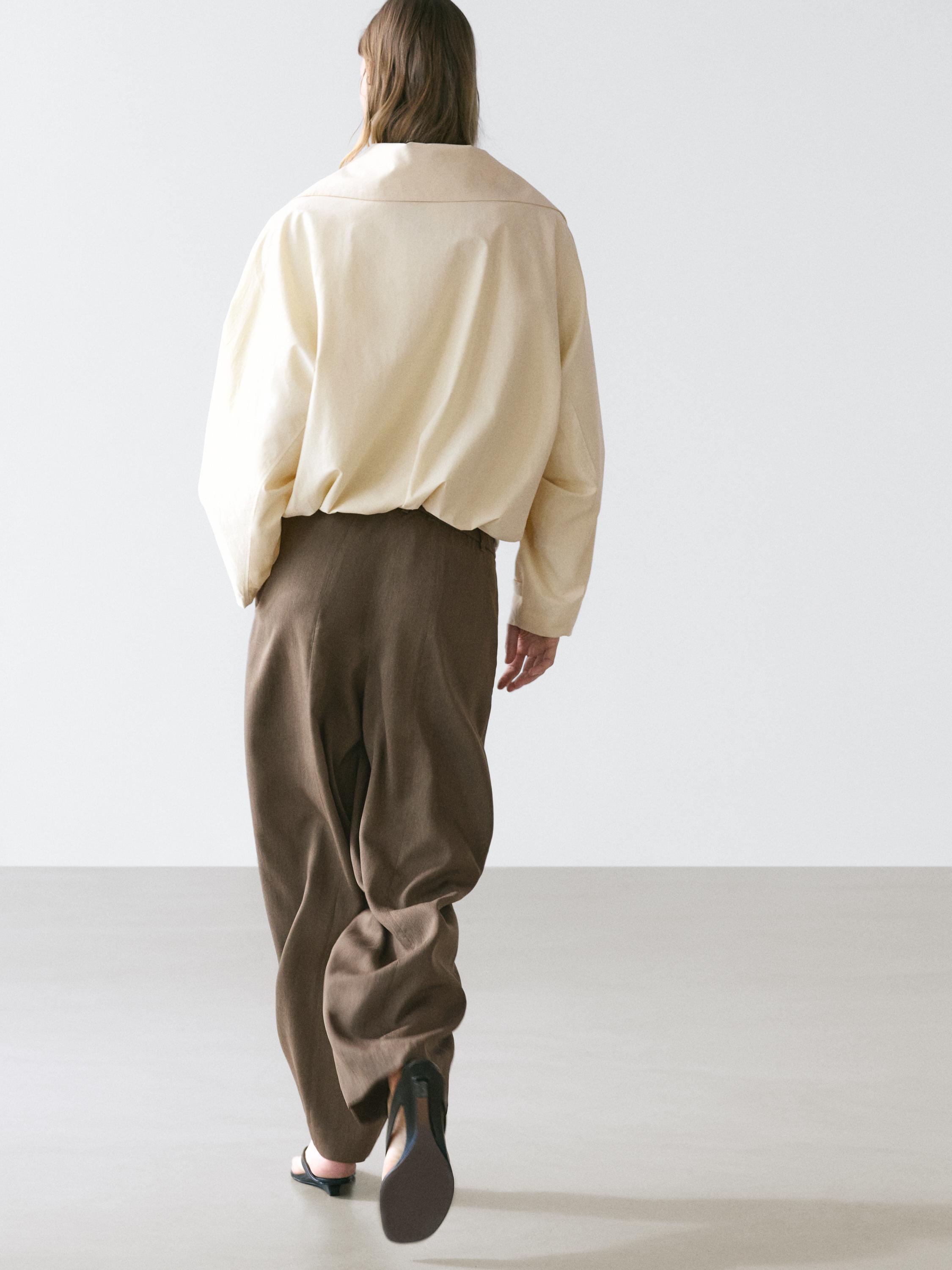 Широкие брюки из струящейся ткани. Пояс с петлями для ремня. Застежка на молнию спереди и пуговицу сверху. Эластичный пояс сзади. Два боковых кармана.