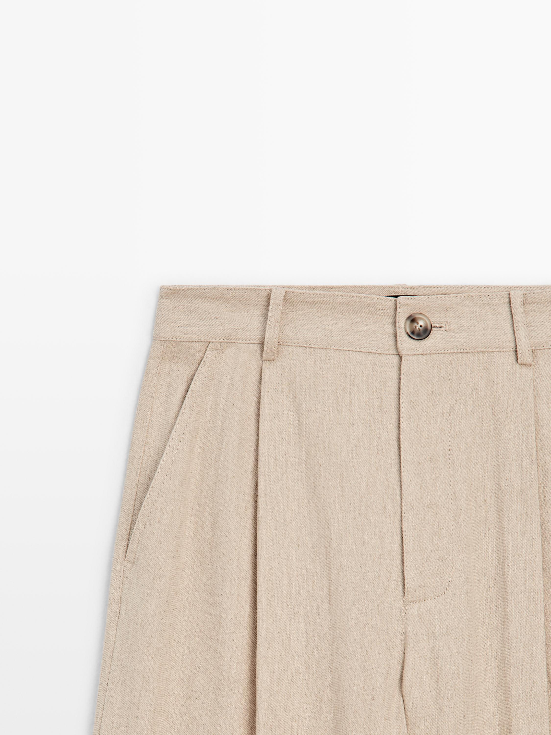 Брюки свободного кроя: более свободная и расслабленная посадка. Брюки из смесовой хлопчатобумажной ткани. Пояс с петлями для ремня. Застежка на молнию и пуговицу спереди. Два боковых кармана. Вытачки спереди.