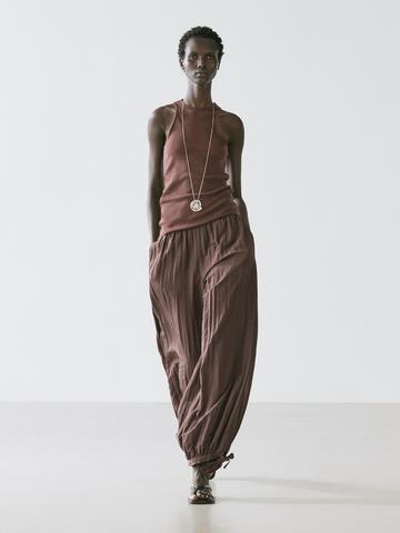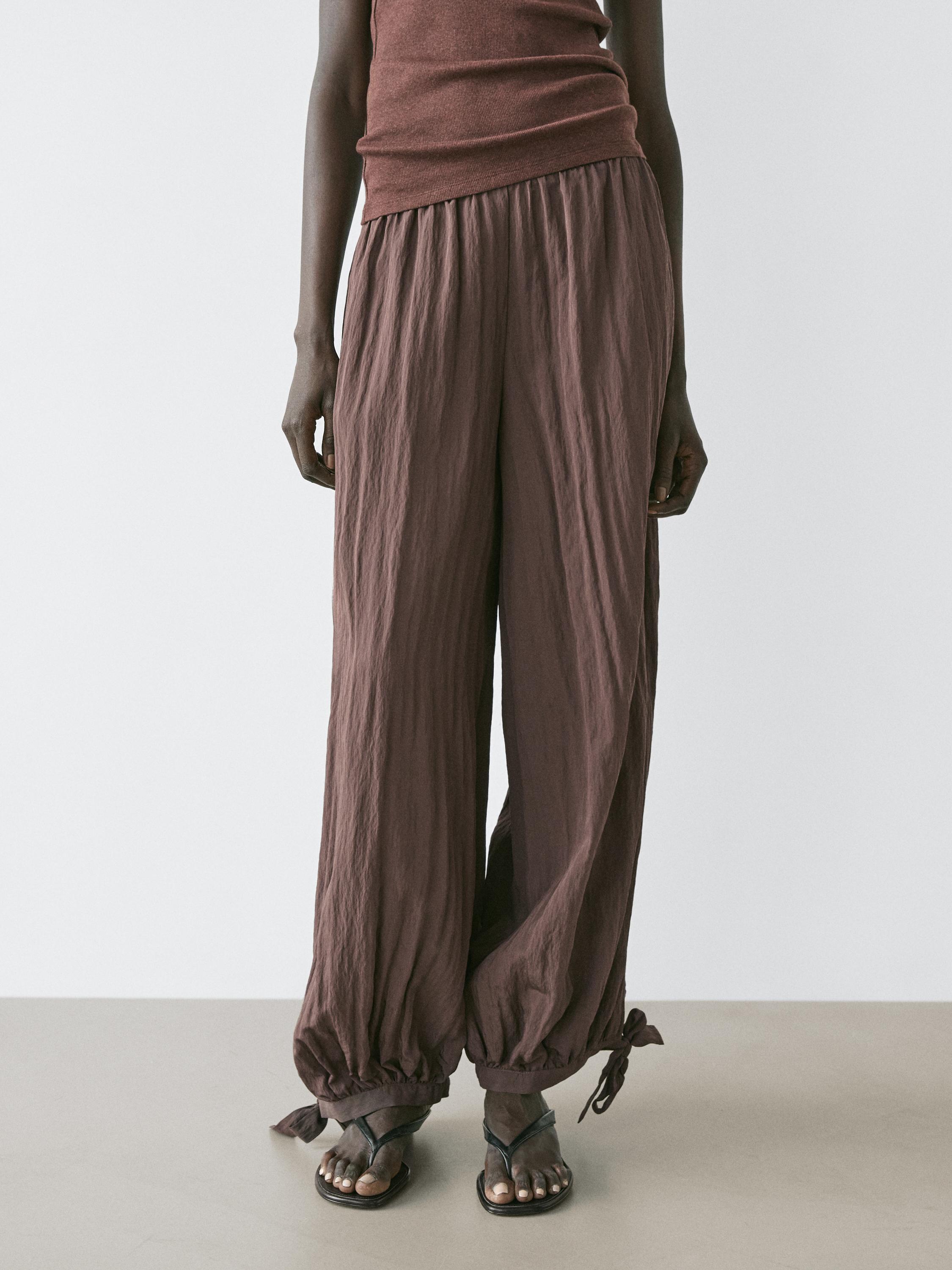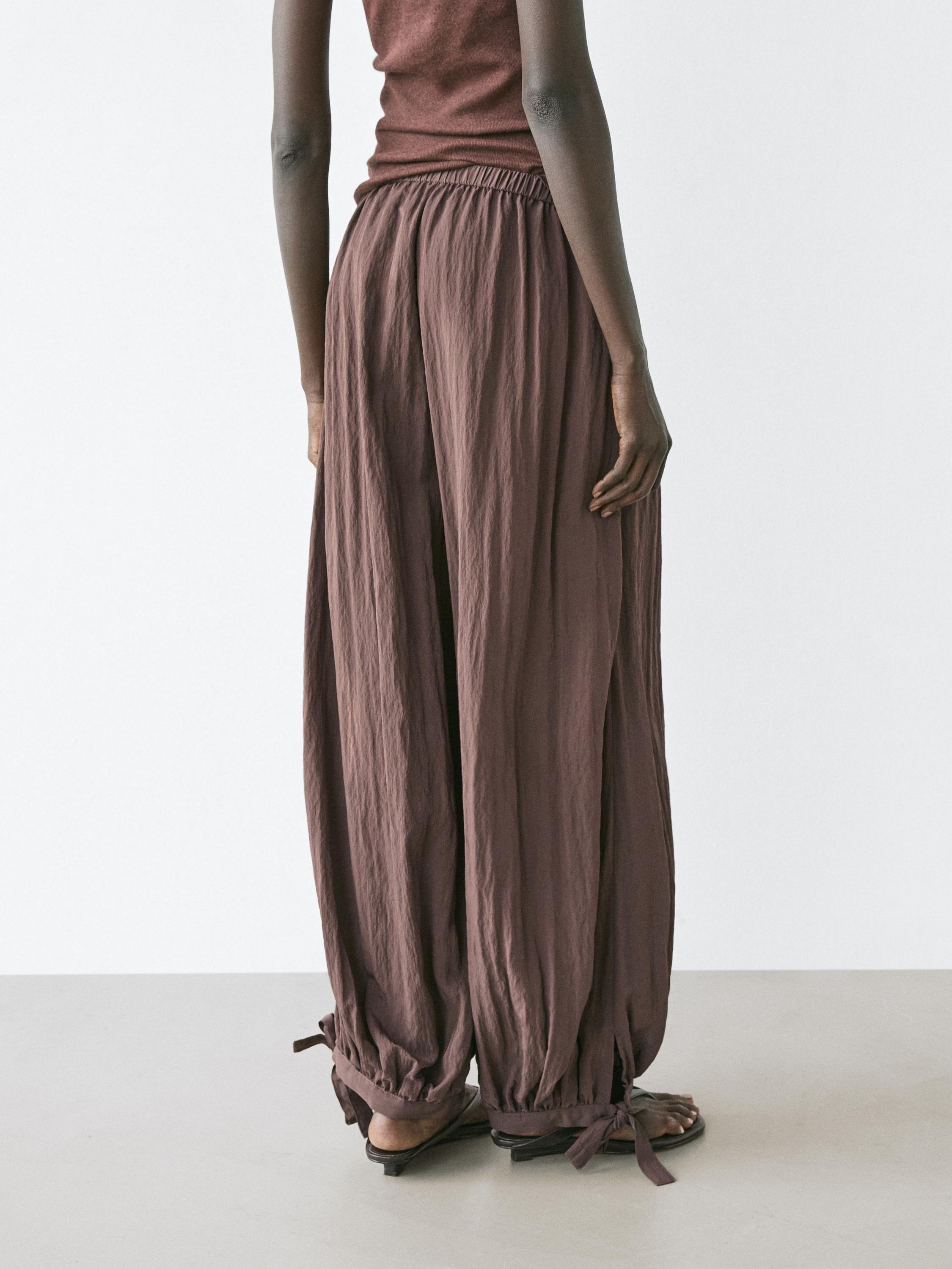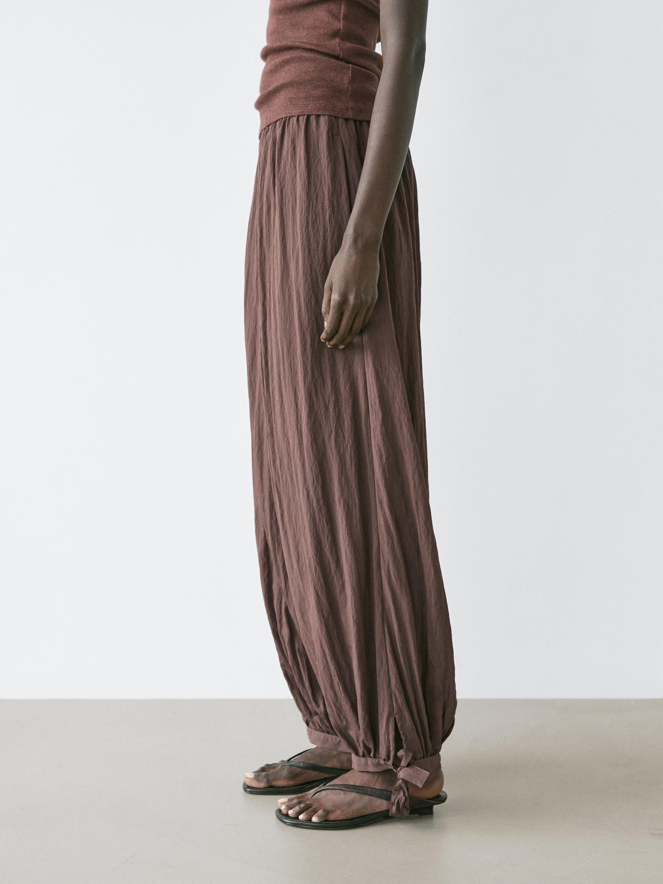 Брюки Sarouel: свободный силуэт, широкие штанины и облегающая щиколотка. Эластичный пояс. Эластичная резинка по низу штанин. Струящаяся и легкая ткань.