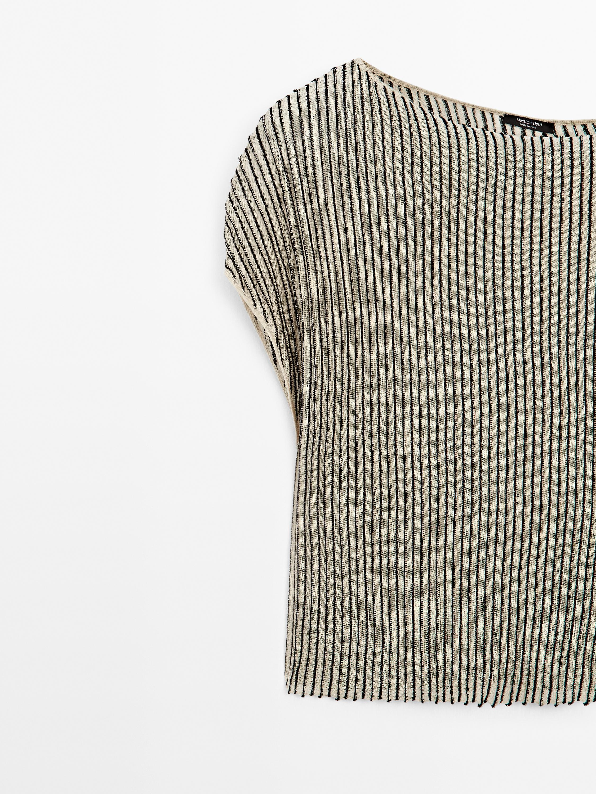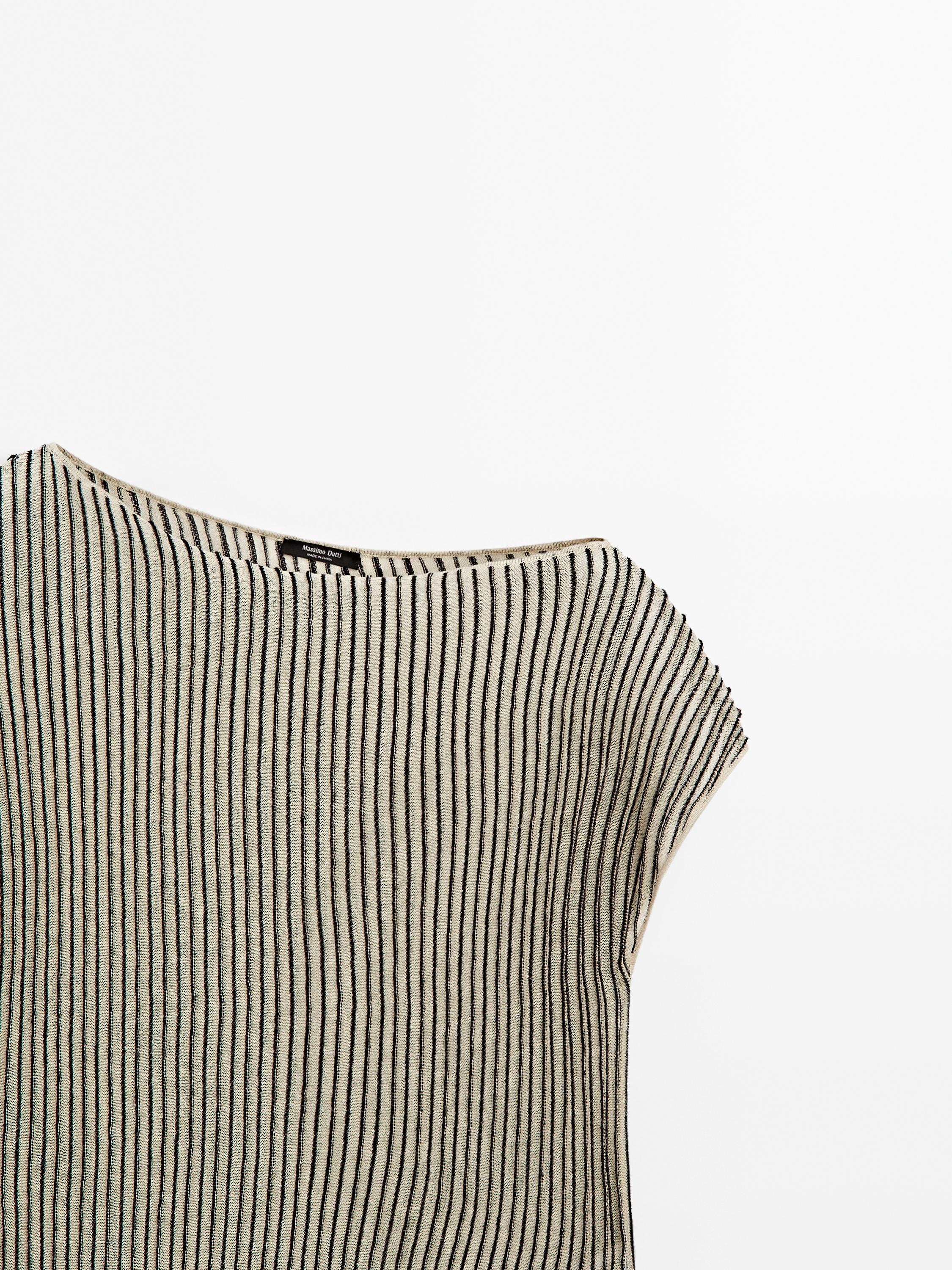 Топ из трикотажной ткани. Вырез-лодочка. Без рукавов. Асимметричный крой. Складки. Полосатый принт. В наличии аналогичный топ. Широкий и свободный силуэт, не приталенный
