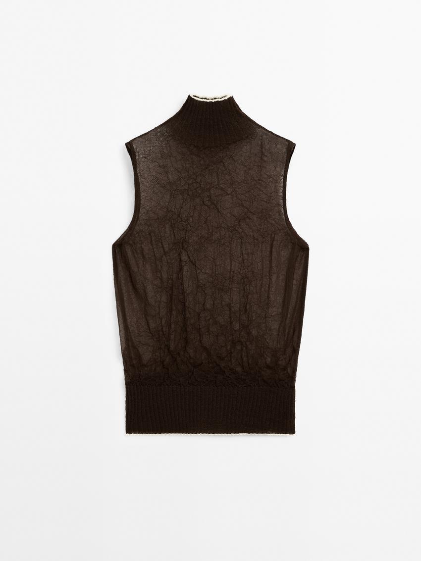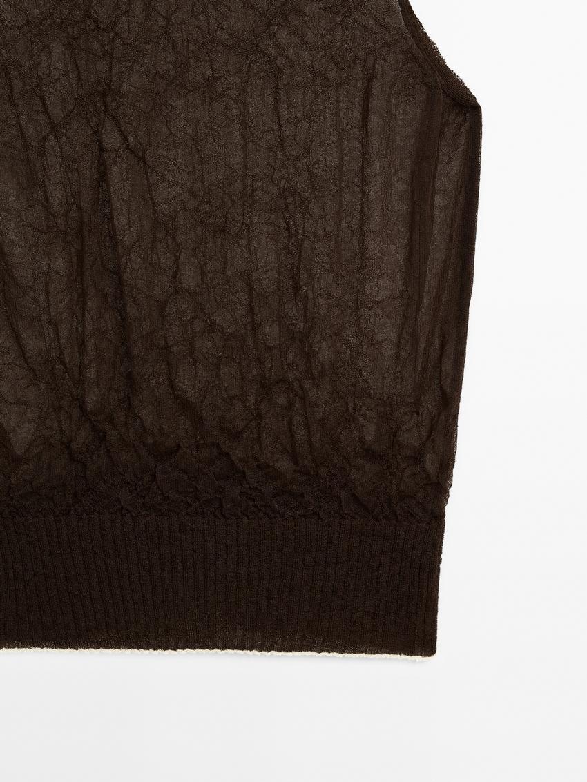 Полупрозрачная блузка. Воротник перкинс. Без рукавов. Текстурированная поверхность. Оборчатый воротник и деталь по краю. Текстурированная.