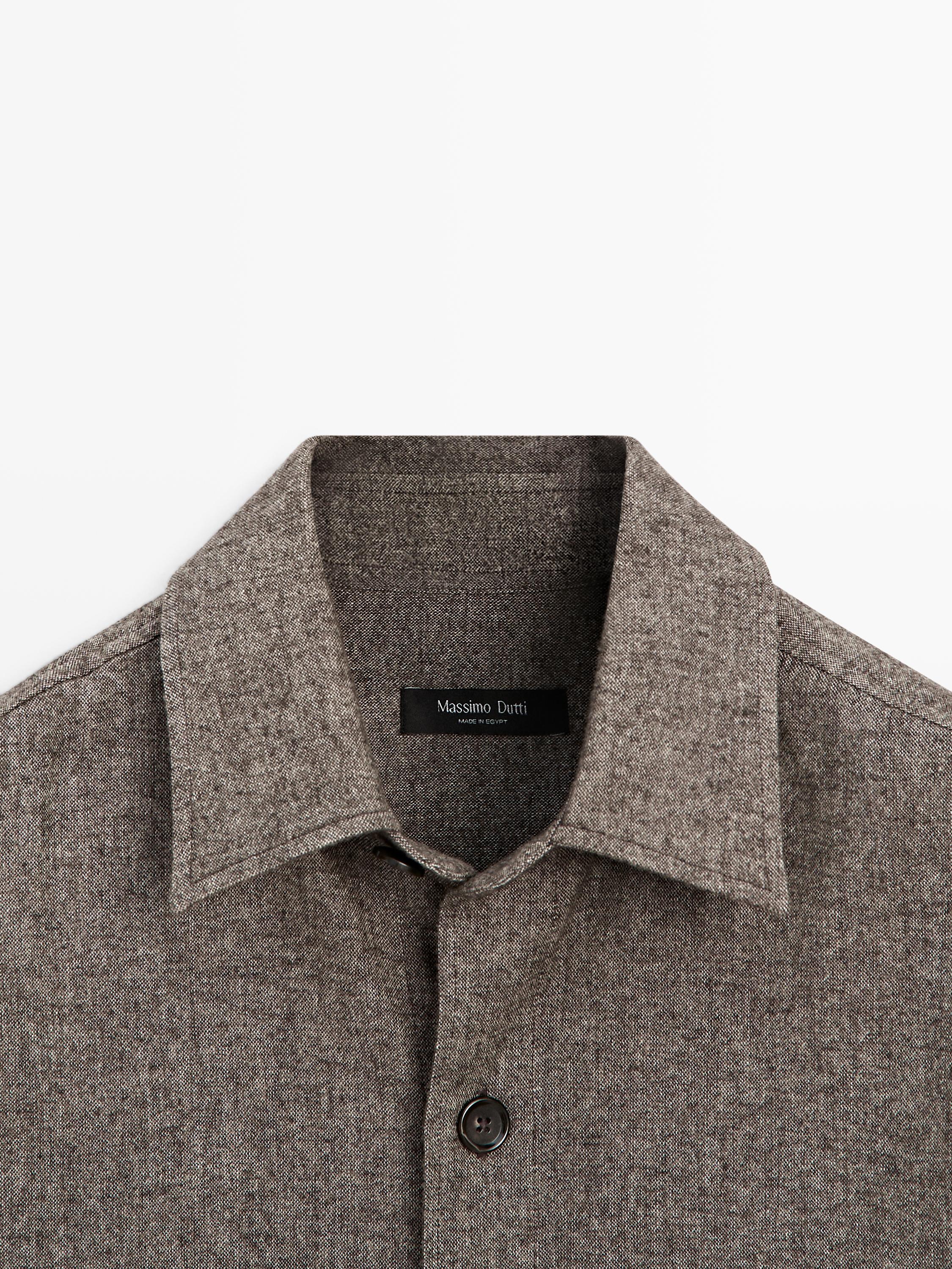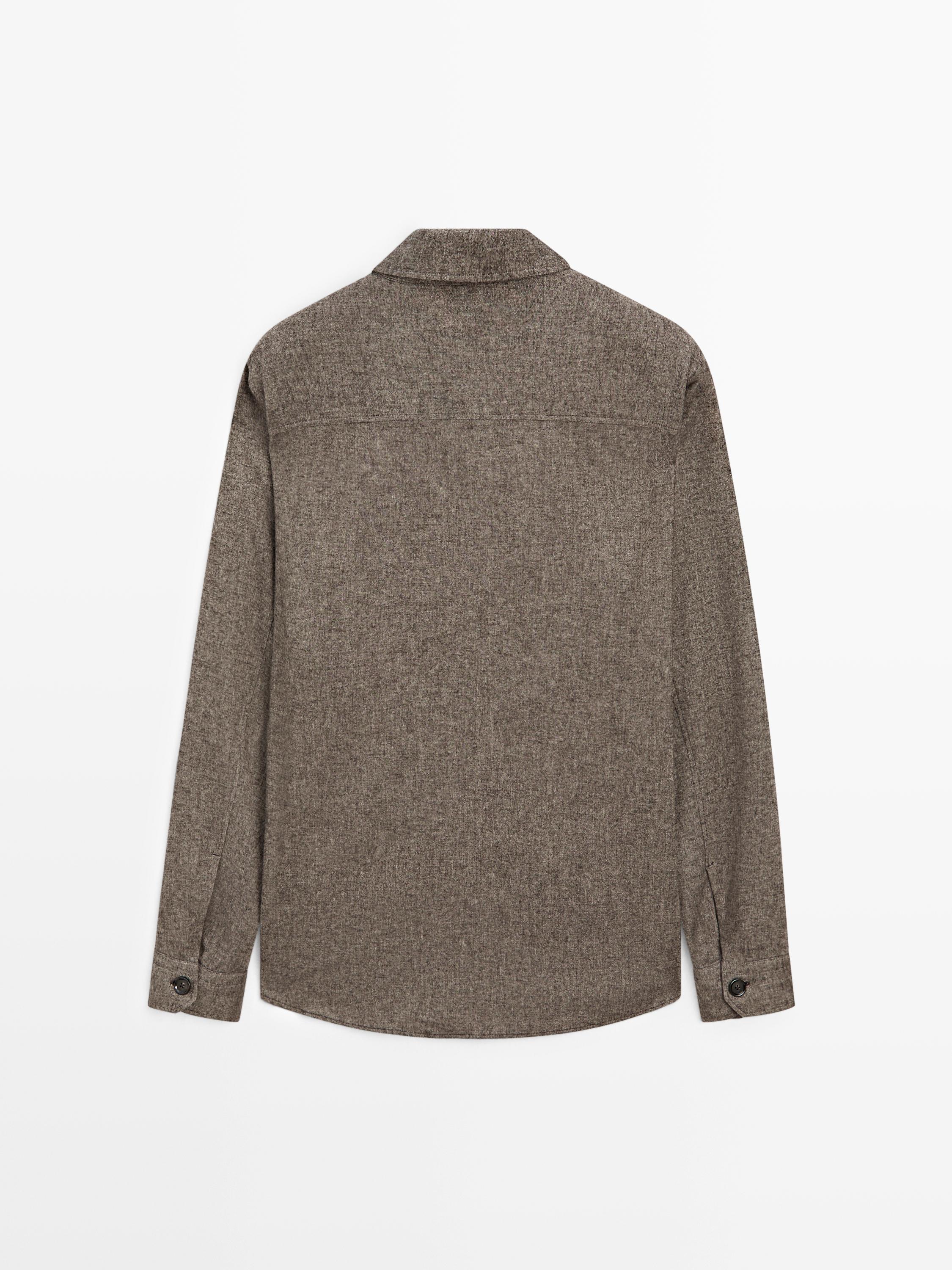 Рубашка-куртка из шерстяной ткани. Длинные рукава с манжетами на пуговицах. Рубашечный воротник. Застежка на пуговицы спереди. Два накладных кармана с клапанами на пуговицах.
