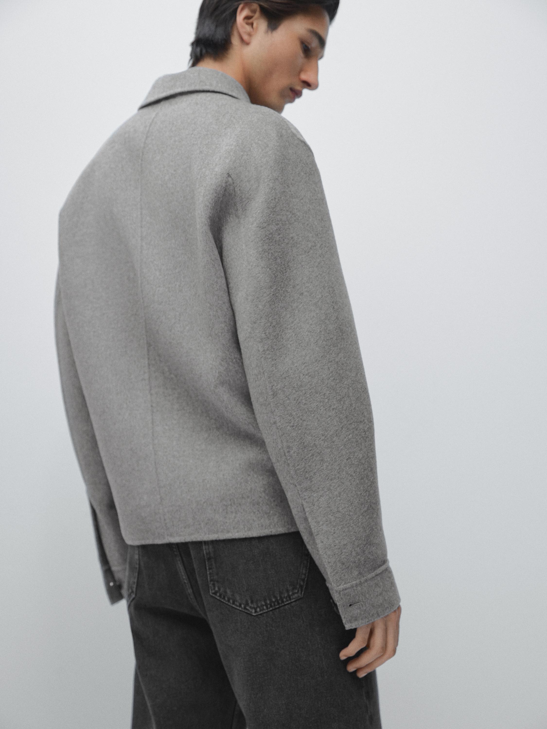 Тонкая куртка из смесовой шерстяной ткани. Длинные рукава с манжетами на пуговицах. Рубашечный воротник. Застежка на пуговицы спереди. Два боковых кармана. Два накладных кармана на уровне груди. Мягкая ткань с приятной текстурой. Двойная ткань: двойной слой шерсти и скрытые швы, мягкие и приятные на ощупь.