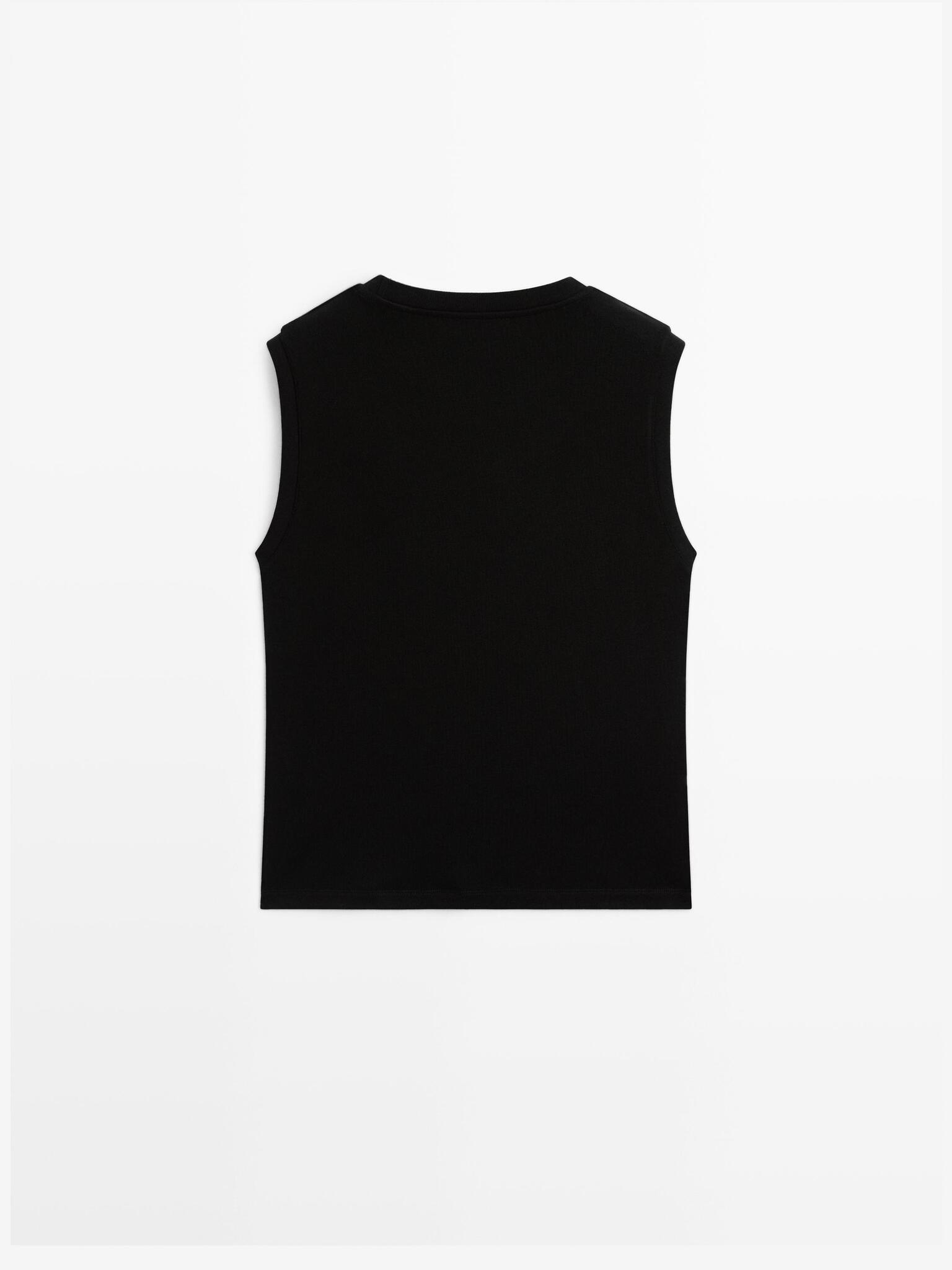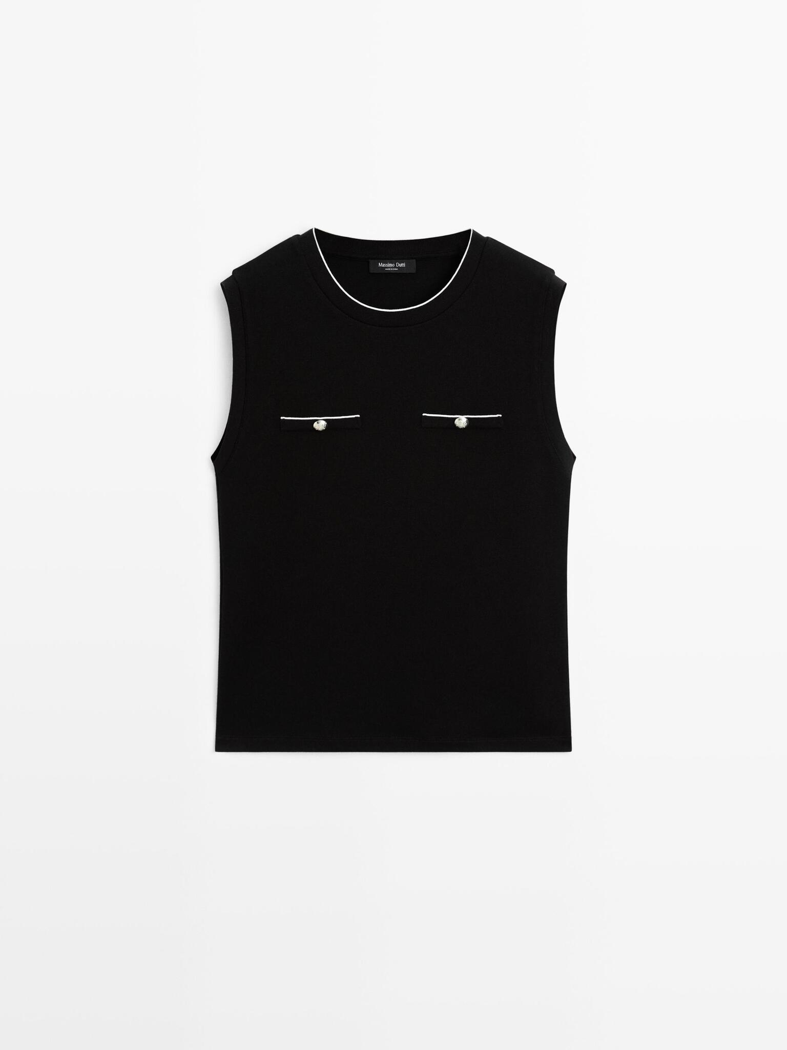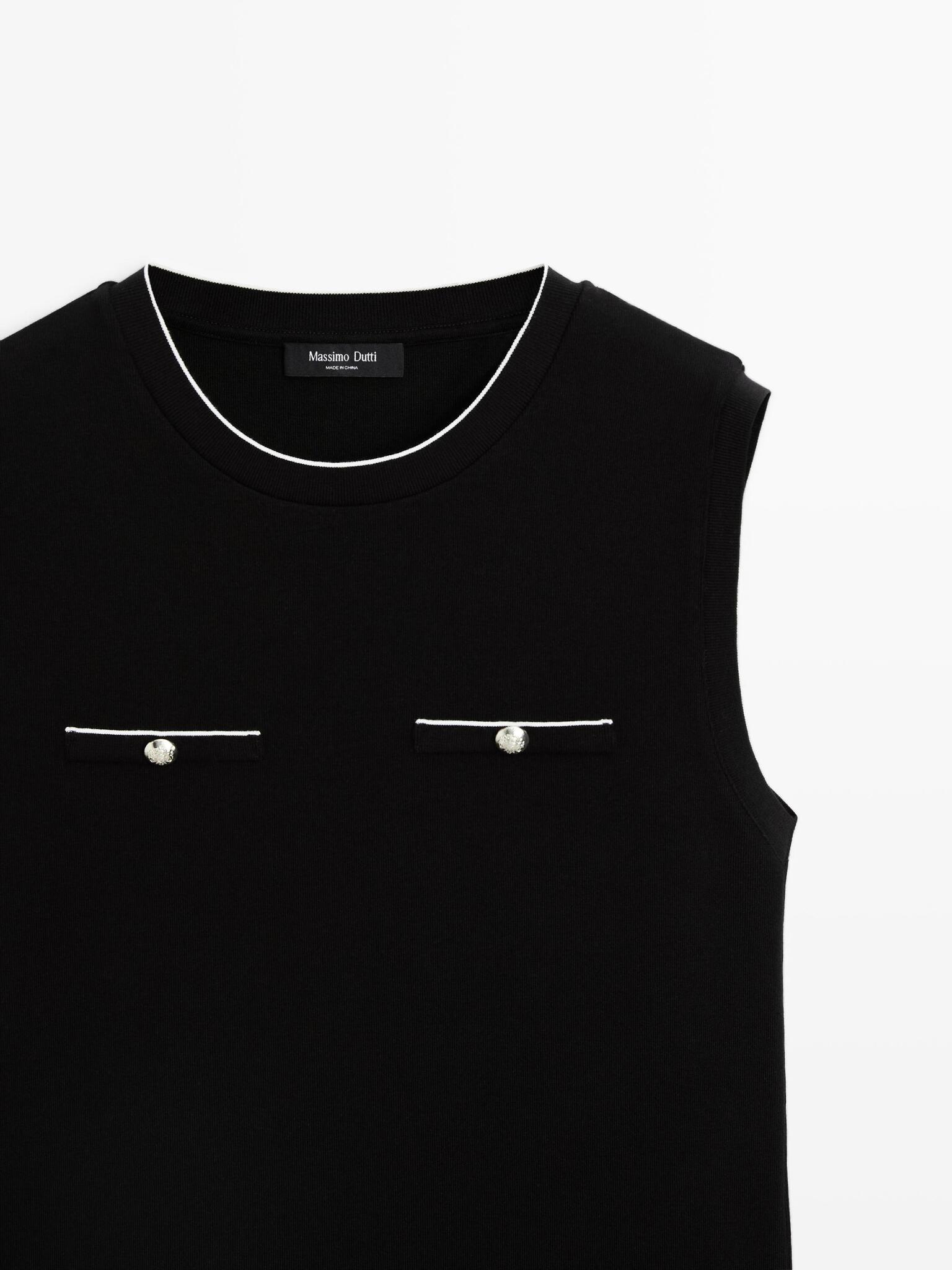 Без рукавов. Два декоративных кармана. Изготовлено из слегка эластичной ткани.