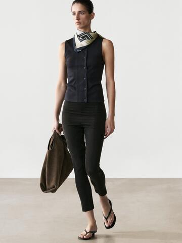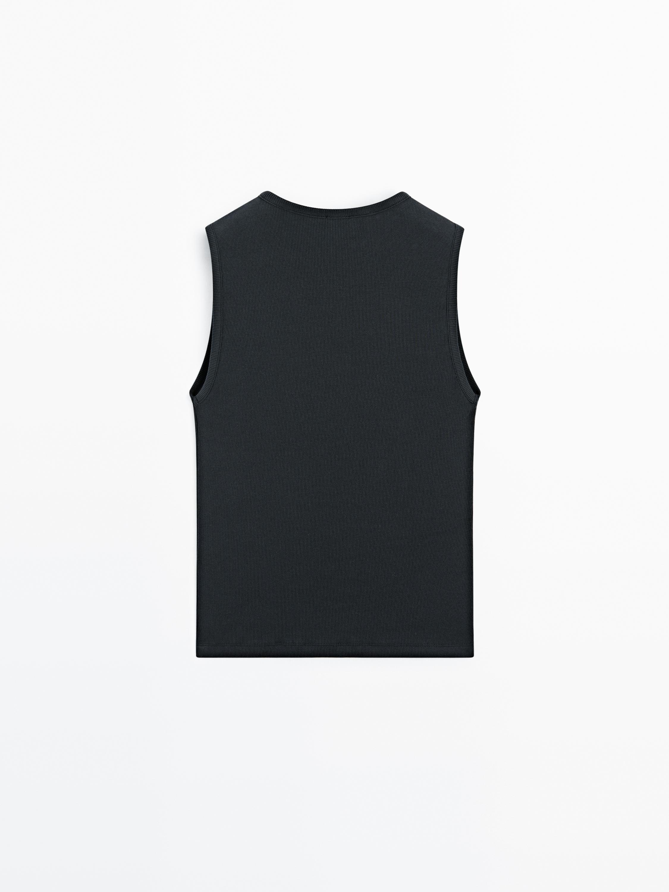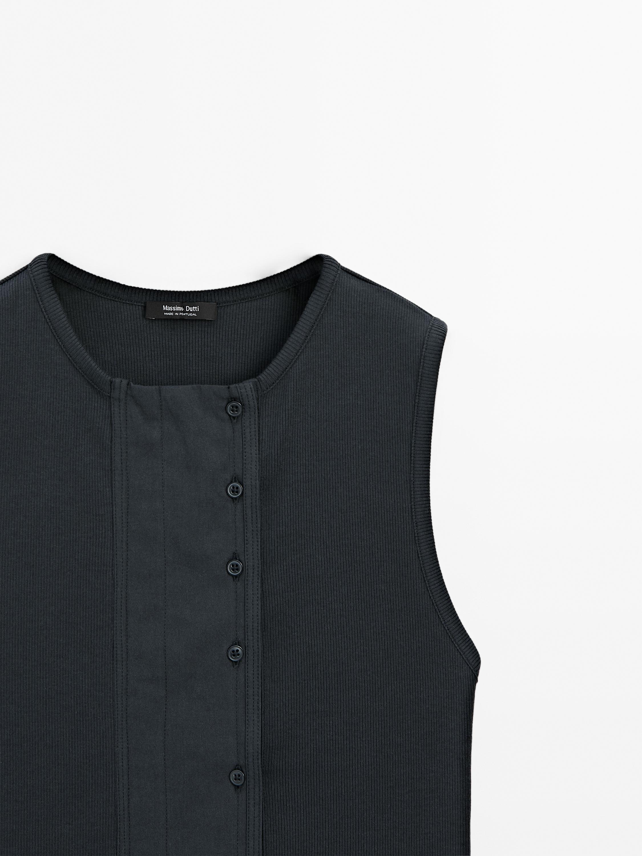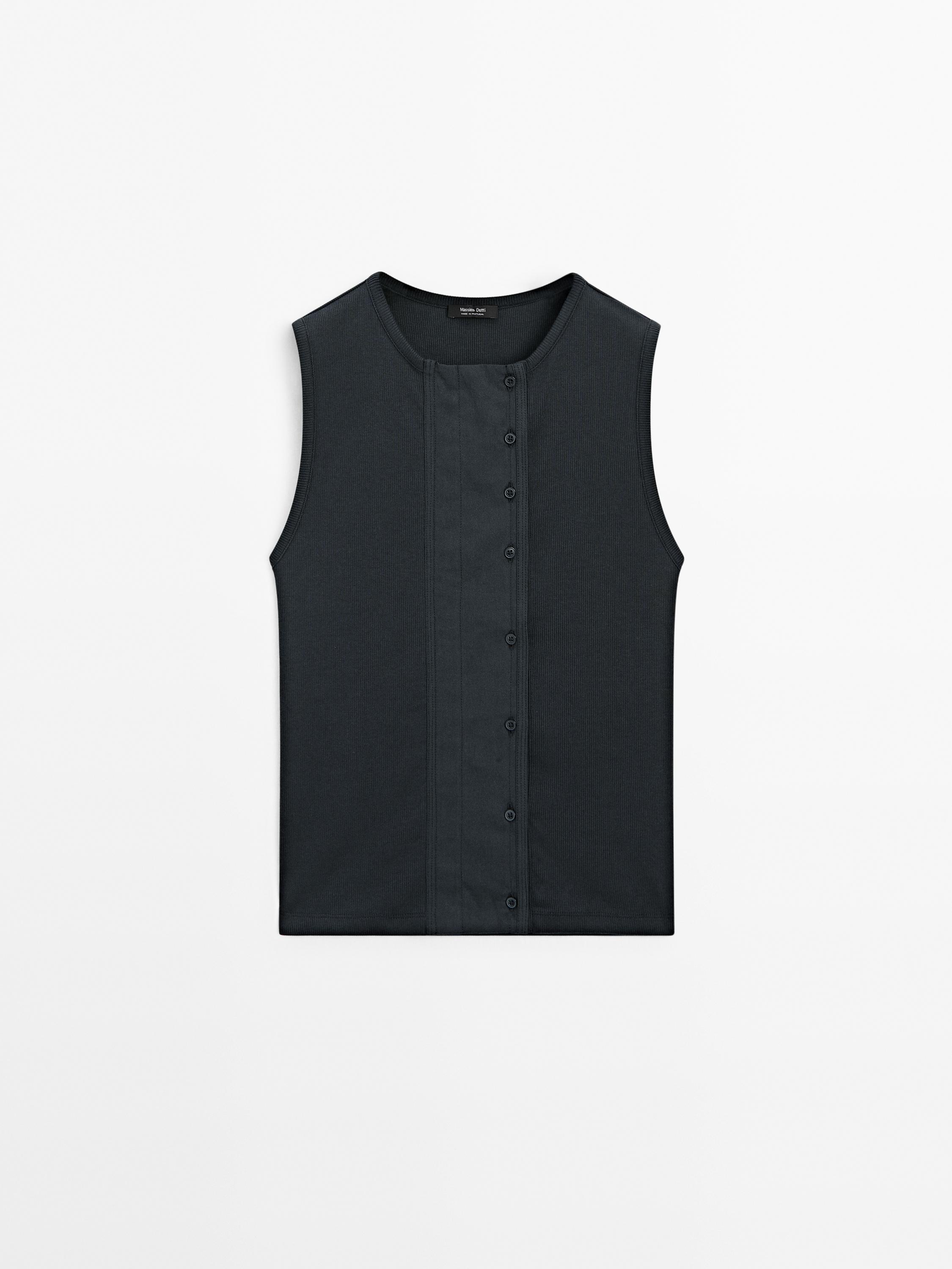 Топ из смесовой хлопковой ткани. Круглый вырез. Без рукавов. Застежка на пуговицы сбоку.