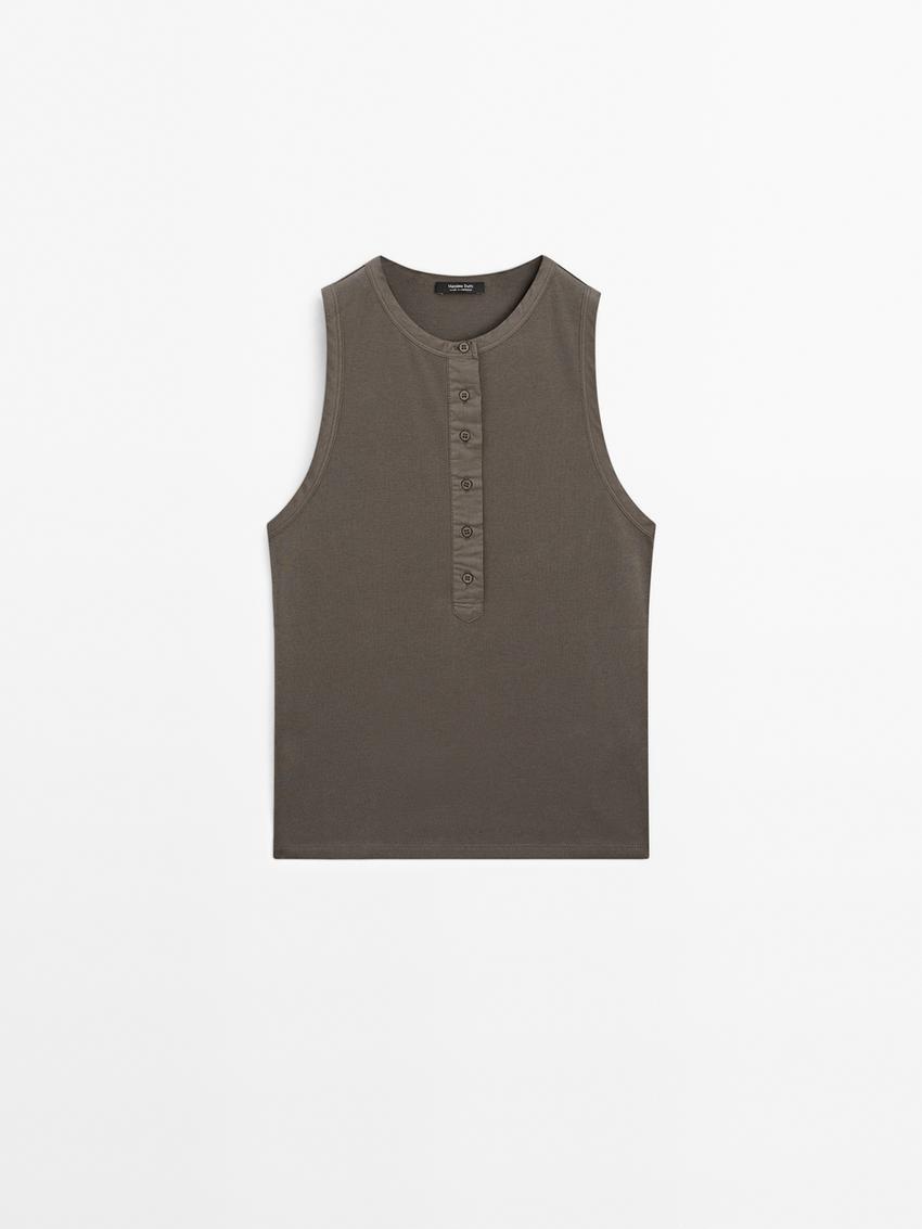 Топ из 100% хлопка. Без рукавов. Круглый вырез с застежкой на пуговицы.