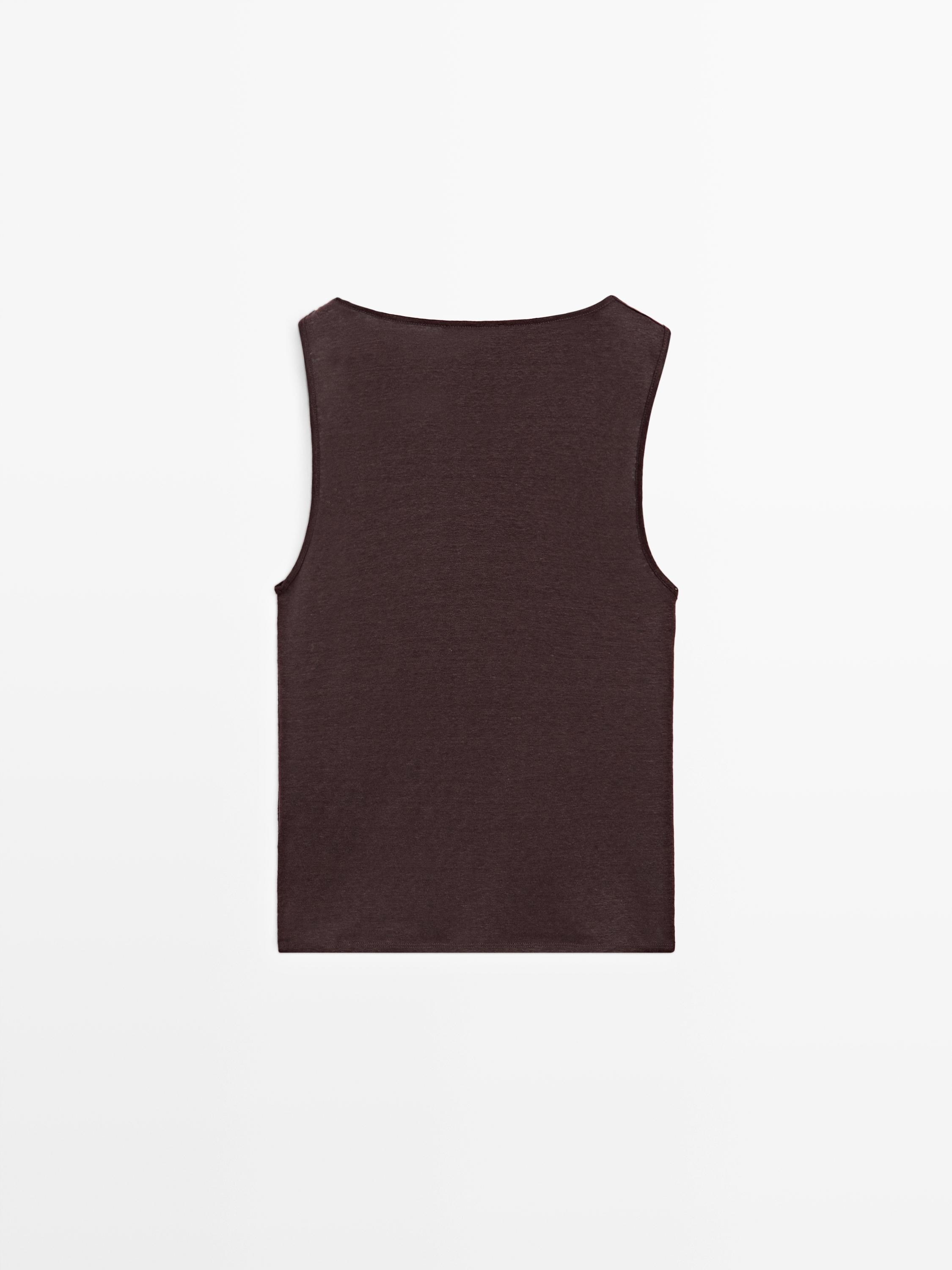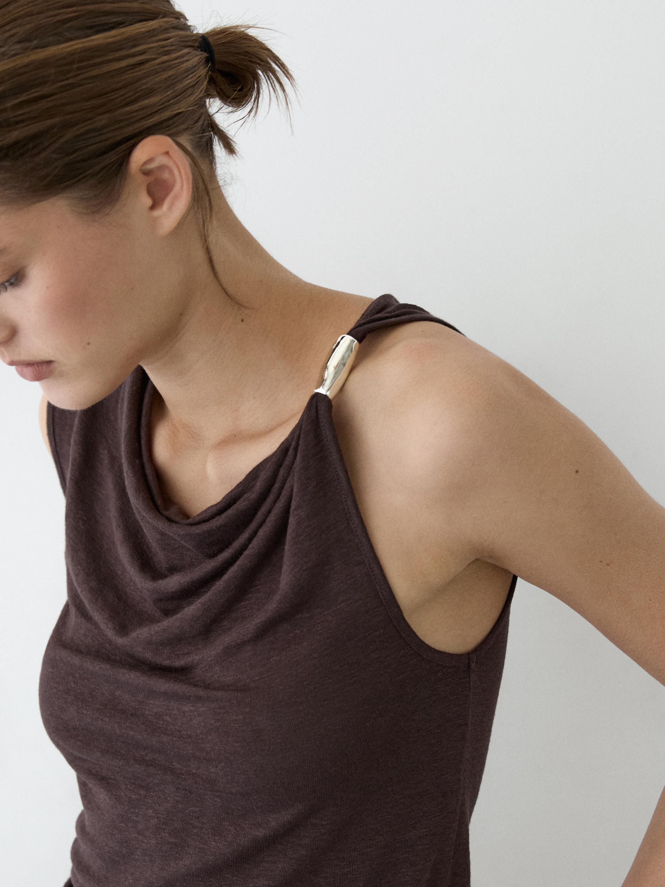 Топ из смесовой льняной ткани. Драпированный вырез «лодочка». Без рукавов. Блестящий декор на плече.