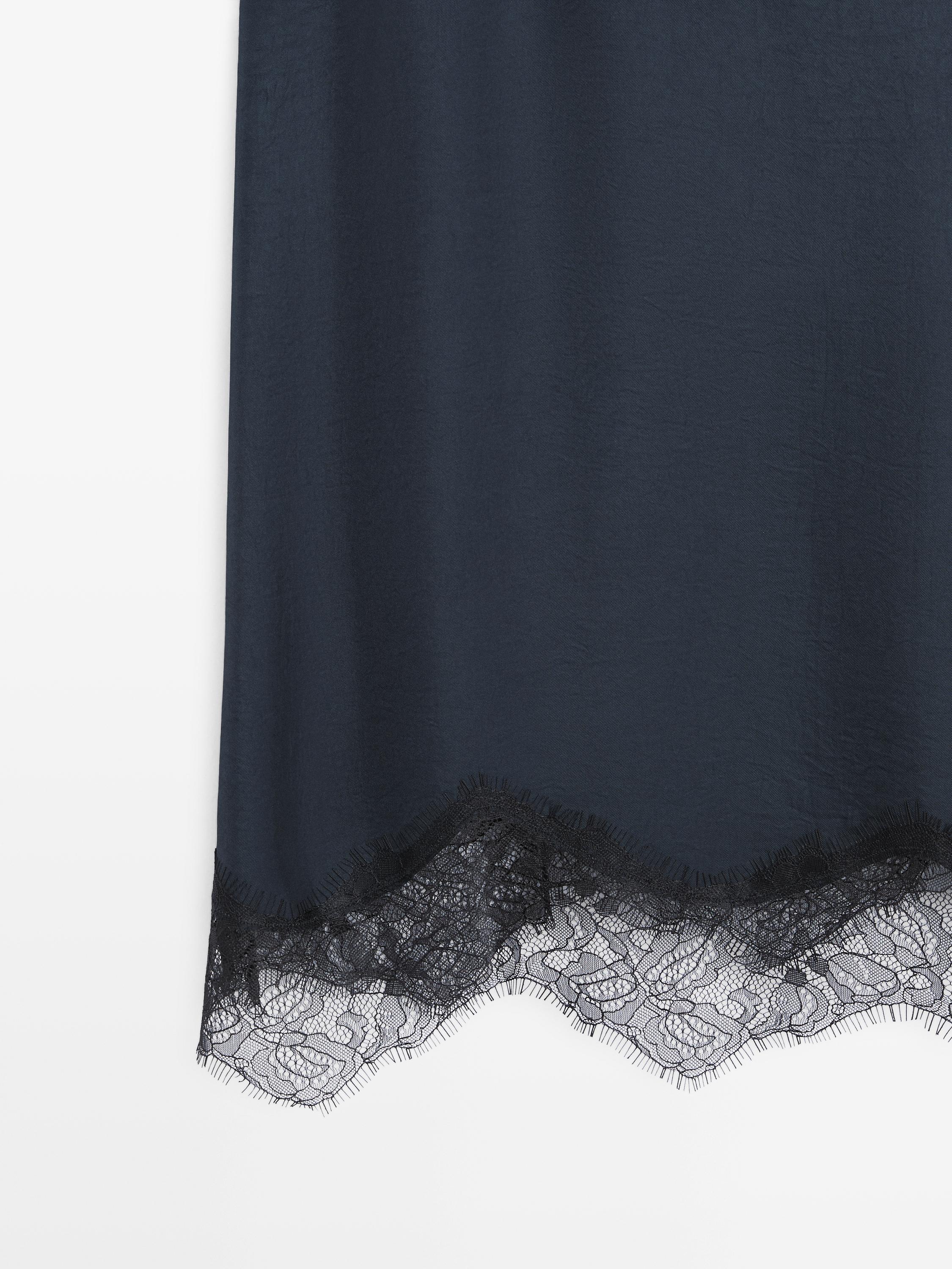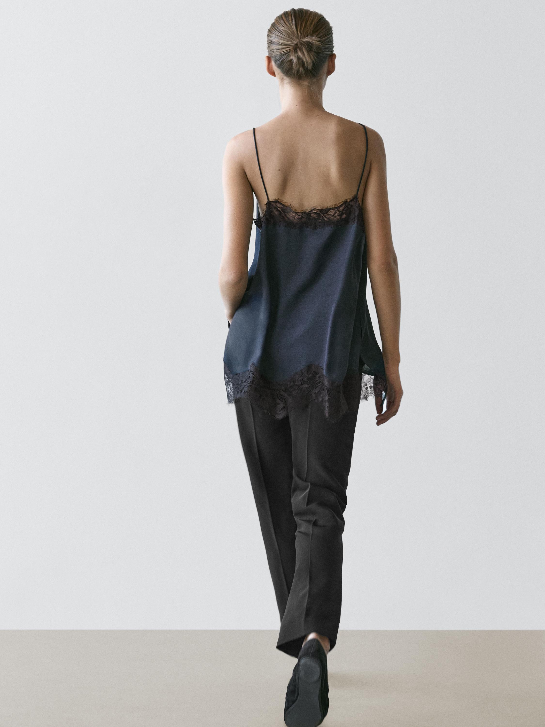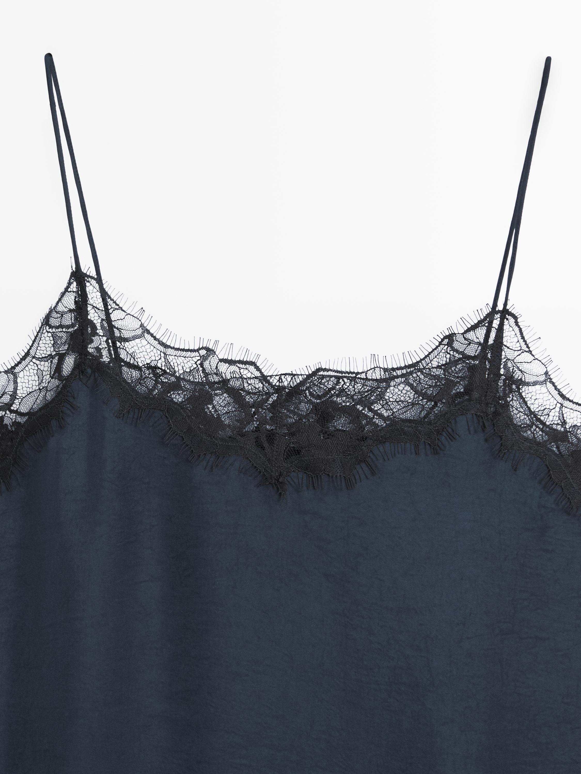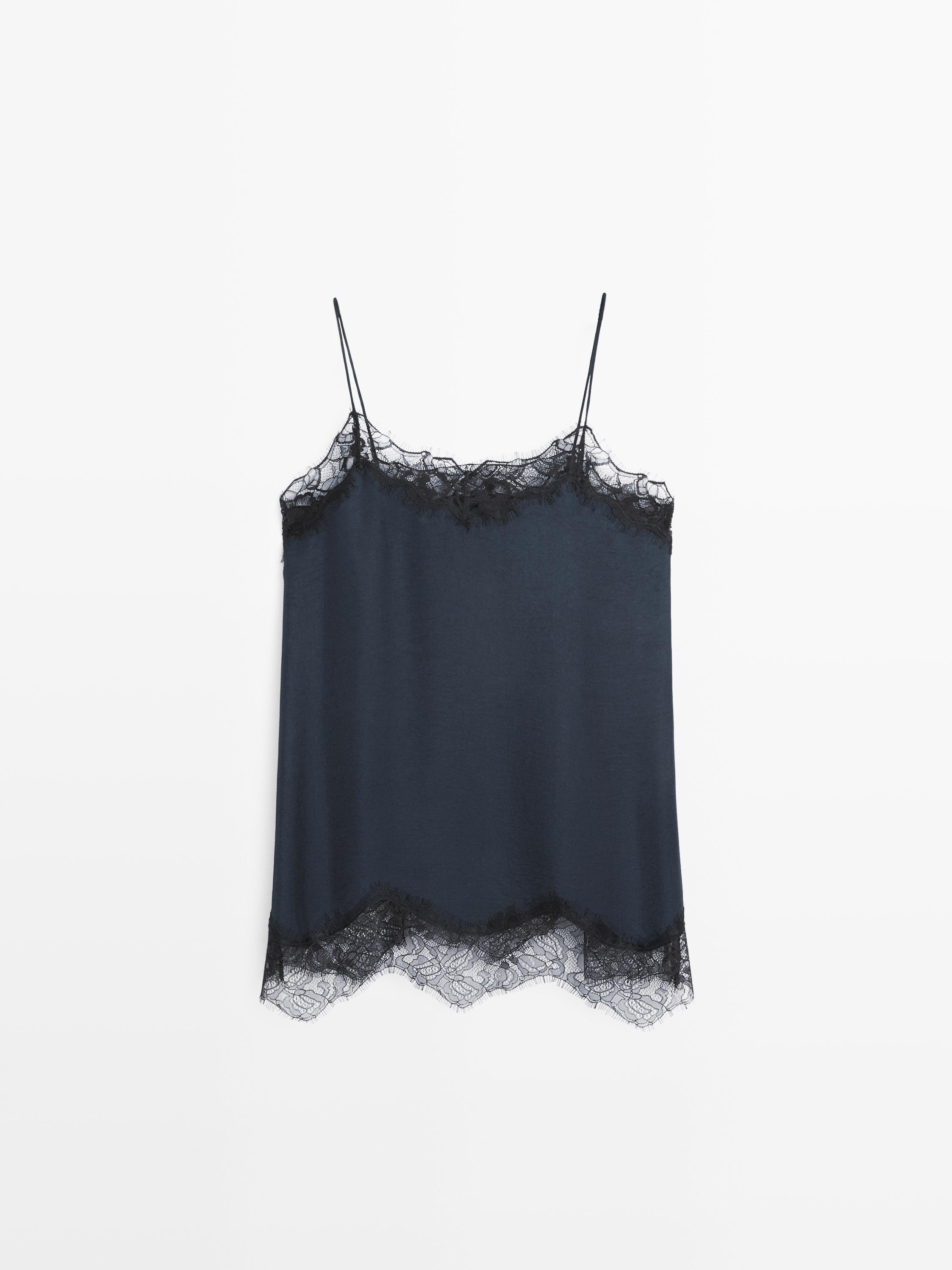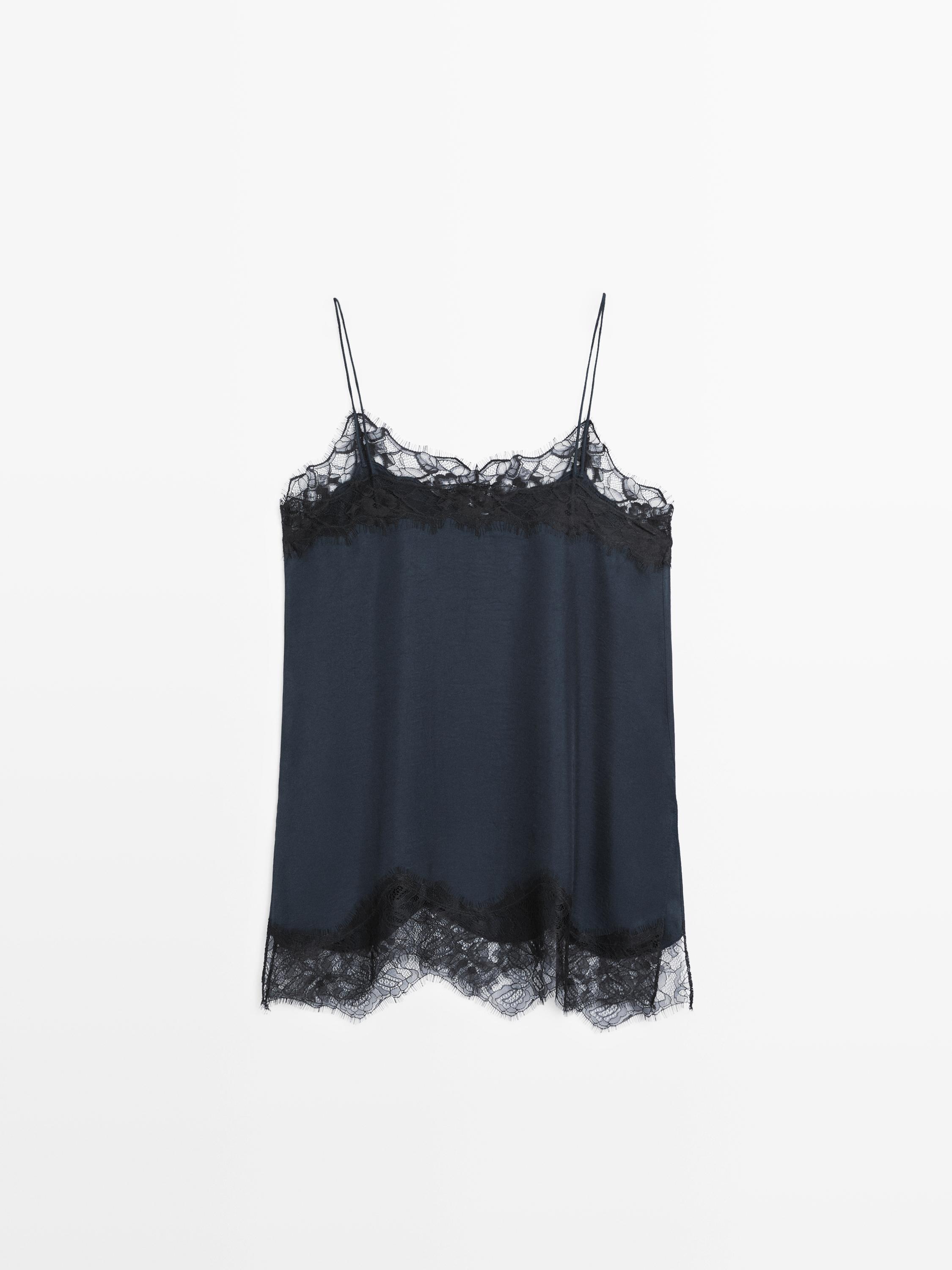 Massimo Dutti Топ в бельевом стиле с контрастной отделкой кружевом, темно-синий