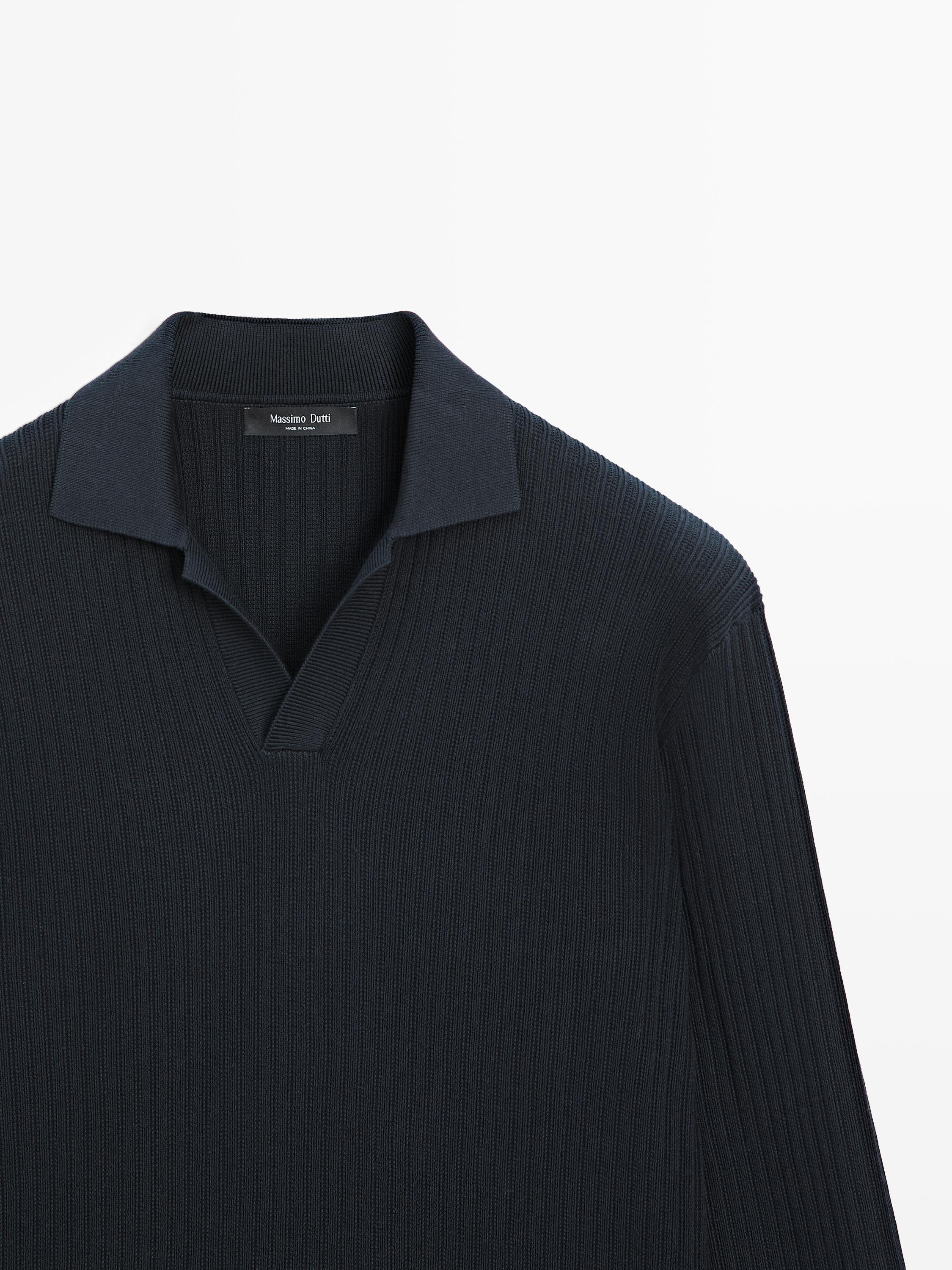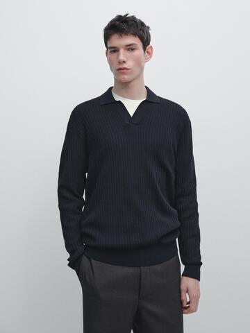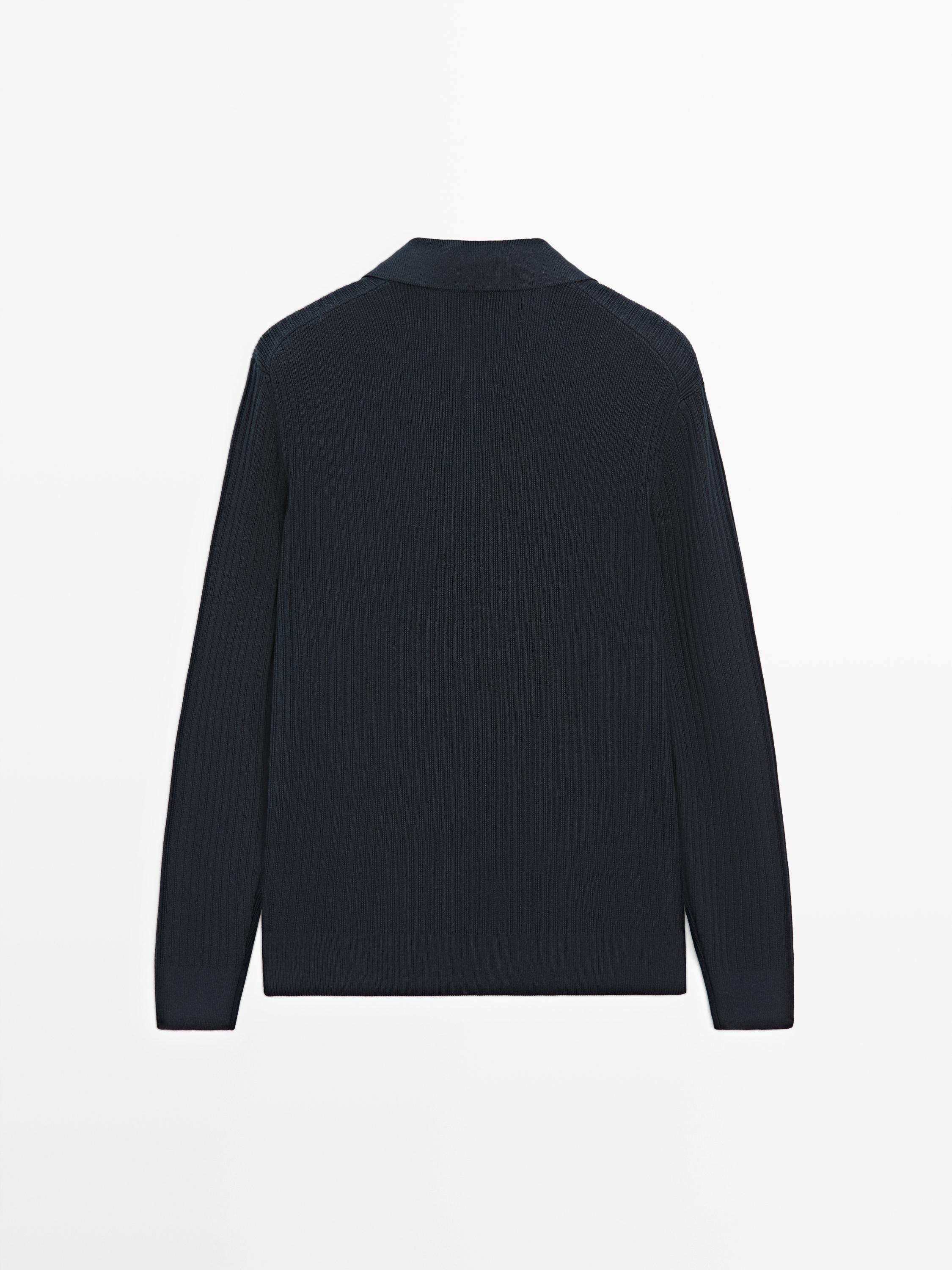 Massimo Dutti Трикотажный свитер из смесового хлопка с воротником-поло, темно-синий