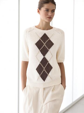 Круглый вырез. Короткие рукава. Ромбовидный узор. Детали в рубчик .