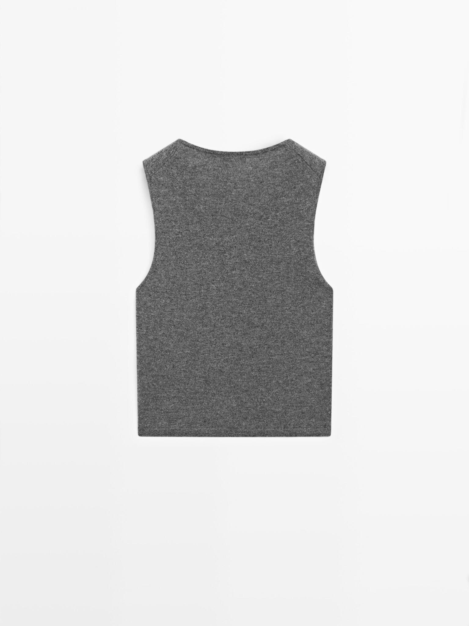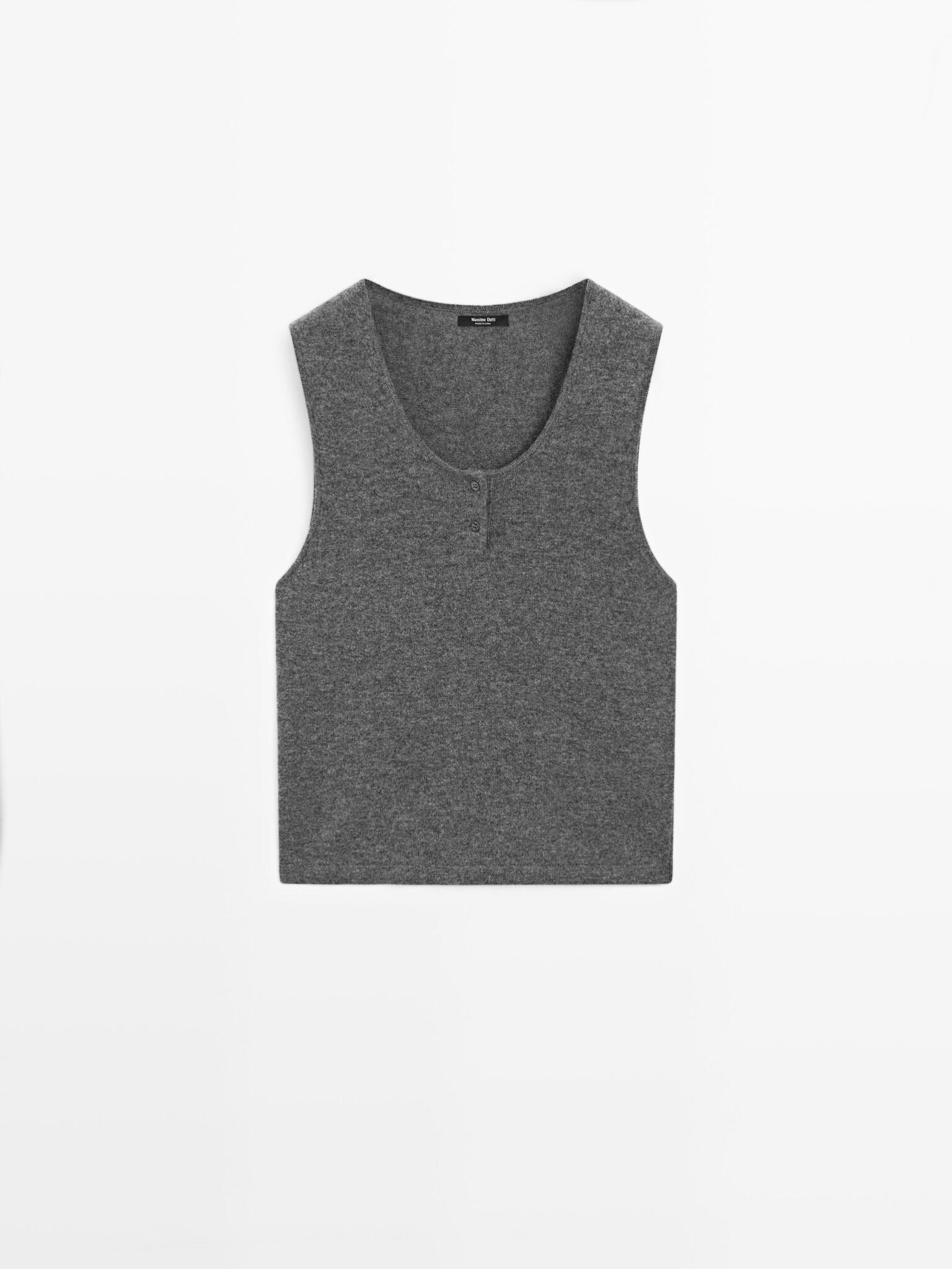 Топ из смесовой шерсти . Круглый вырез. Без рукавов. Пуговица на воротнике.