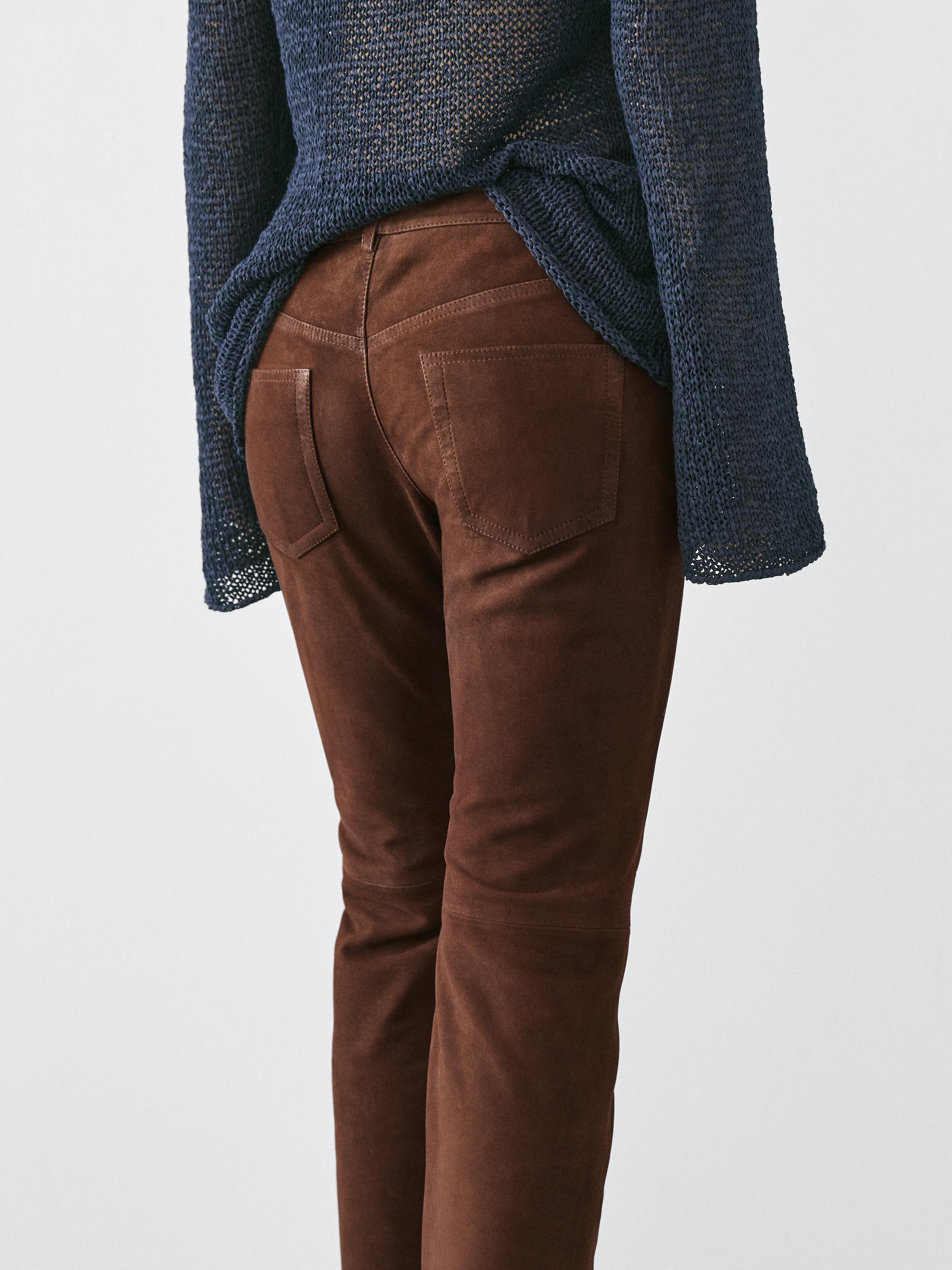 Брюки из козьей кожи с замшевой отделкой. Пояс с петлями для ремня. Застежка на шнурке. Два боковых кармана. Два накладных кармана сзади.