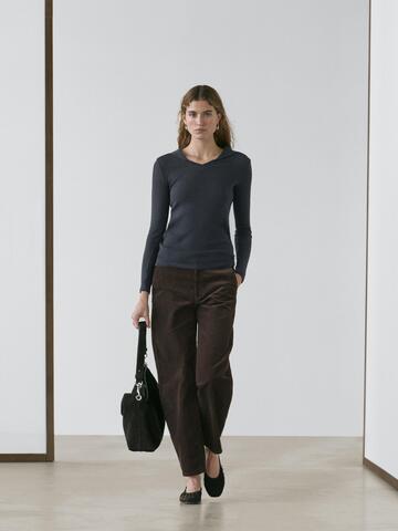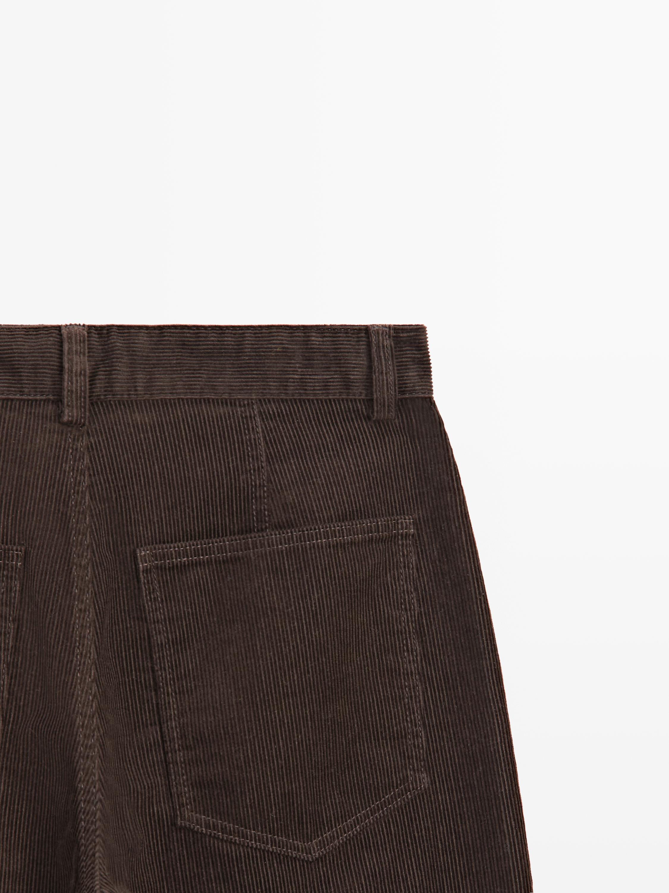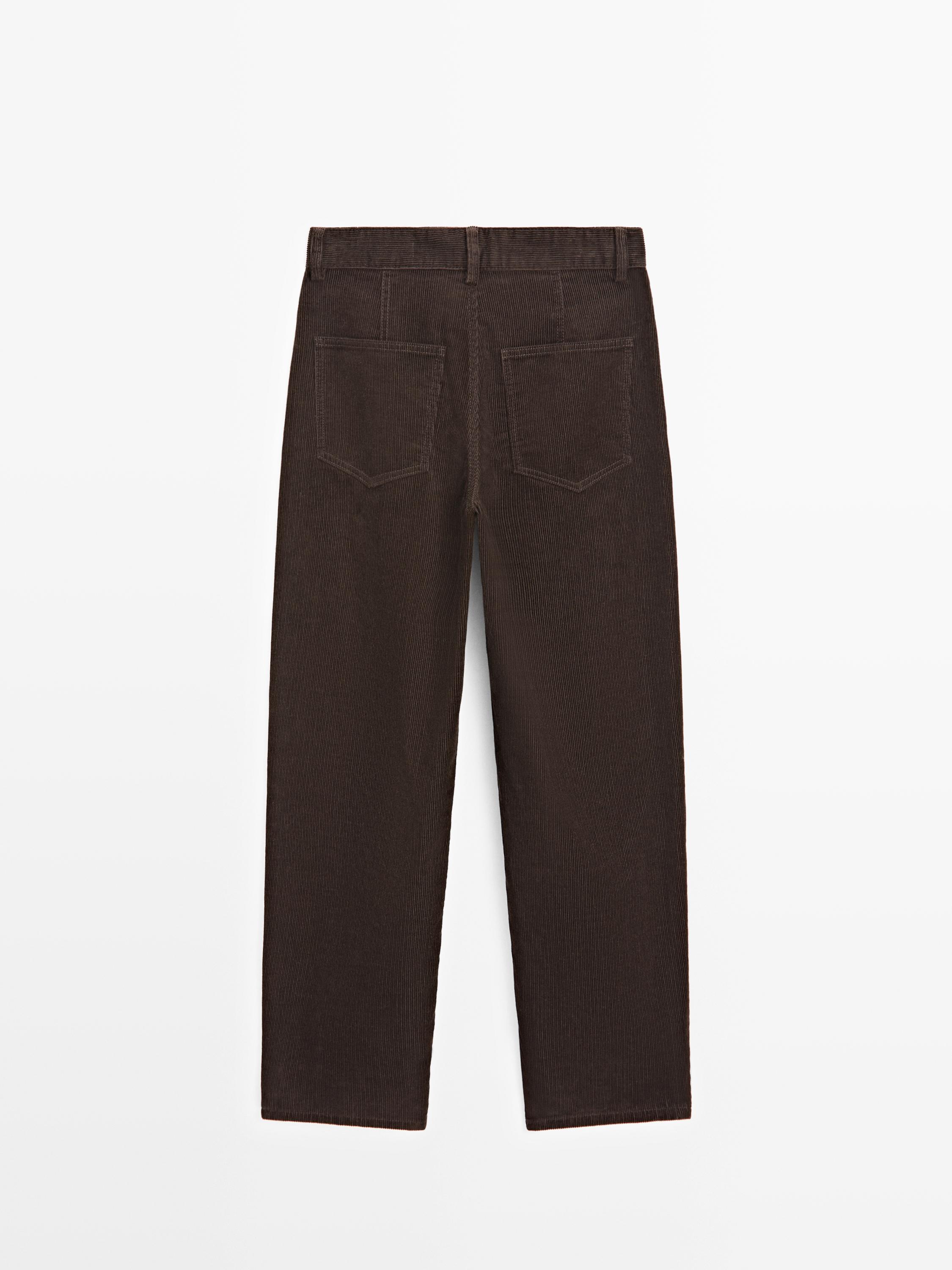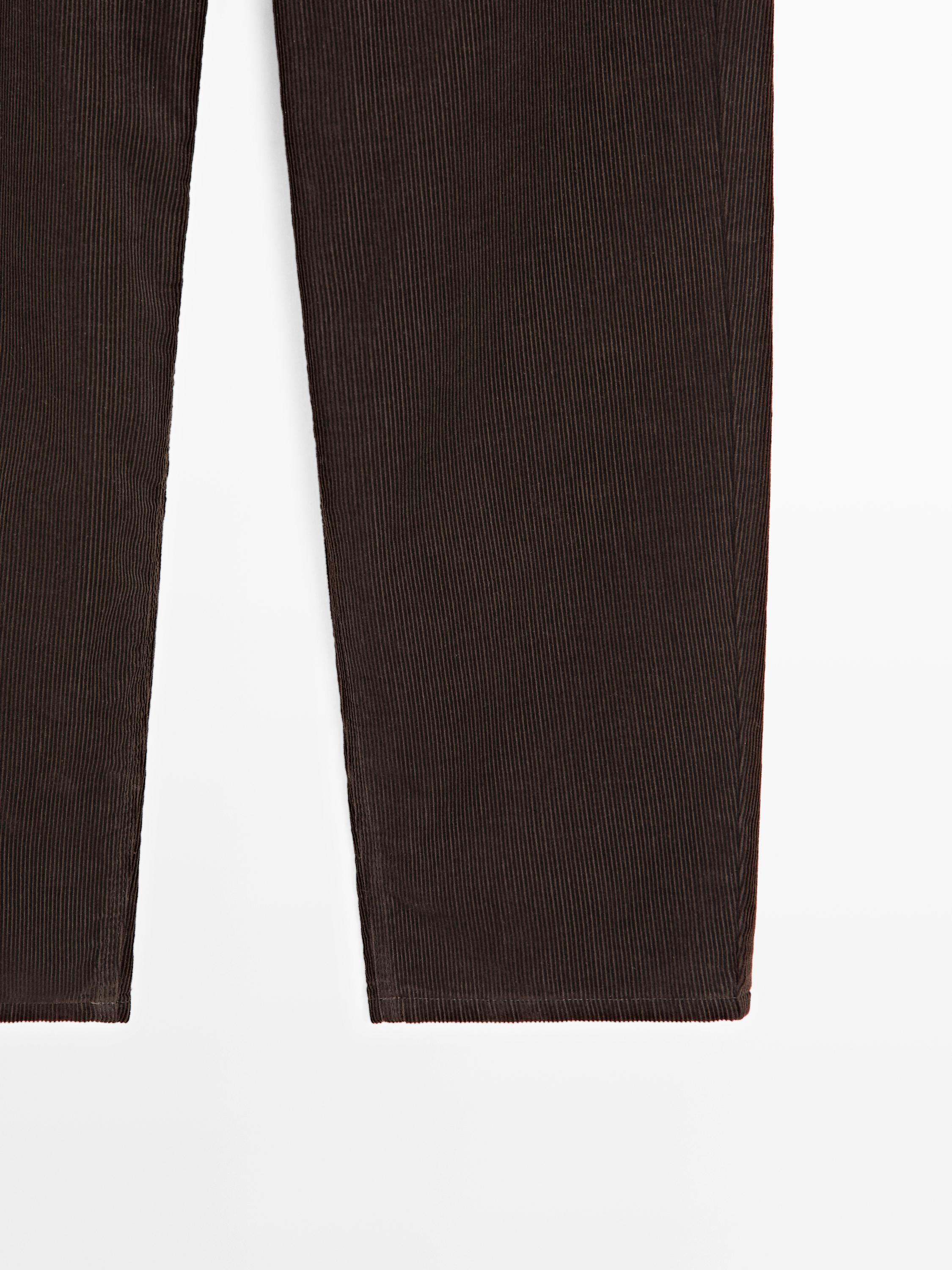 Брюки прямого кроя: этот крой отличается более широкой формой в бедрах и более узкими штанинами у щиколотки, обеспечивая баланс комфорта и стиля. Идеально подходят для тех, кто ищет промежуточный вариант между облегающим и стандартным кроем. Застежка на молнию спереди и пуговицу сверху. Два боковых кармана. Ткань с эффектом вельвета.