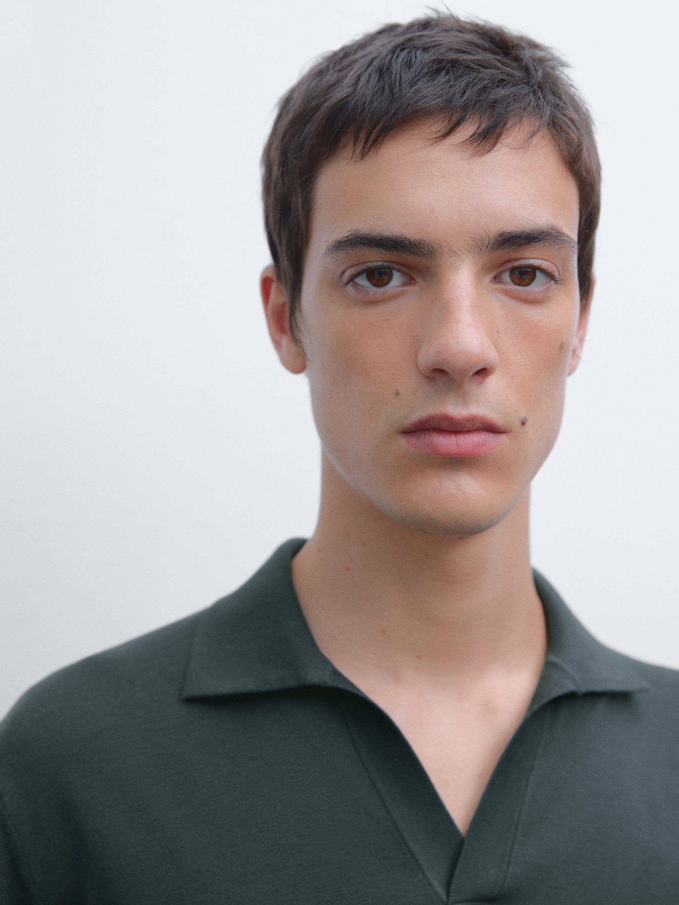 Поло из смесовой хлопковой ткани. V-образный вырез. Короткие рукава. Тонкий трикотаж.