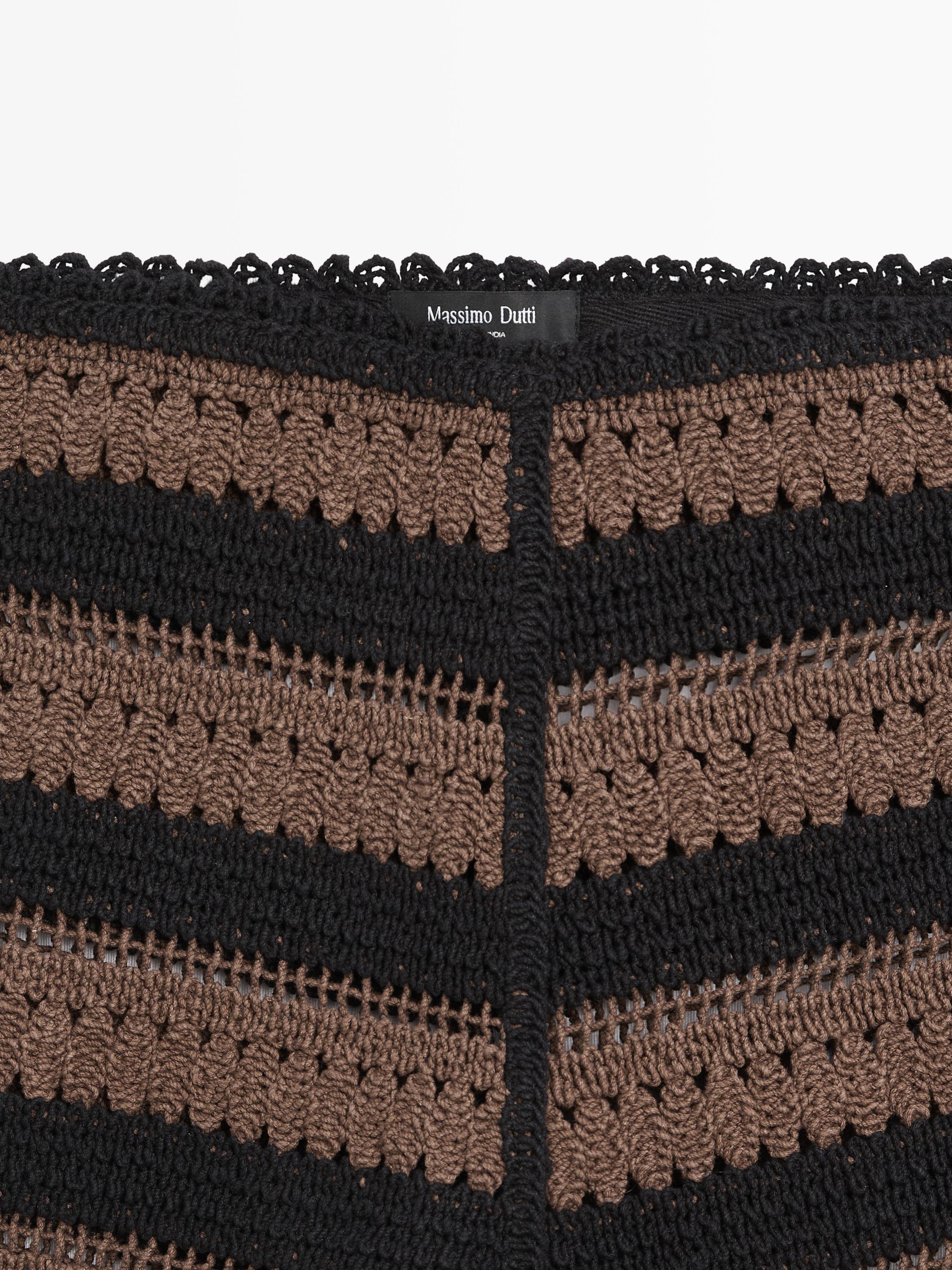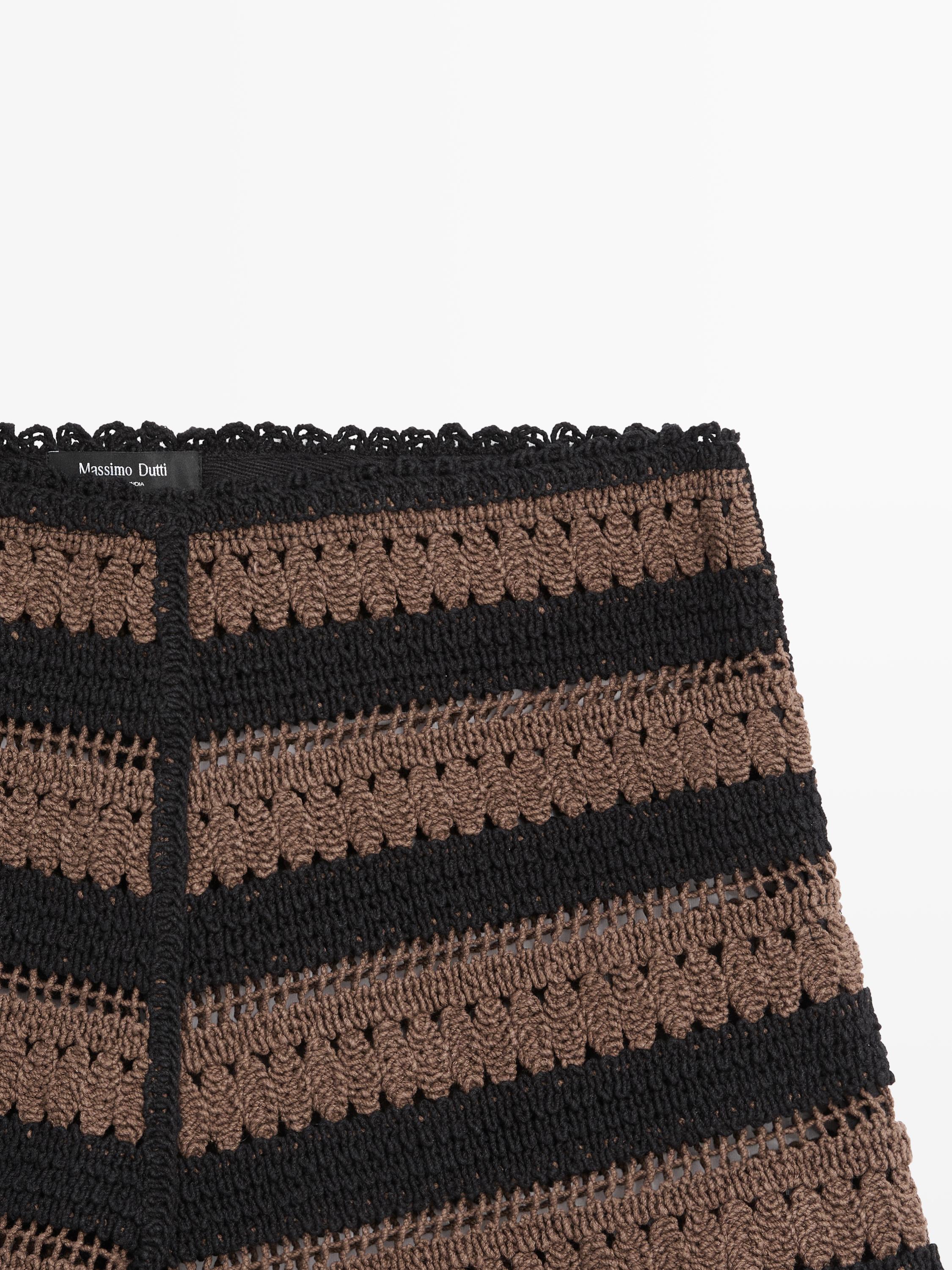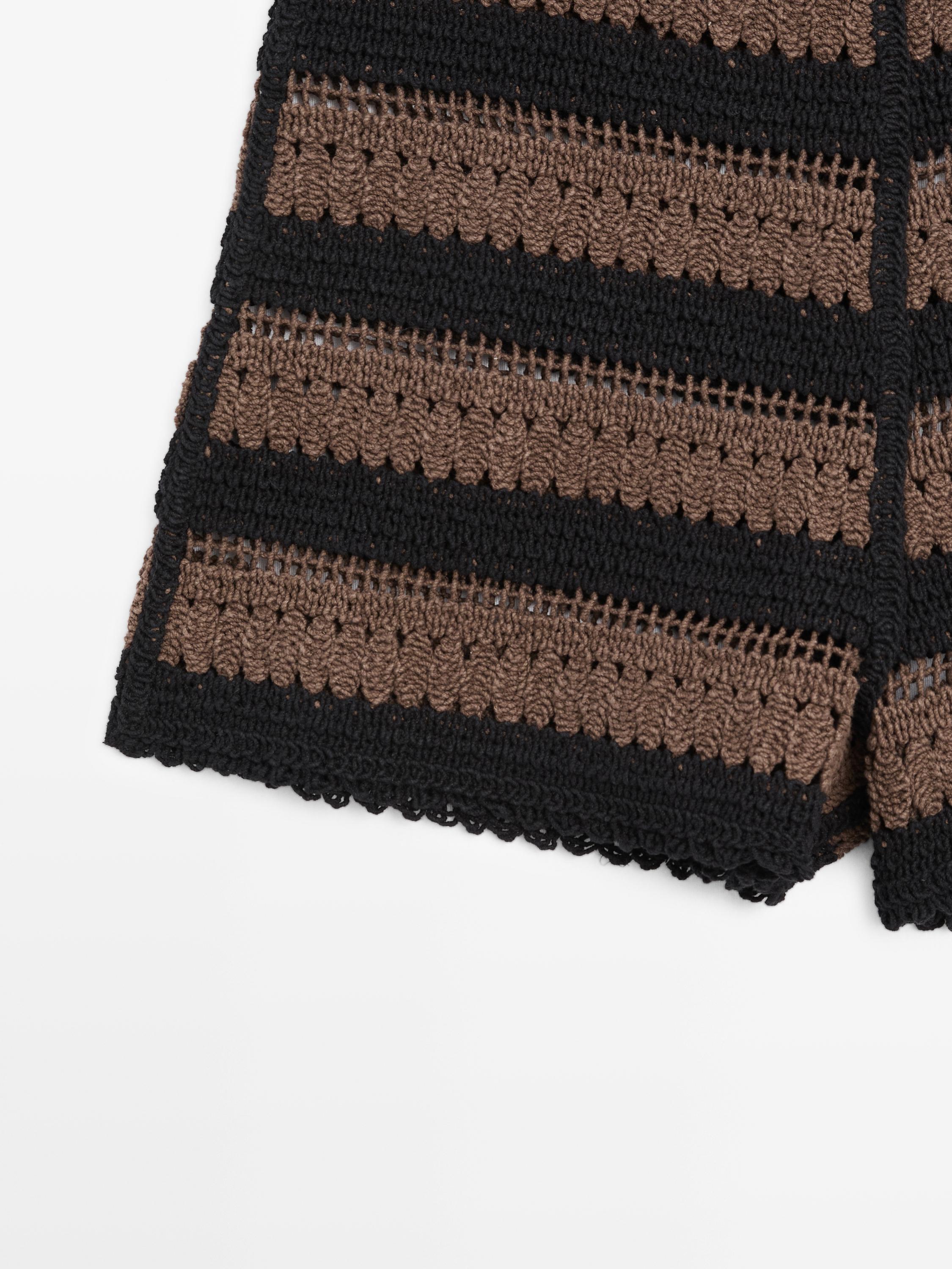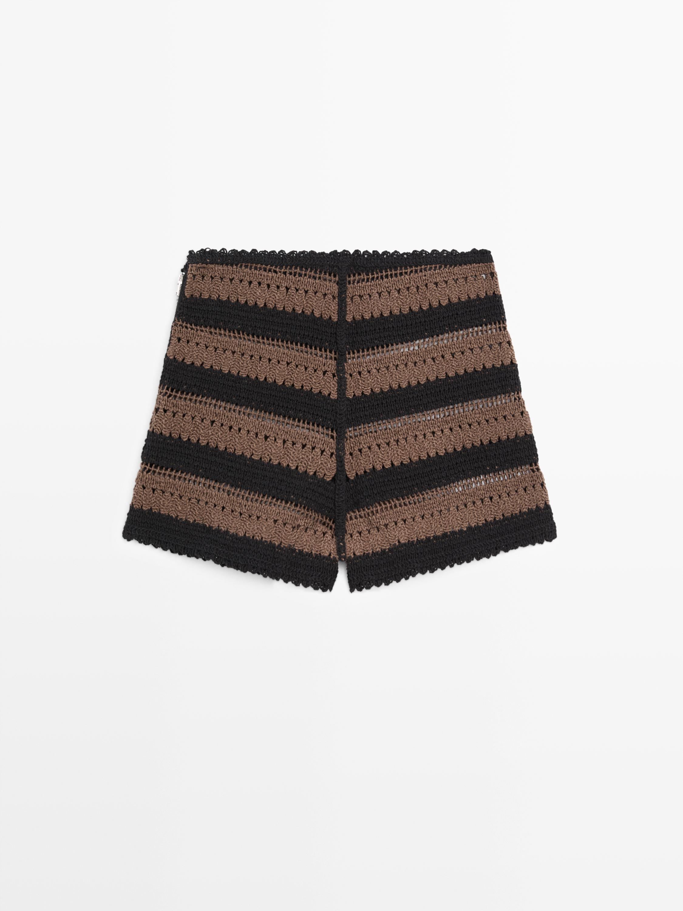 Вязаные крючком шорты из 100% хлопка. Застежка на молнию сбоку. Полосатый принт. Ажурная ткань.