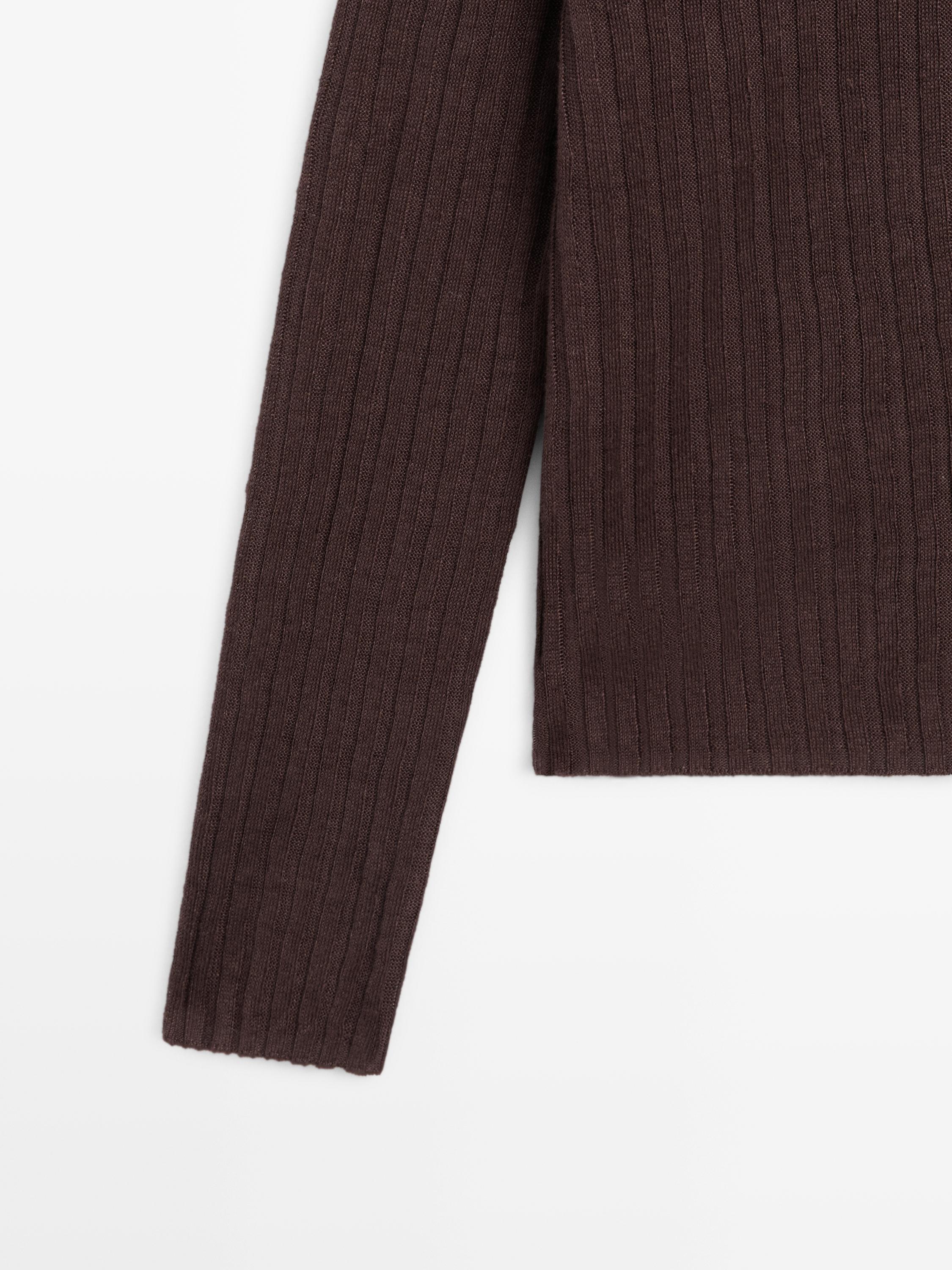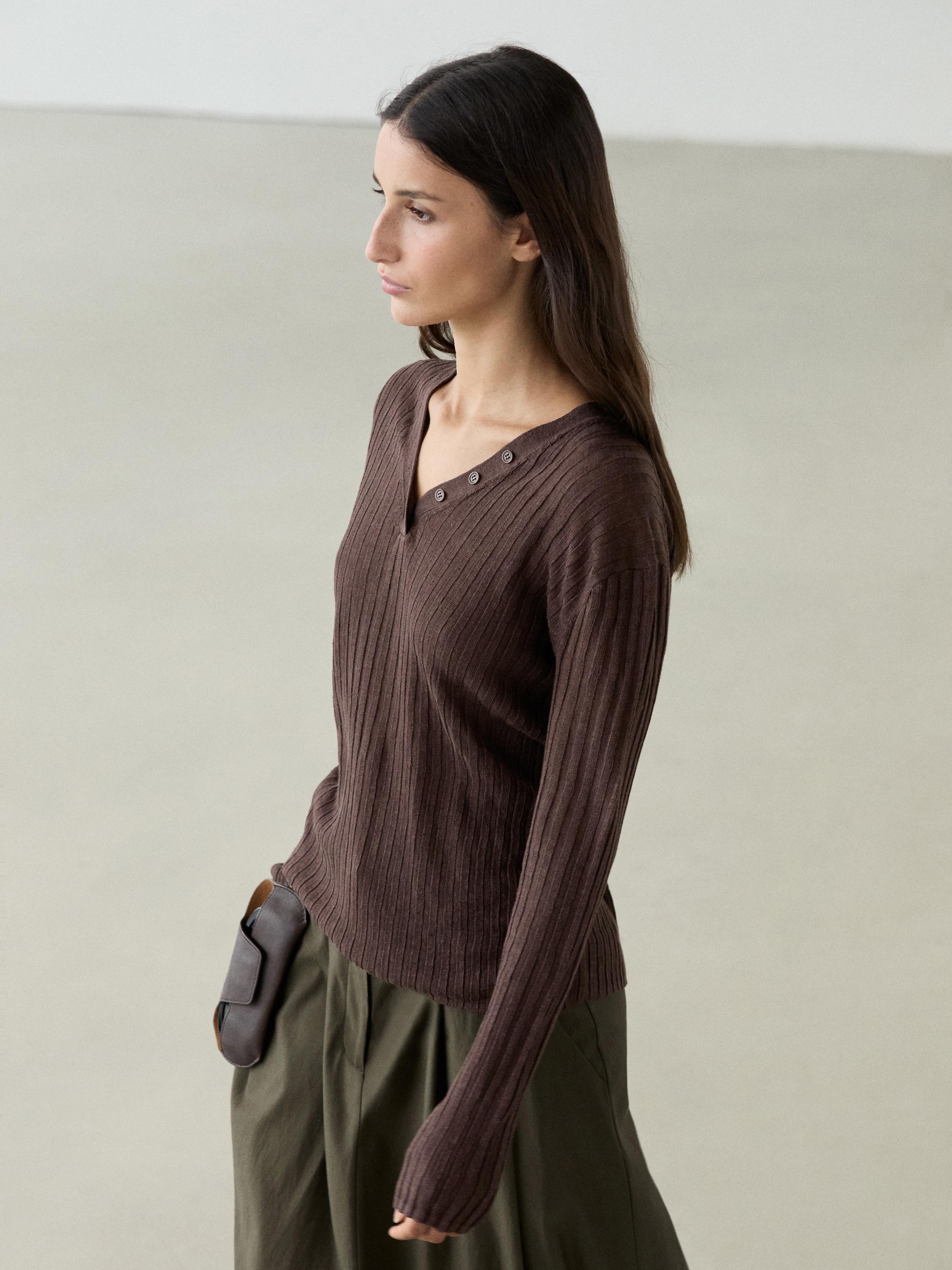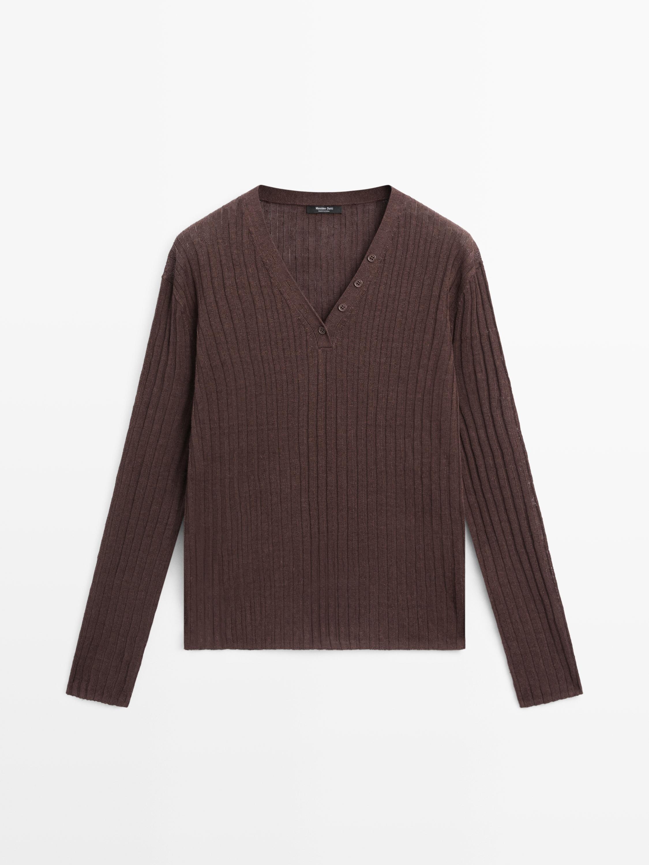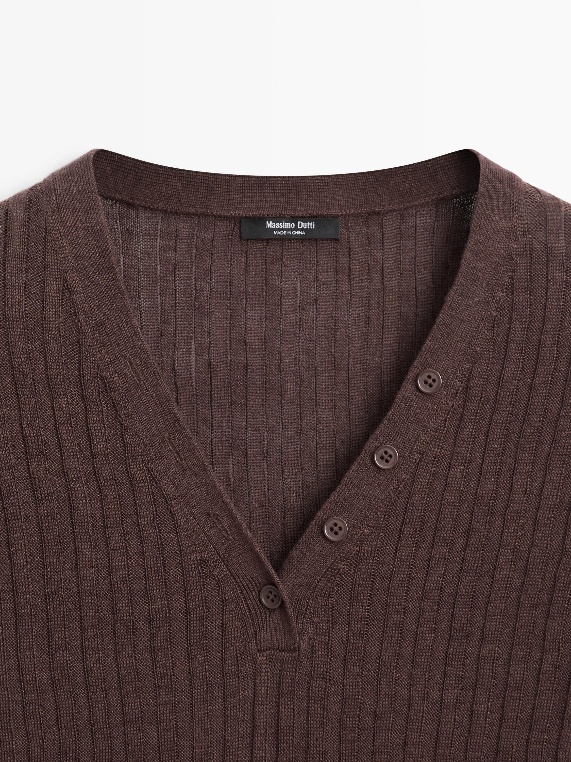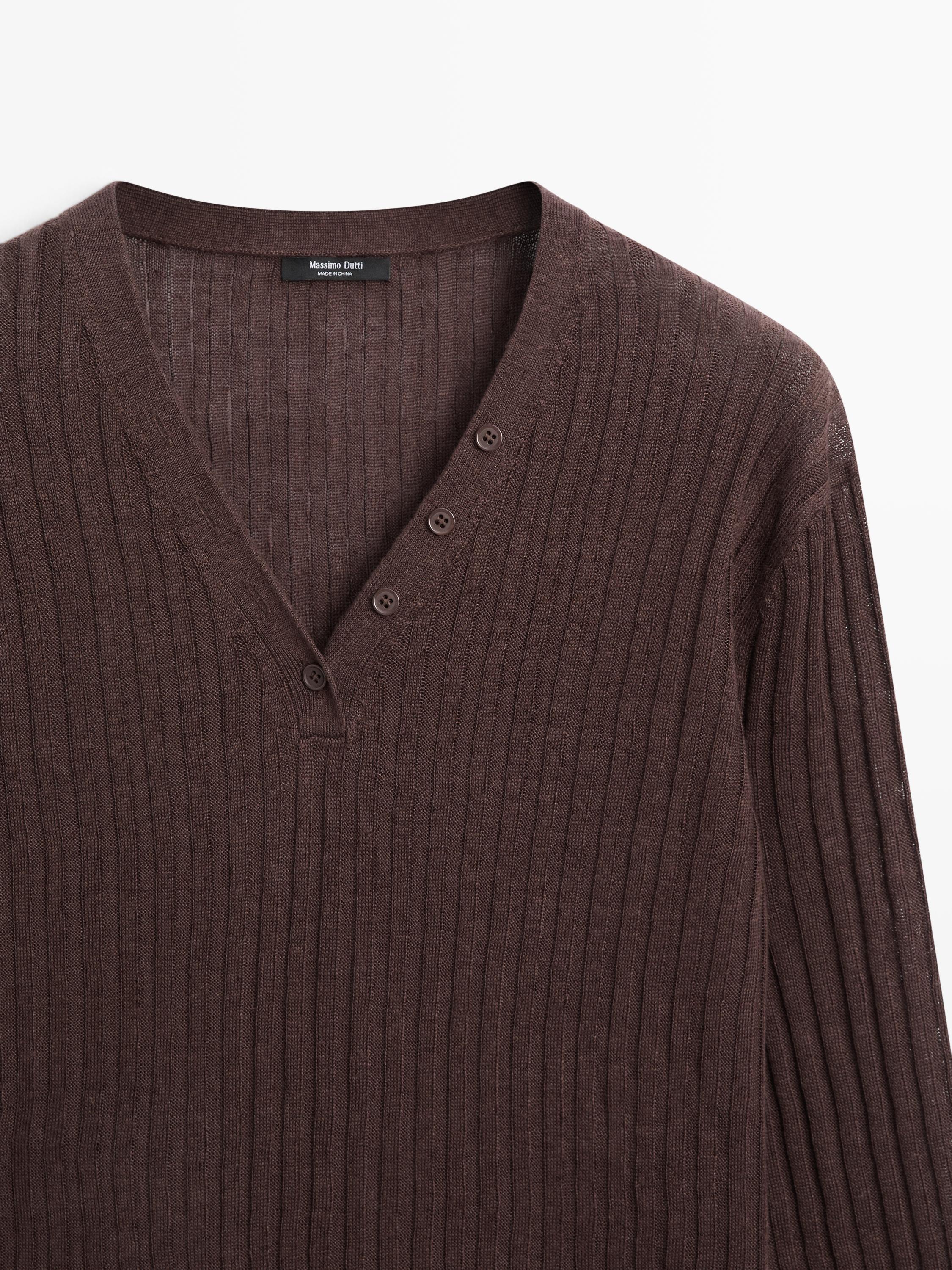 Massimo Dutti Вязаный льняной свитер с пуговицами, шоколадный