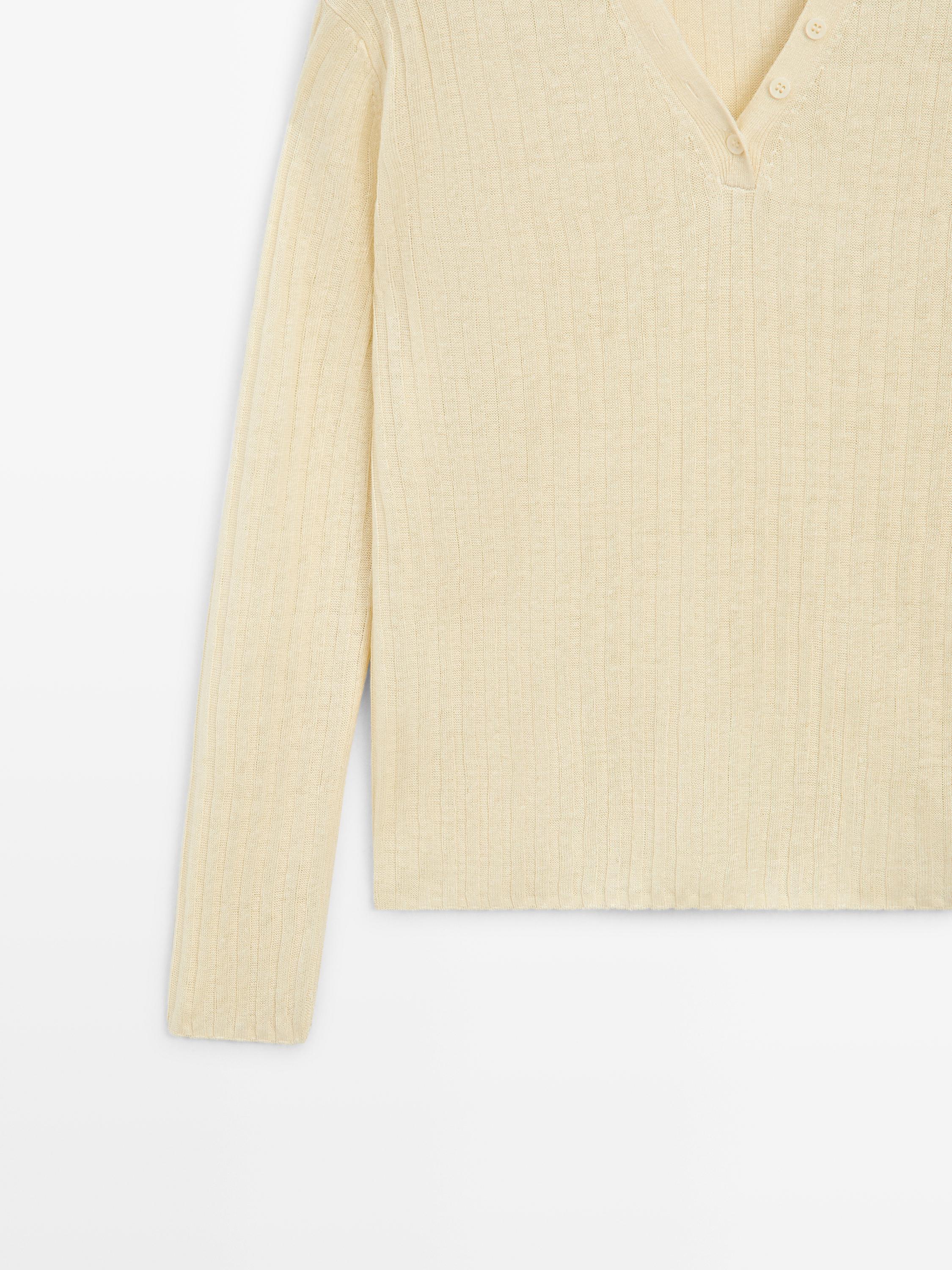 Вязаный свитер из льна. V-образный вырез. Длинные рукава. Воротник застегивается на пуговицы.
