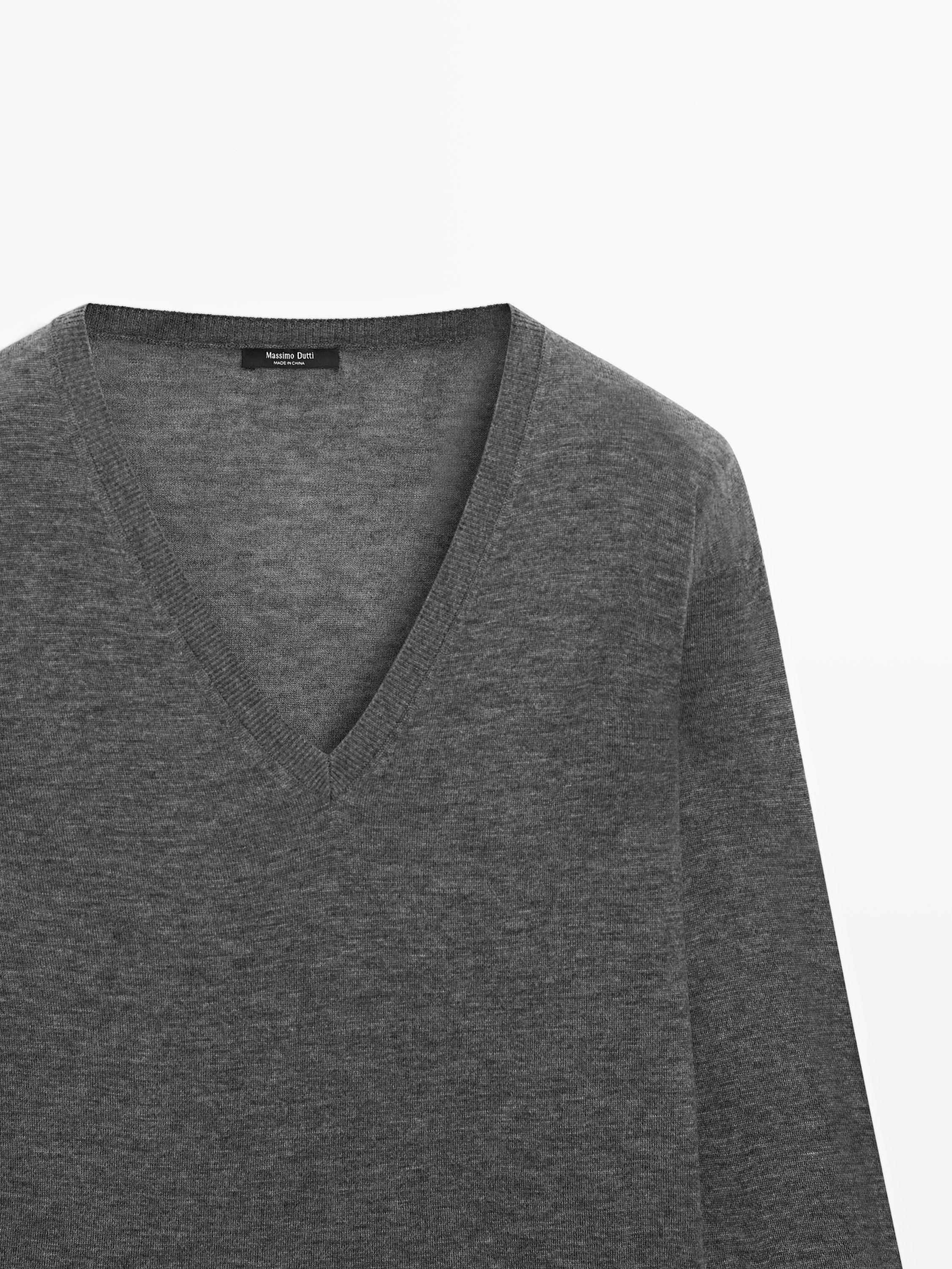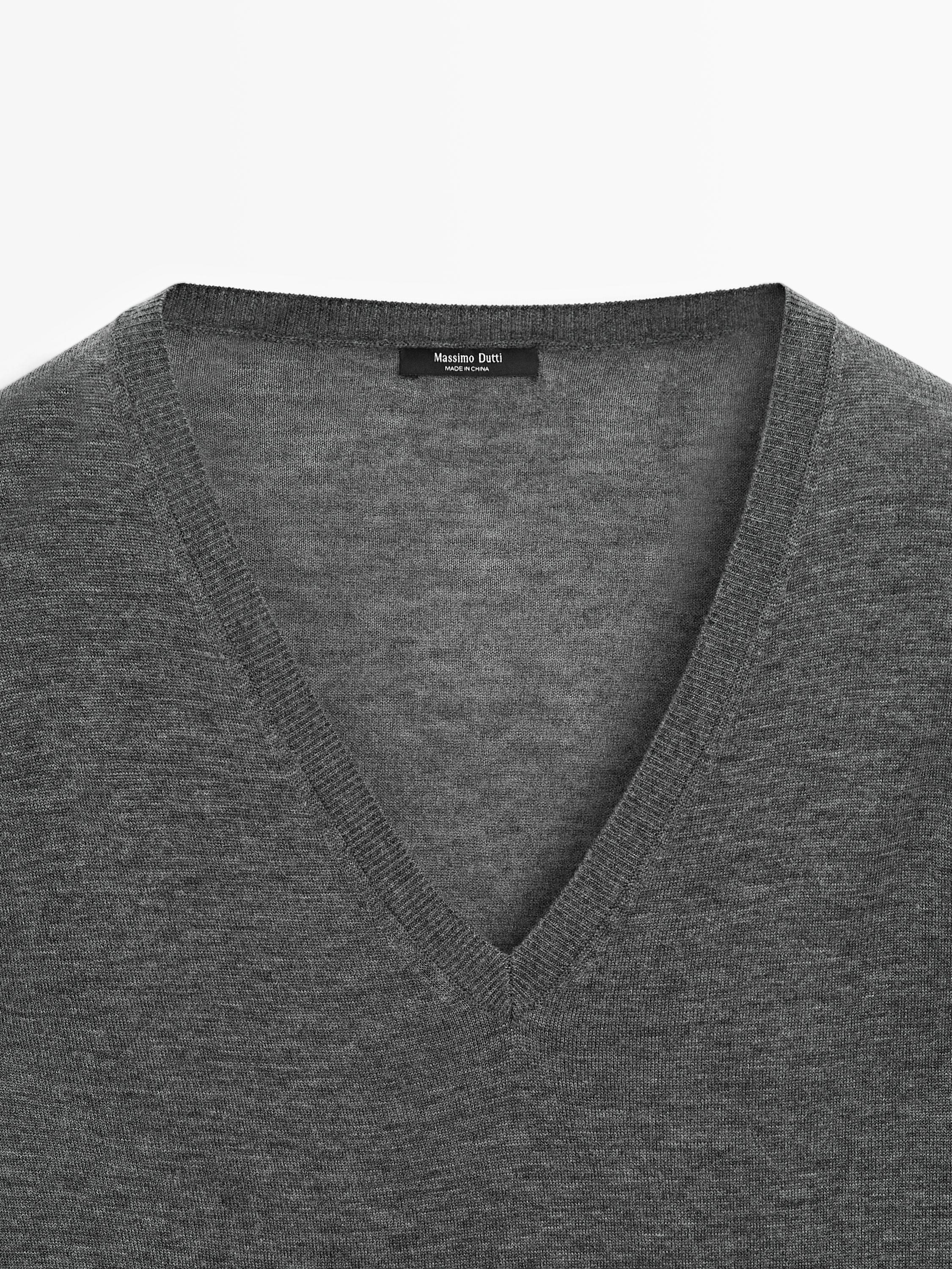 Свитер из смеси шелка и шерсти. V-образный вырез. Длинные рукава. Детали в рубчик . Мягкая ткань, приятная на ощупь .