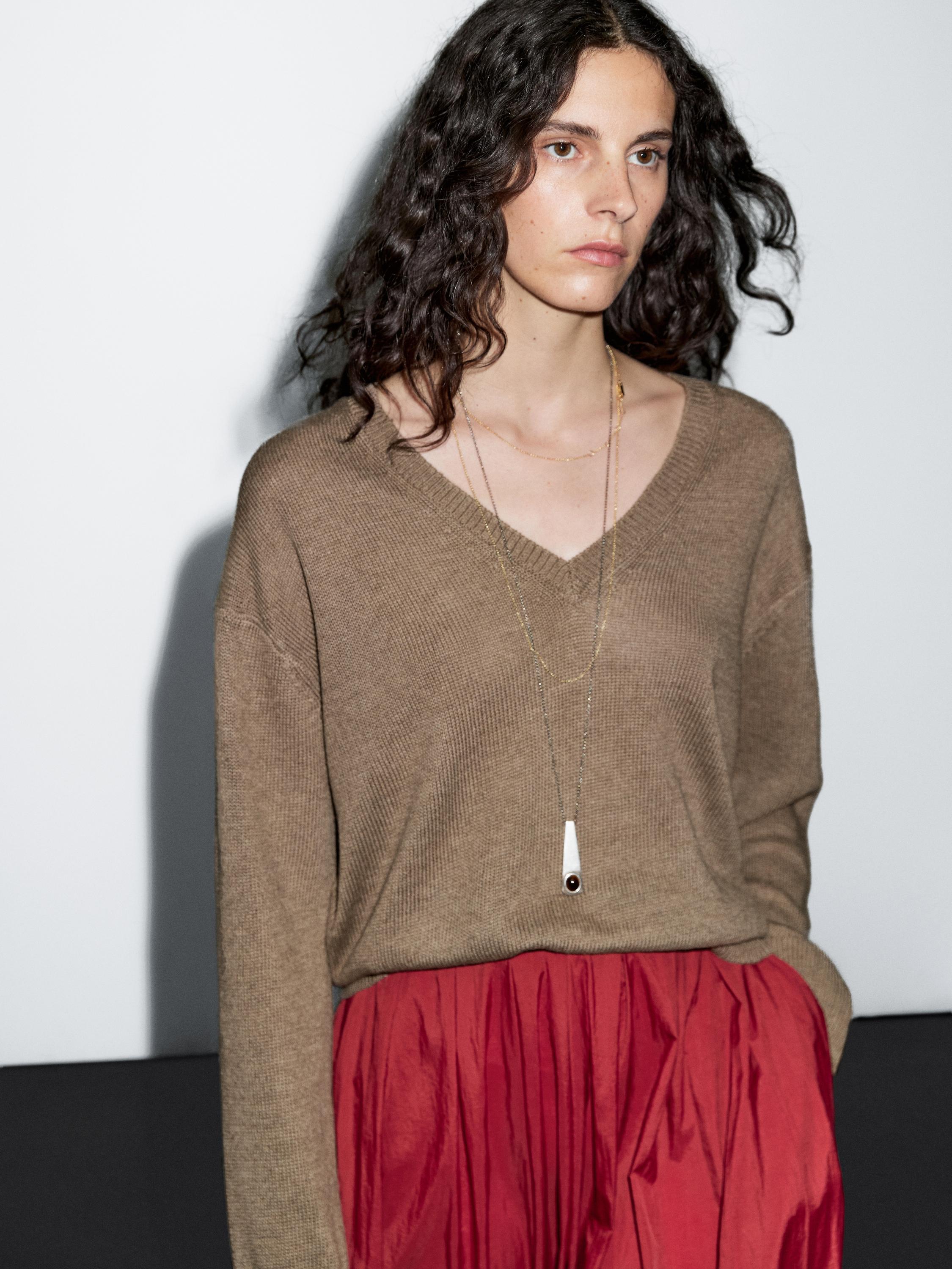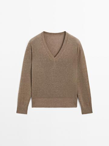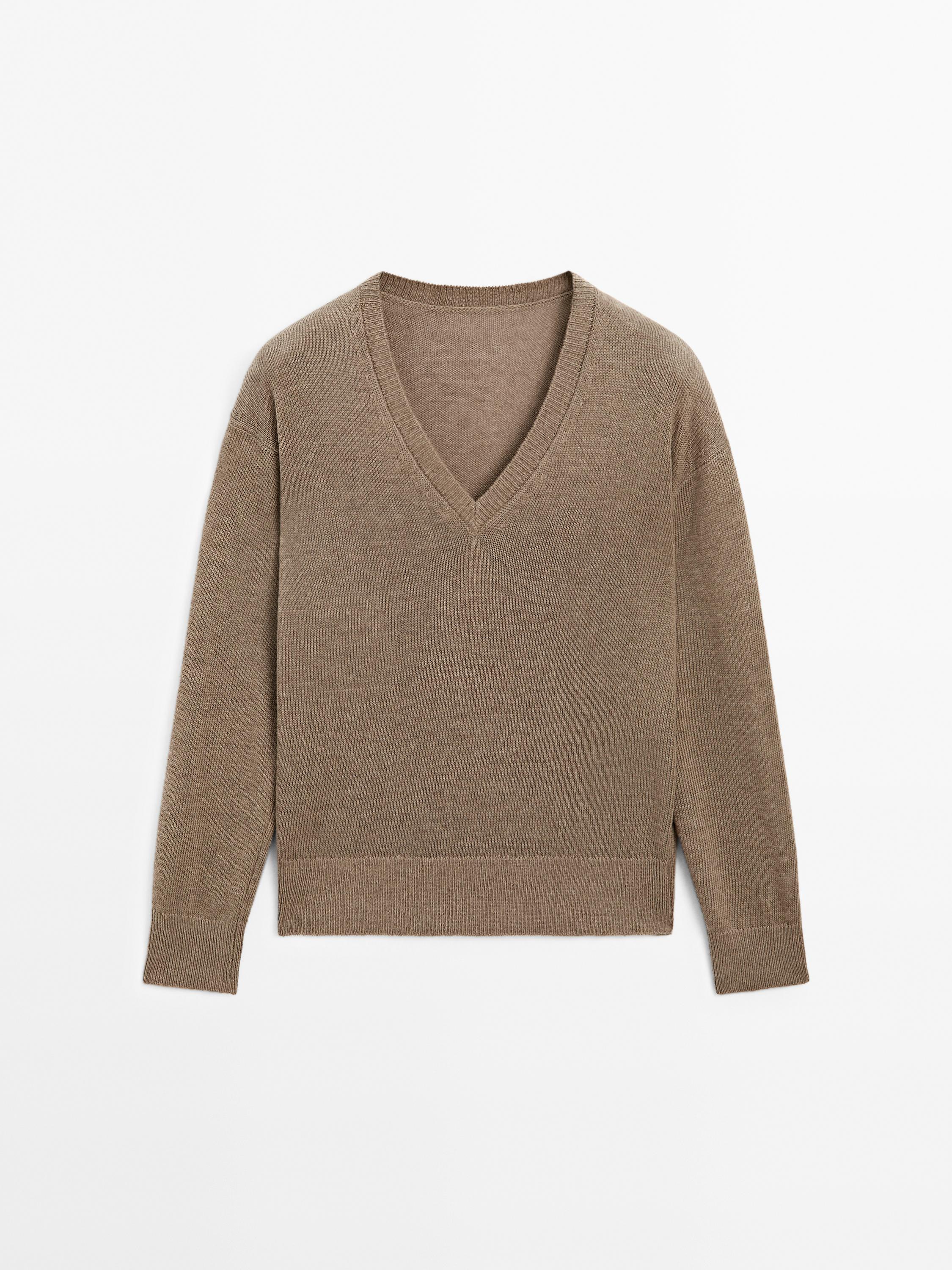Massimo Dutti Вязаный свитер с длинными рукавами и V-образным вырезом, коричневый