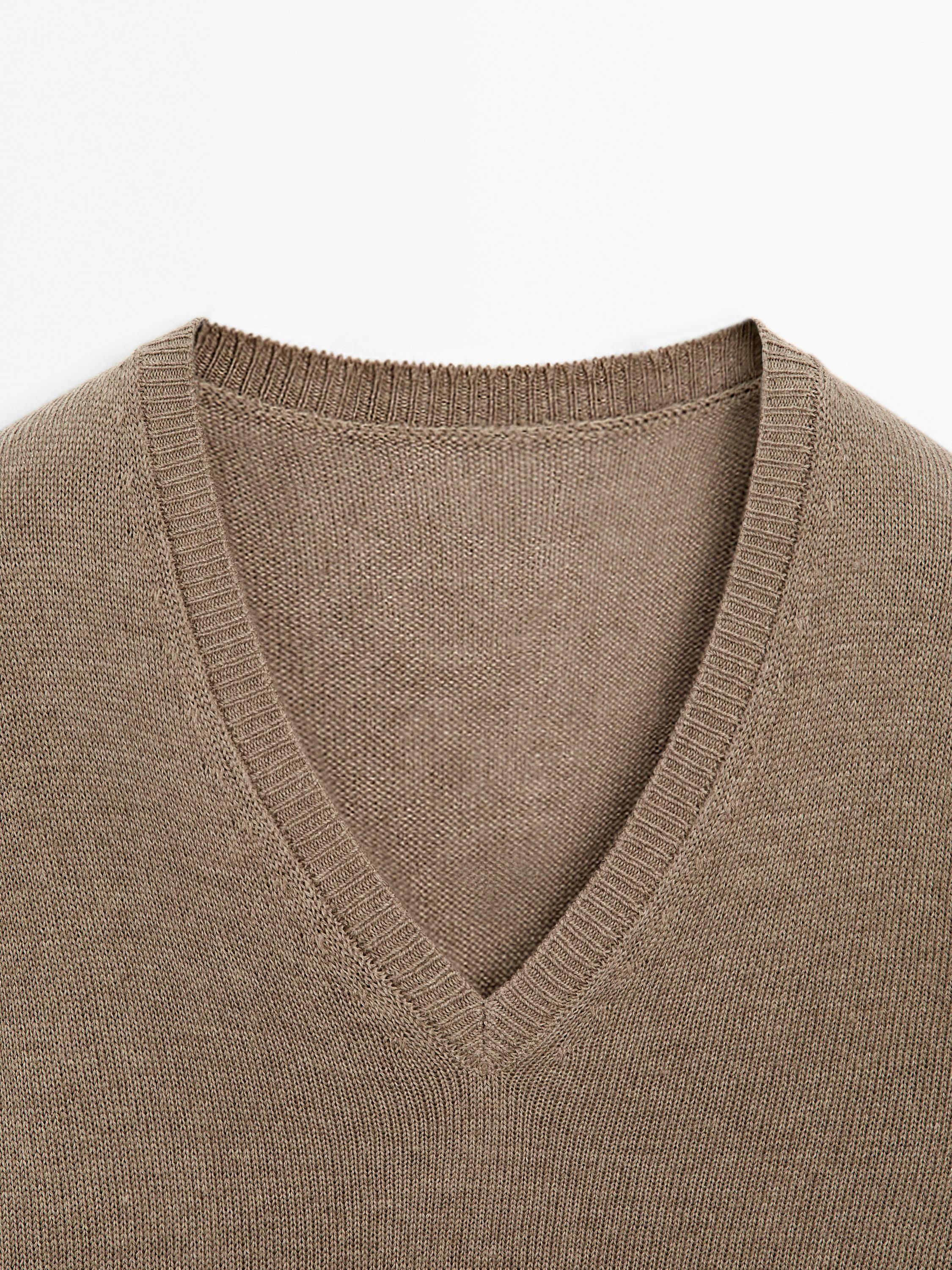 Свитер из смесовой льняной ткани. V-образный вырез. Длинные рукава. Ребристая отделка. Тонкая, легкая ткань.