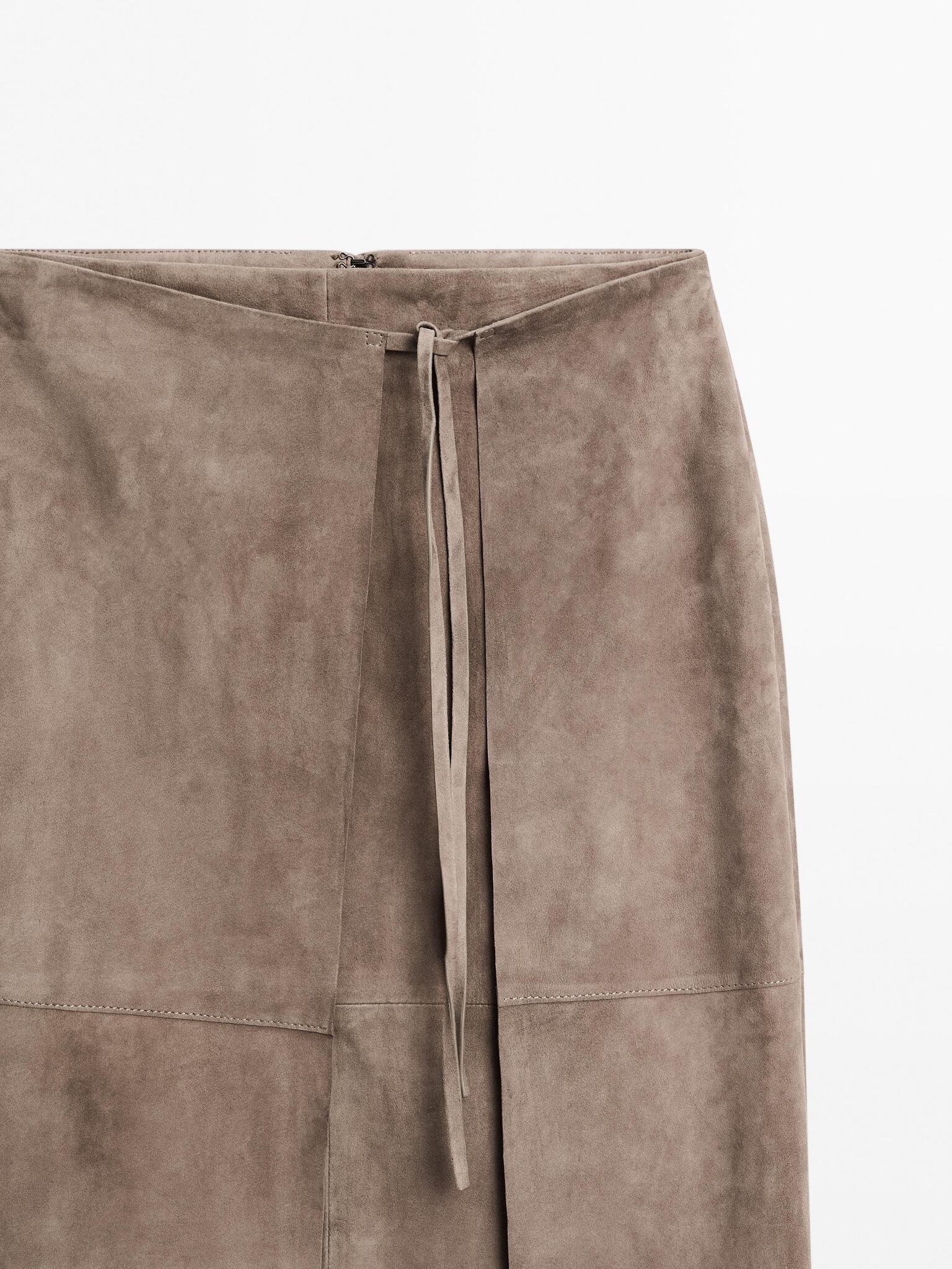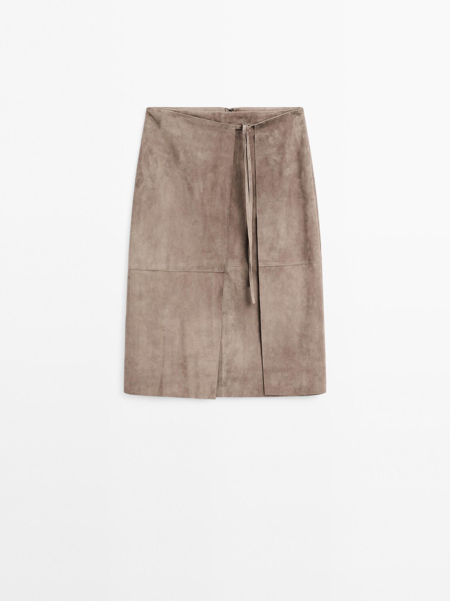 Massimo Dutti Юбка миди из замши и кожи с запахом, серо-бежевый
