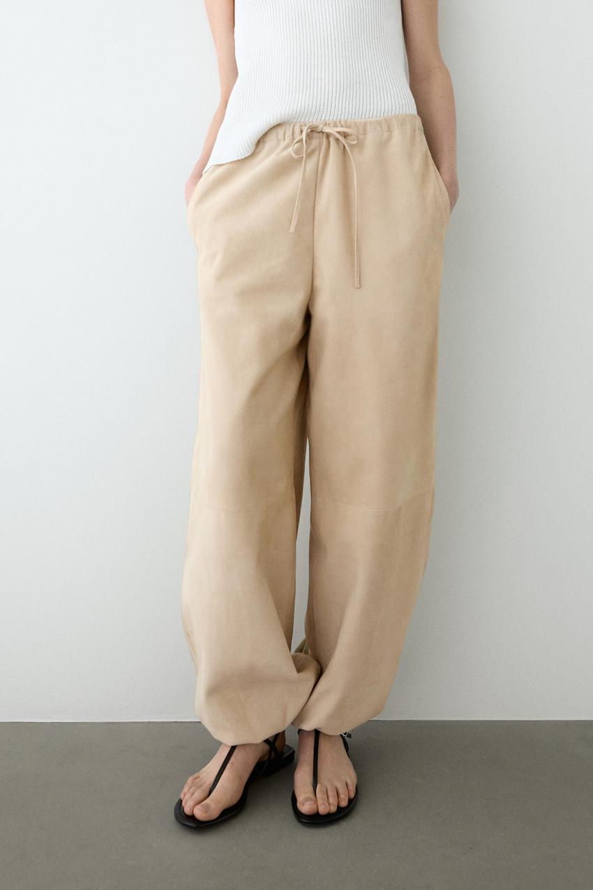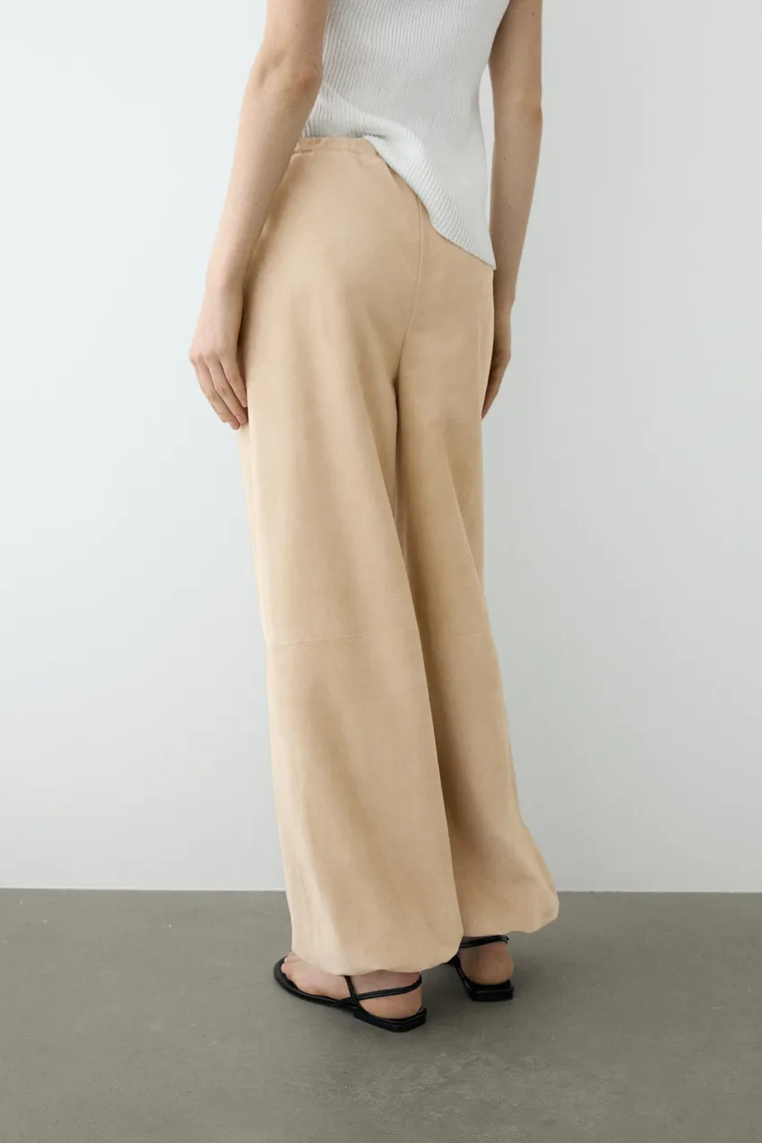 Брюки Sarouel: свободный силуэт, широкие штанины и облегающая щиколотка. Застежка на шнурке. Эластичный пояс. Два боковых кармана. Изготовлены из козьей кожи с замшевой отделкой.