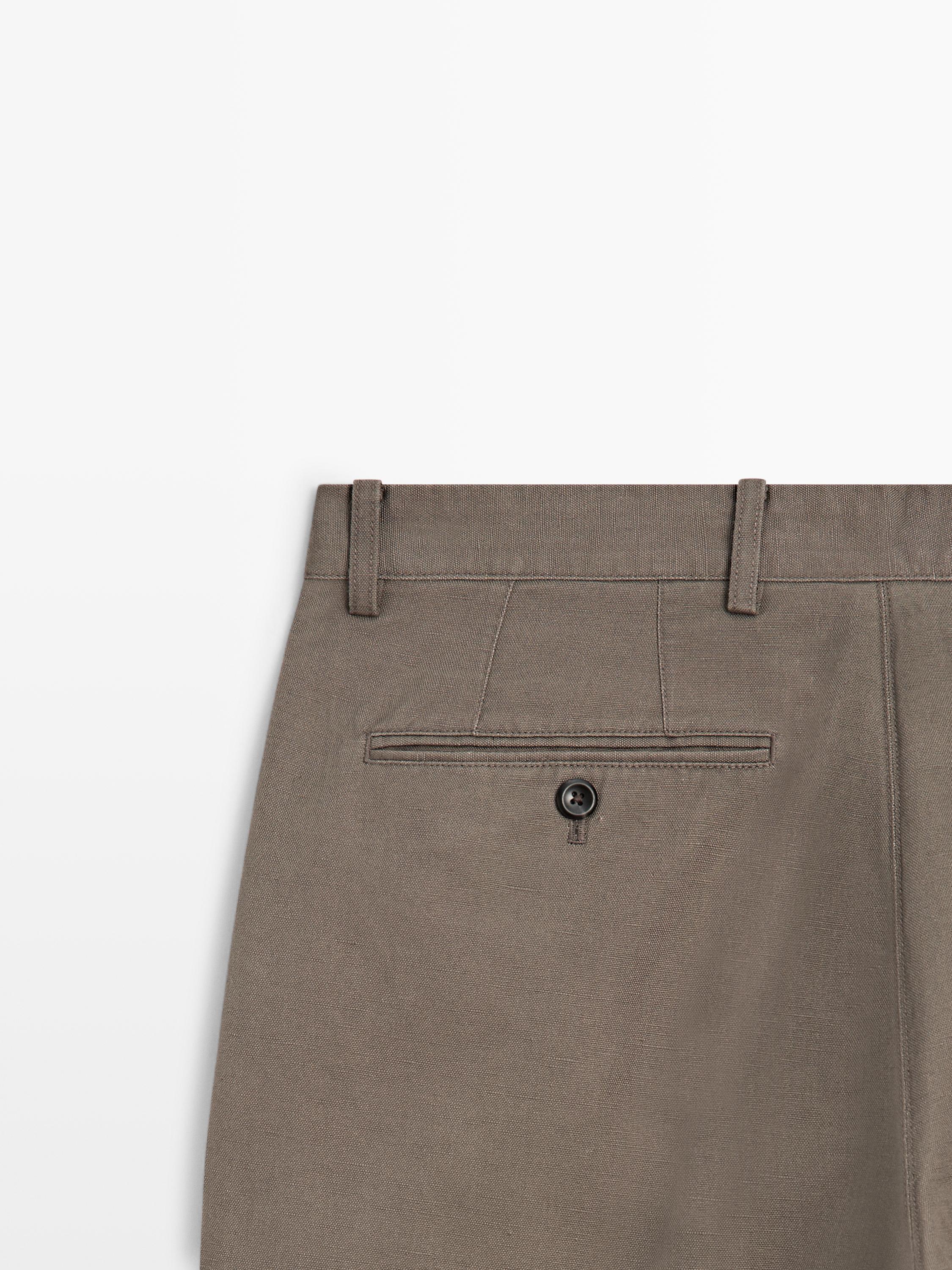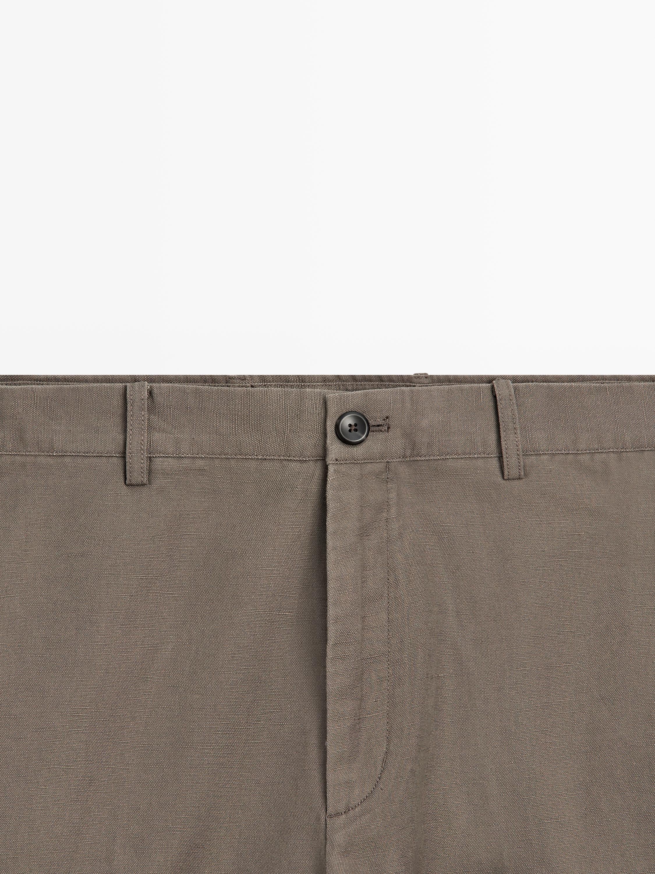 Брюки зауженного кроя: этот фасон отличается свободным кроем в талии, плавно сужающимся к щиколоткам. Брюки изготовлены из смесовой льняной ткани. Пояс с петлями для ремня. Застежка на молнию и пуговицу спереди. Рабочий боковой карман.