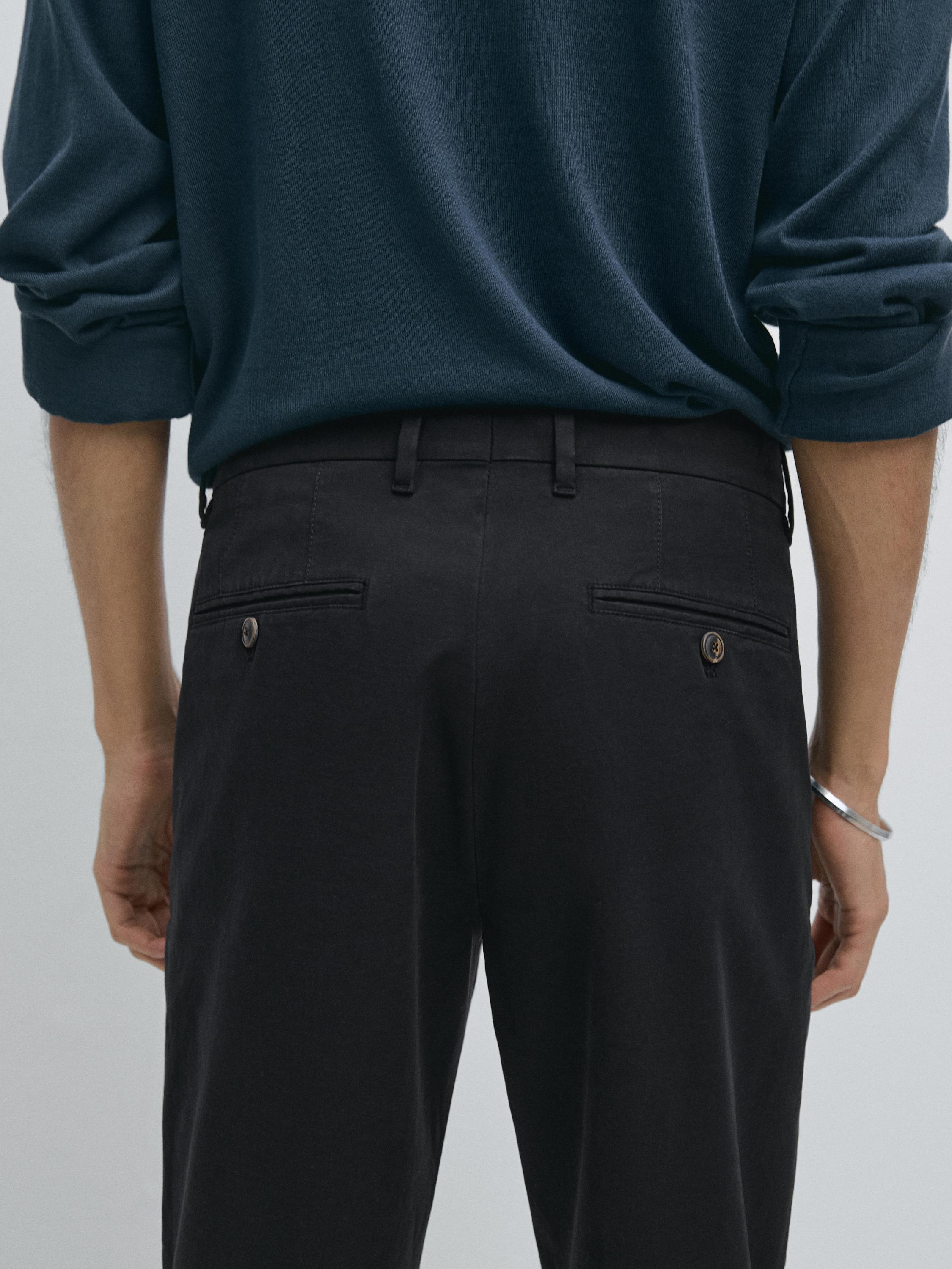 Брюки зауженного кроя: этот фасон имеет слегка приталенный силуэт, облегающий талию и штанины. Скрытая застежка-молния с клапаном, пуговицей и внутренней пуговицей. Два боковых кармана. Два прорезных кармана на пуговицах сзади.