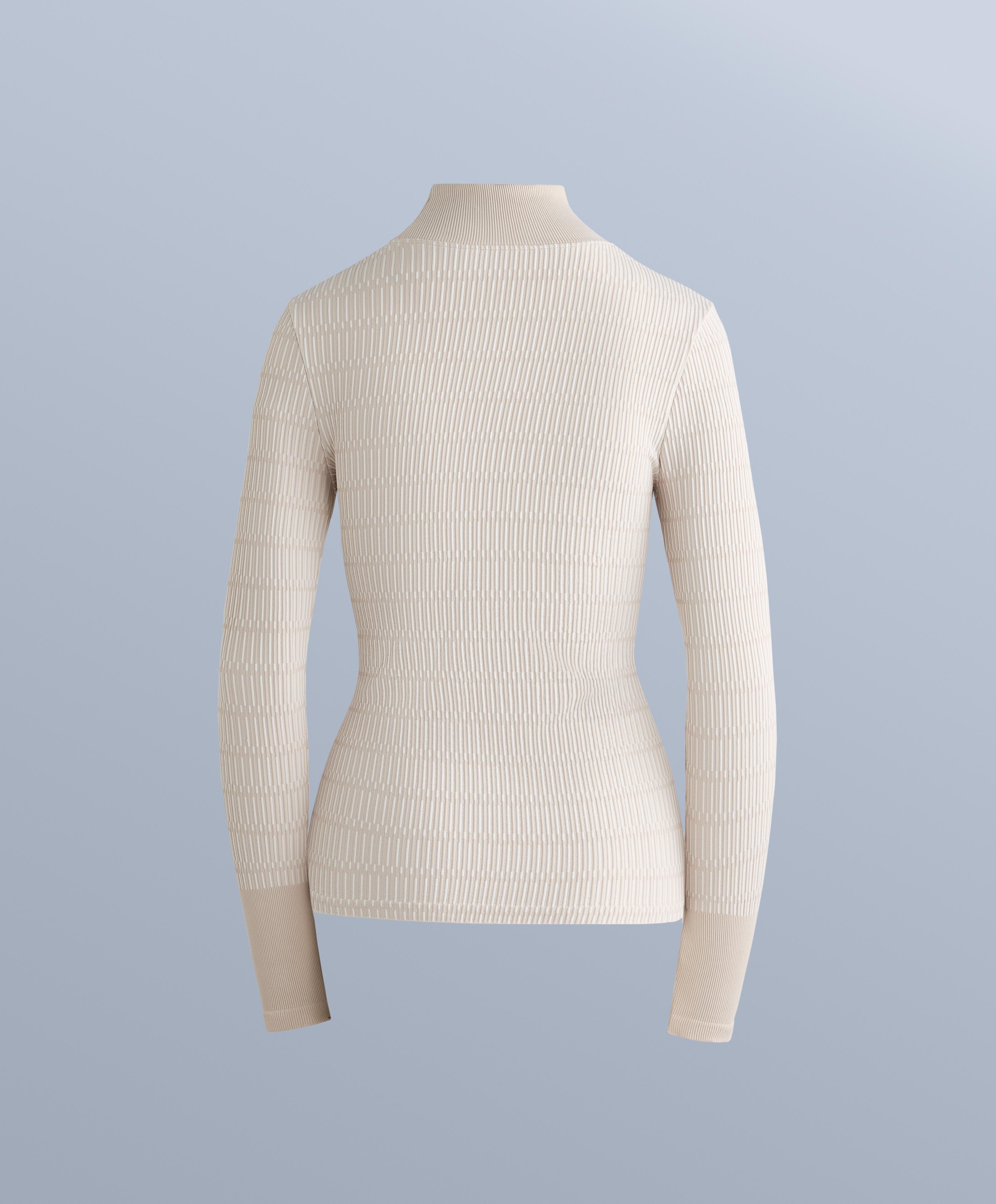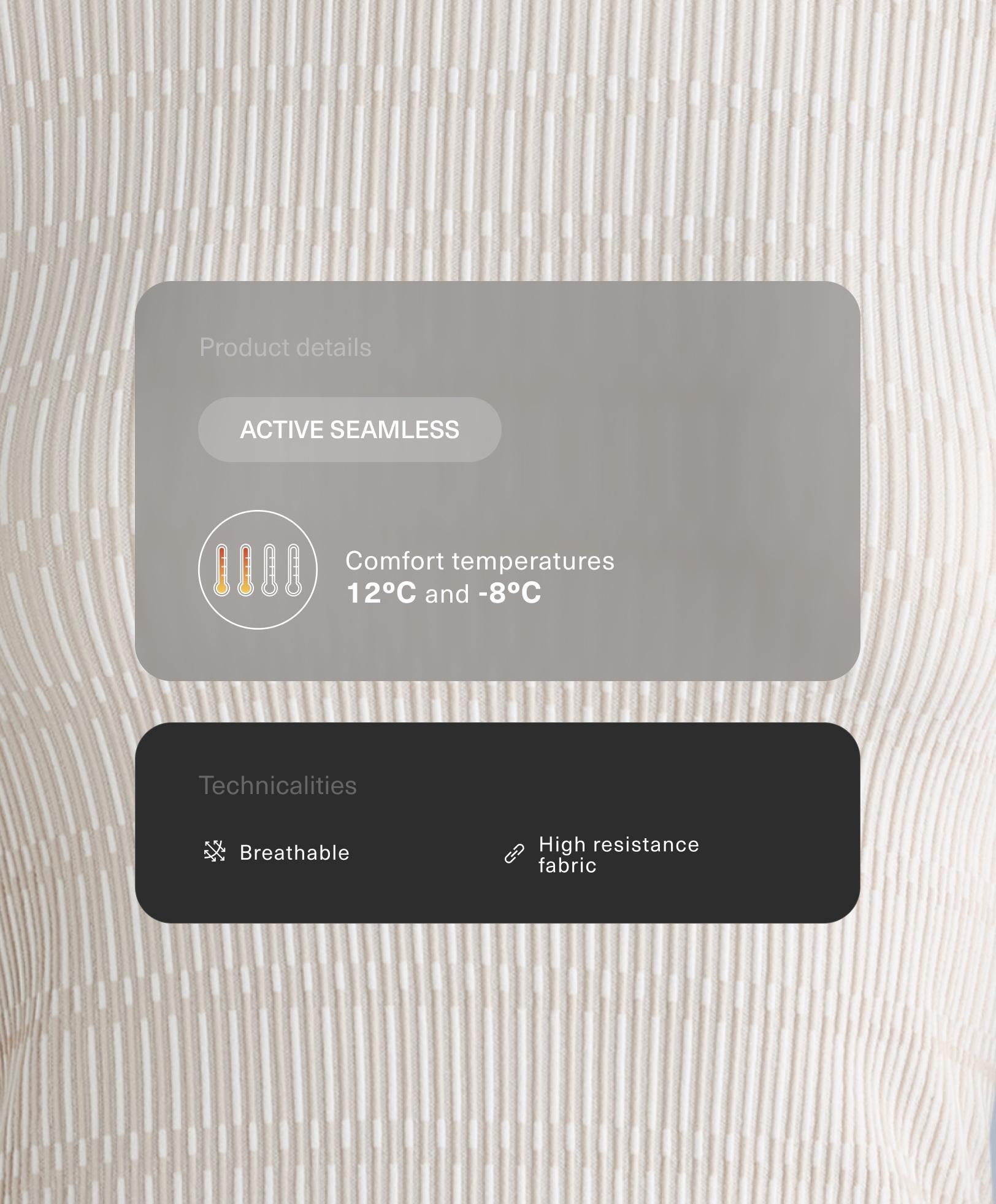 Бесшовная термофутболка с длинным рукавом и воротником-стойкой. Специальное отверстие в манжете рукава для большого пальца обеспечивает большую свободу движений. Дышащая, износостойкая ткань. Эта модель сертифицирована для использования при температуре 12ºC при низкой активности и -8ºC при умеренной активности, что было подтверждено стандартным тестом с имитацией ветра 0,4 м/с. На испытуемом были: куртка, брюки, нижнее белье, носки, обувь, перчатки и вязаная шапка.