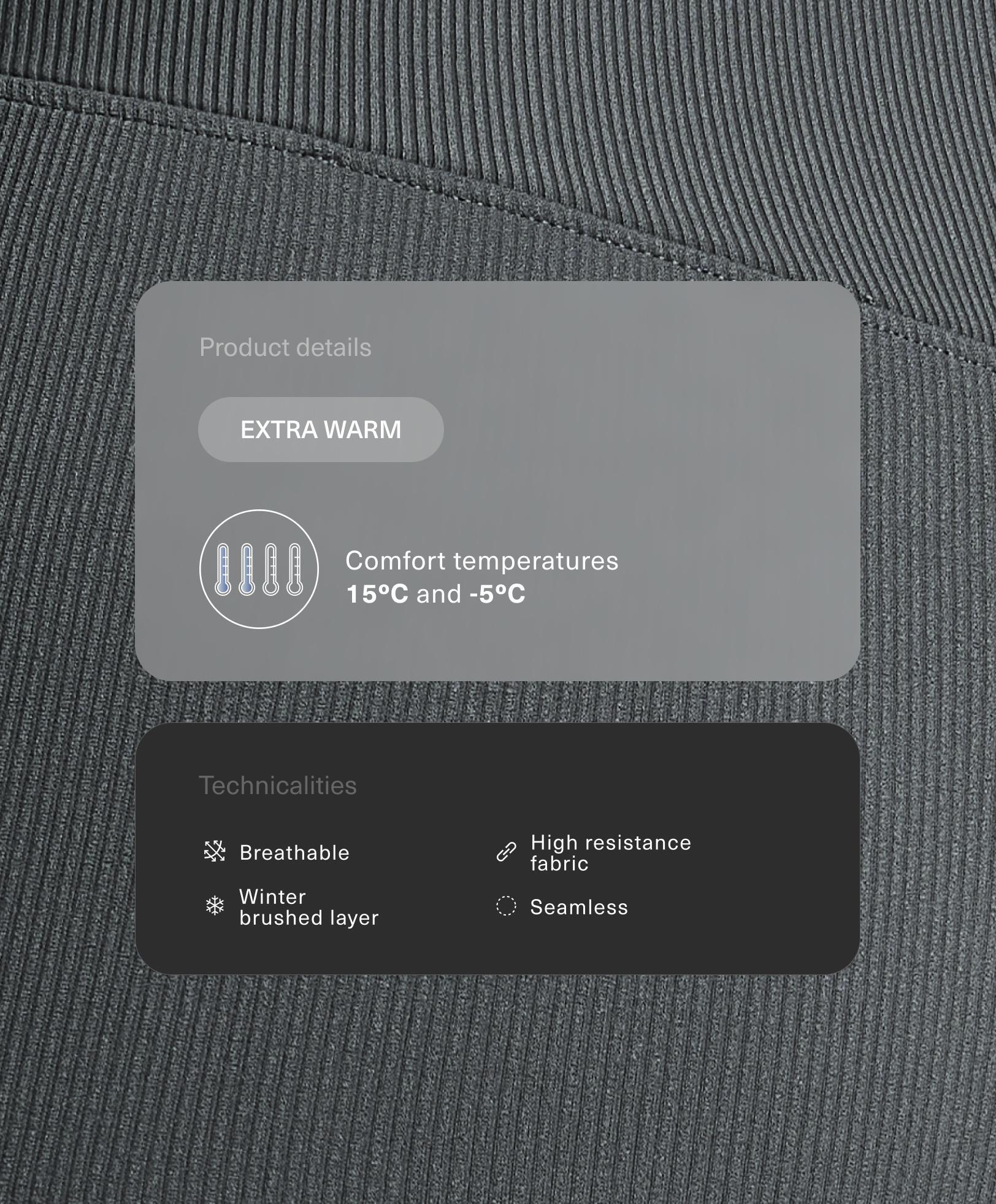 Легинсы в рубчик из очень тёплой бесшовной ткани с начёсом внутри. Длина до щиколотки, супервысокая талия. Дышащая, высокопрочная ткань. Этот предмет одежды сертифицирован для использования при температуре от +15ºC (низкая активность) до -5ºC (умеренная активность) в ходе стандартизированного испытания с имитацией ветра 0,4 м/с. Надевать его нужно с курткой, футболкой с длинными рукавами и высоким воротом, нижним бельём, носками, обувью, перчатками и вязаной шапкой.
