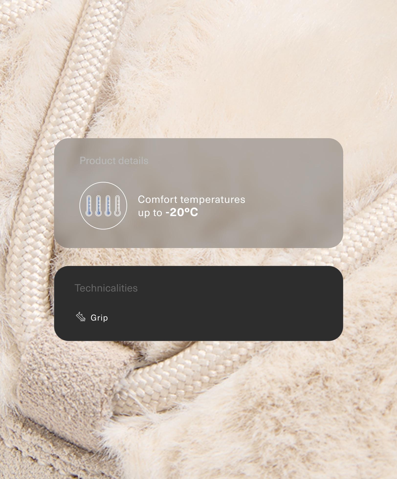 Ботинки из спилка с верхом из искусственного меха. Конструкция, протестированная в лабораторных условиях, выдерживает температуру до –20 °C, обеспечивая теплоизоляцию в экстремальных условиях. Технологичная подошва с высоким сцеплением обеспечивает устойчивость на скользких поверхностях. Высота подошвы: 4 см.