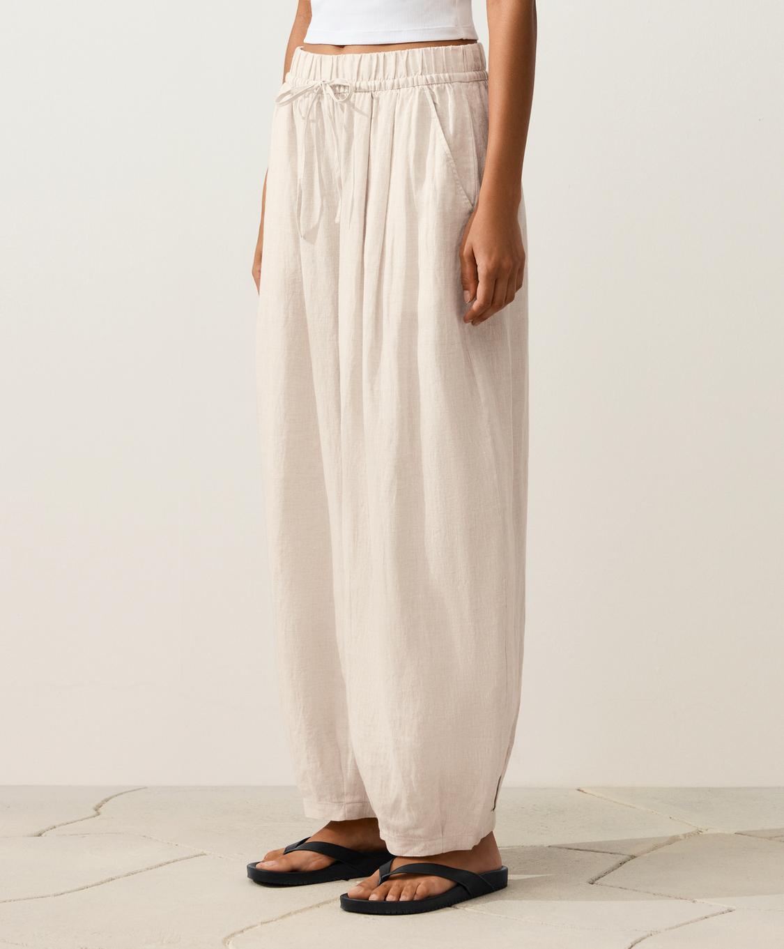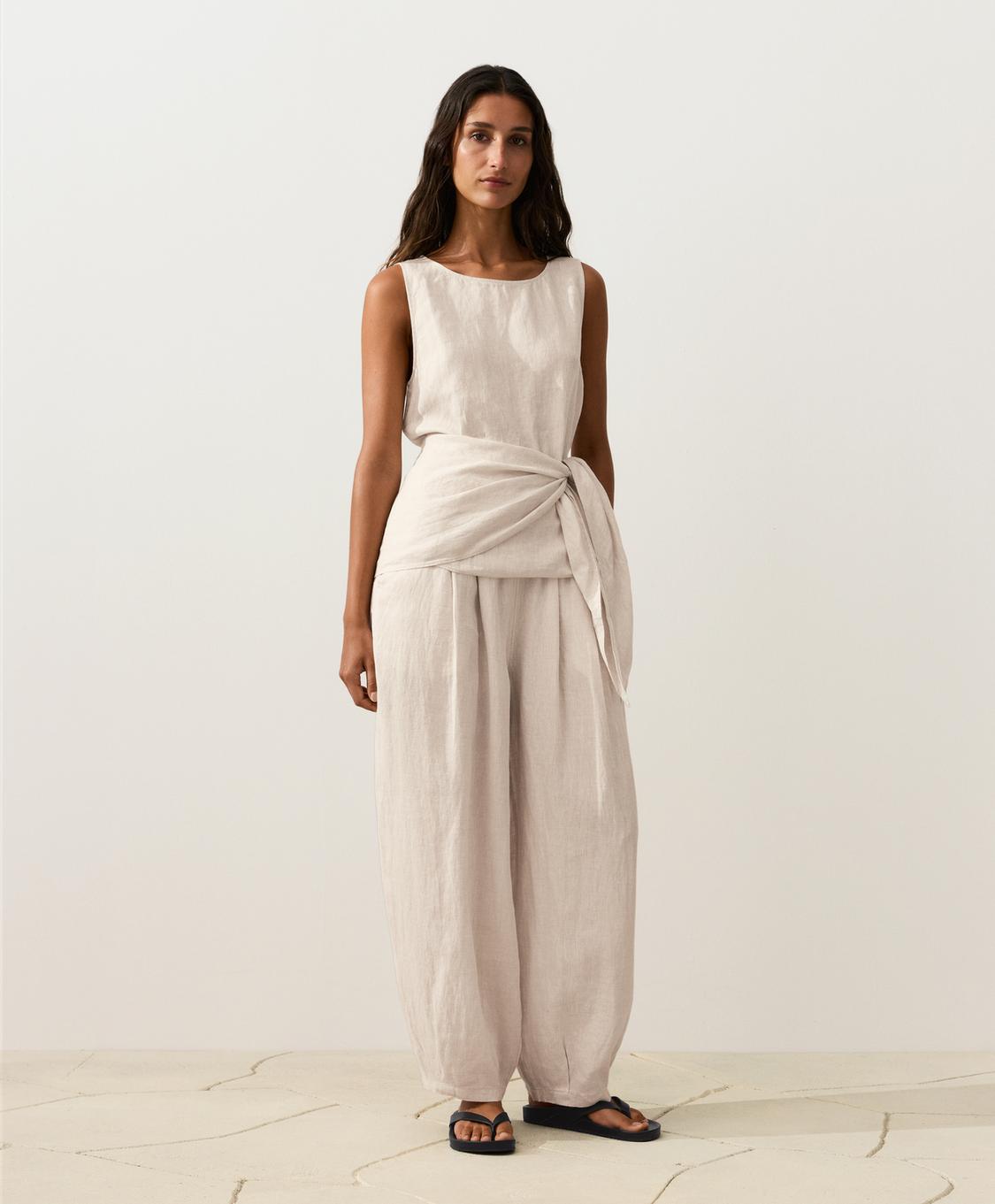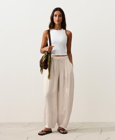 Длинные брюки-баллон с регулируемым поясом на шнуровке и передними карманами. Изготовлены из 100% льняной ткани.