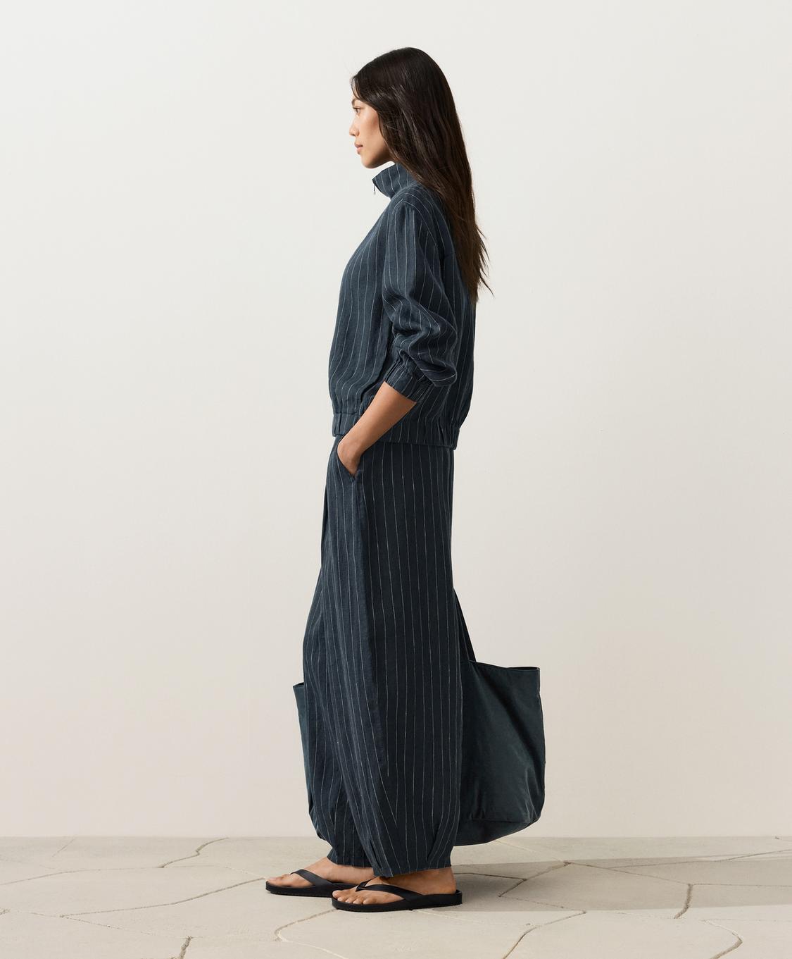 Длинные брюки-баллон с регулируемым поясом на шнуровке и передними карманами. Изготовлены из 100% льняной ткани.