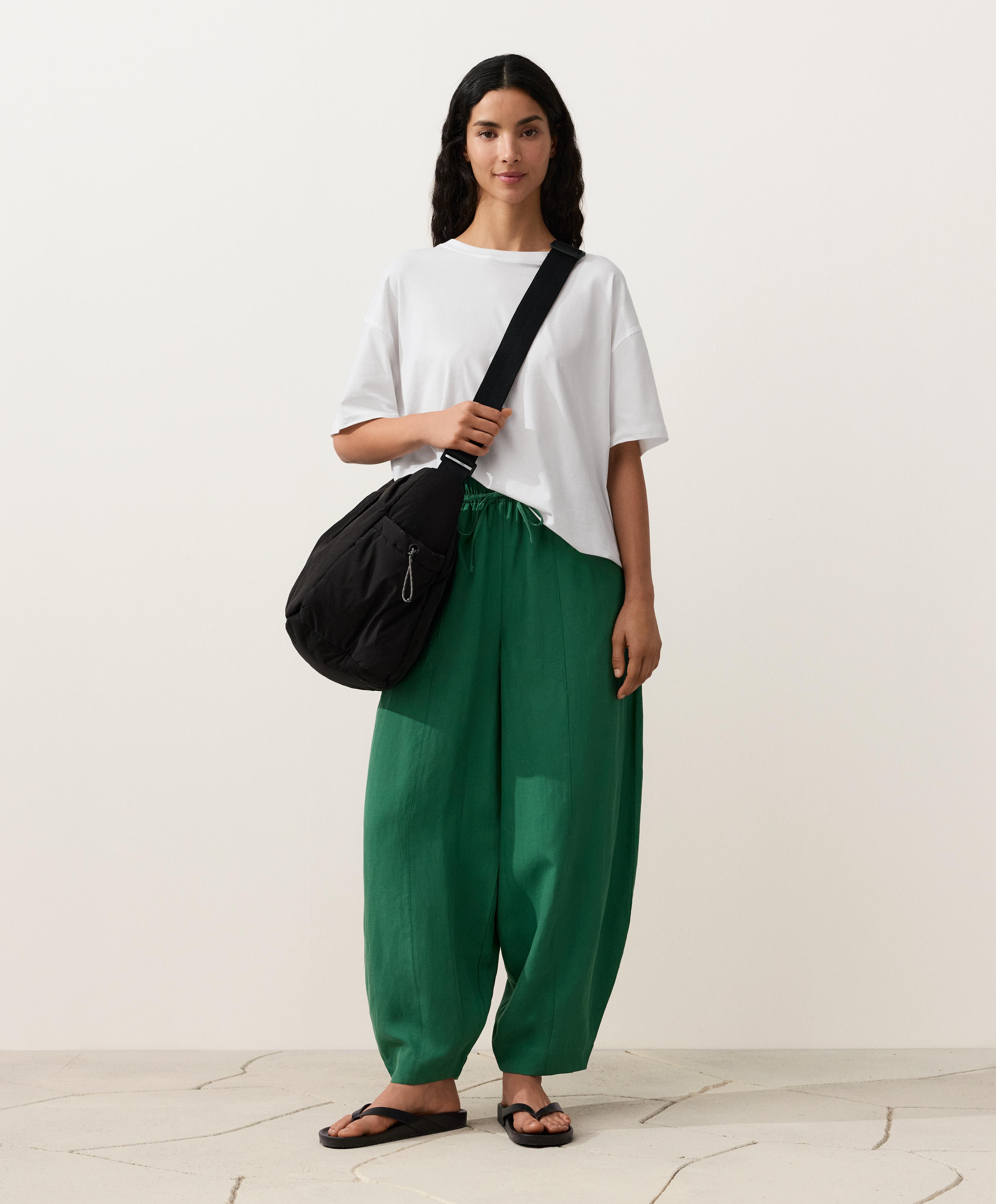 Длинные брюки-баллоны с регулируемым эластичным поясом. Декоративная строчка вдоль штанин. Ткань из смеси лиоцелла.