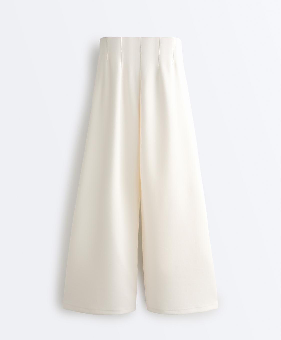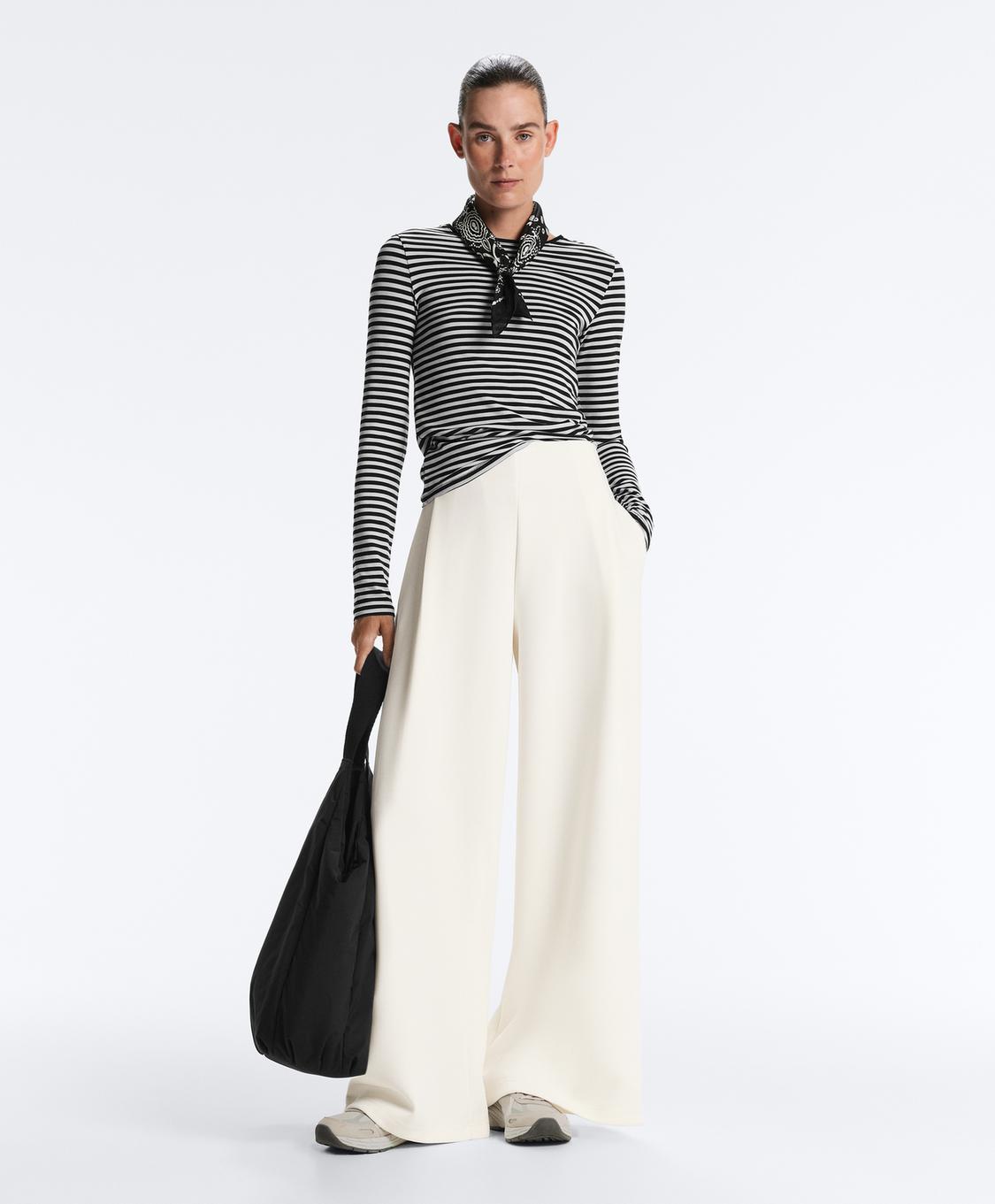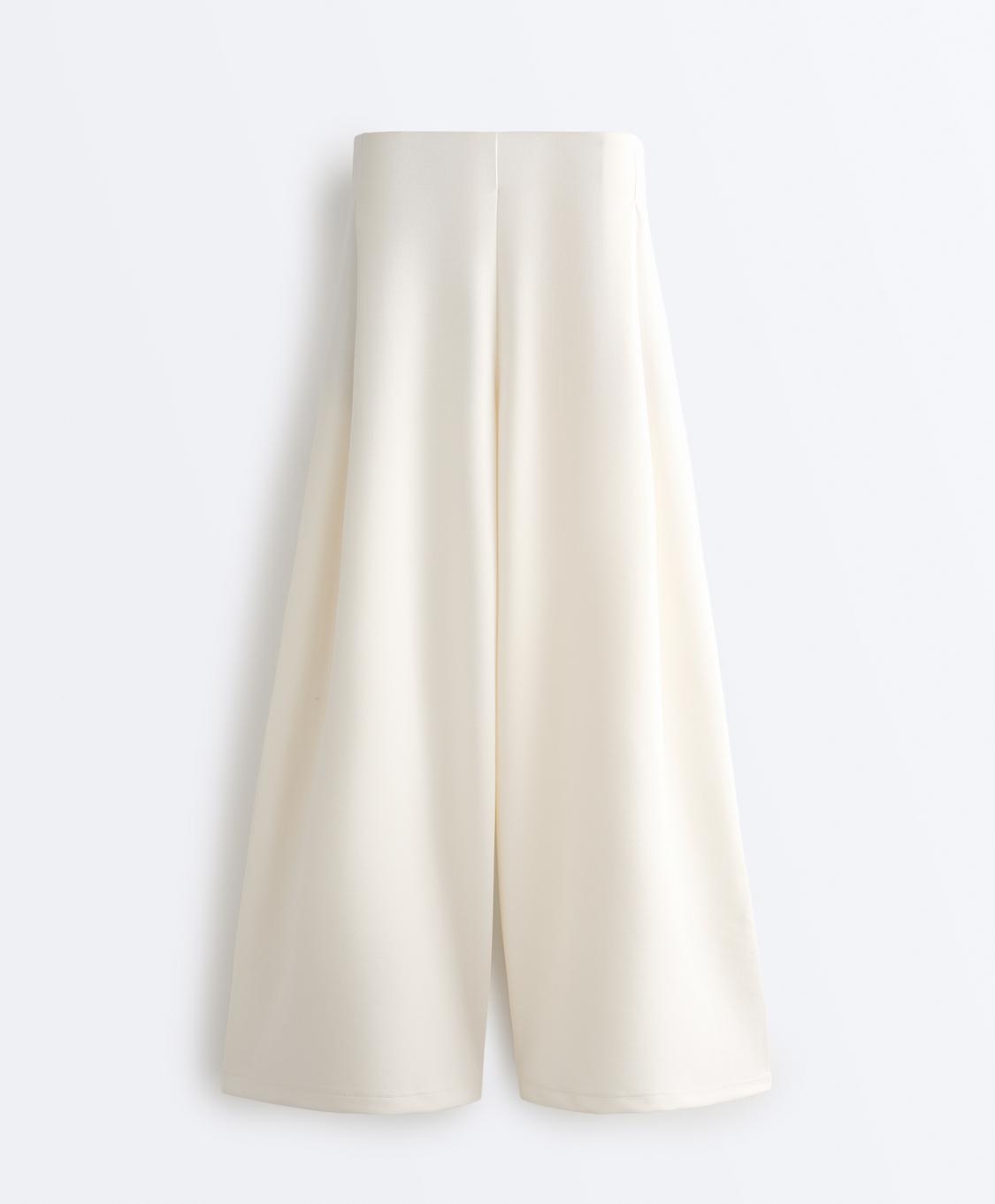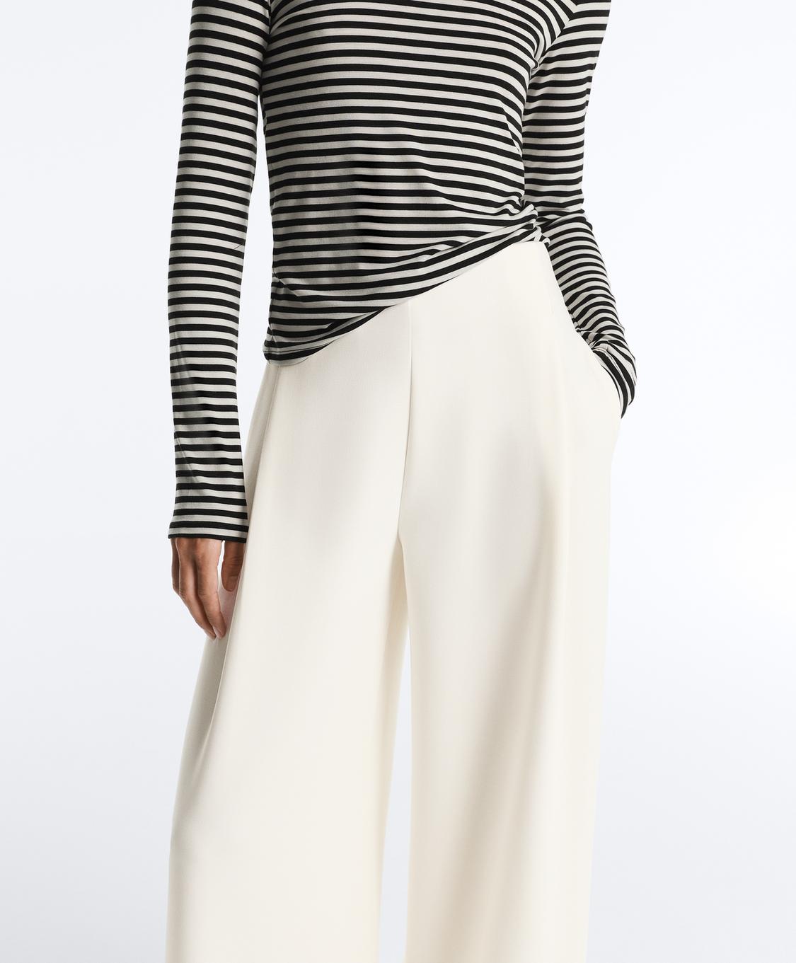 Брюки с высокой посадкой и широкими штанинами, со складками. Регулируемый эластичный пояс и передние карманы. Ткань саржевого переплетения.