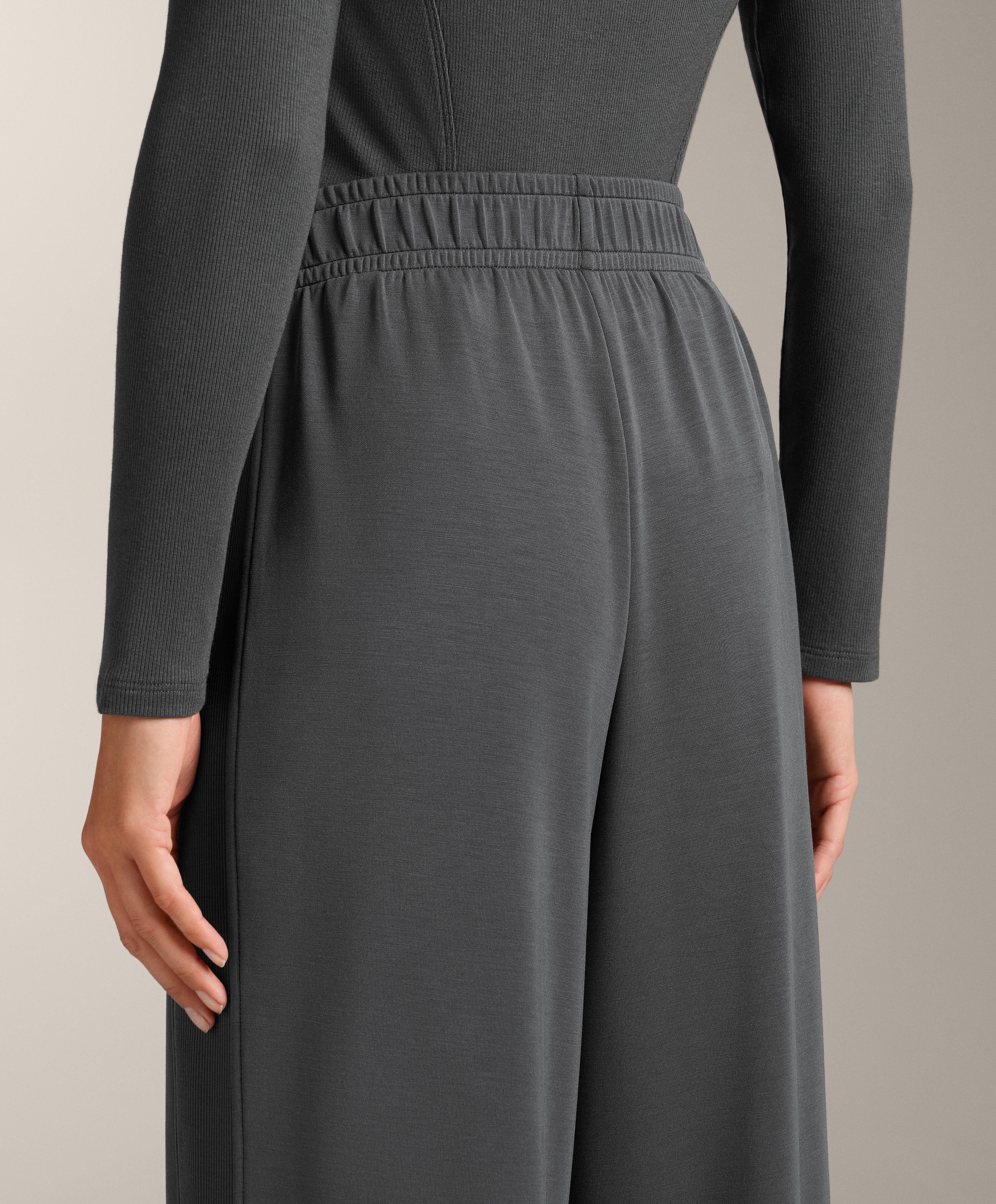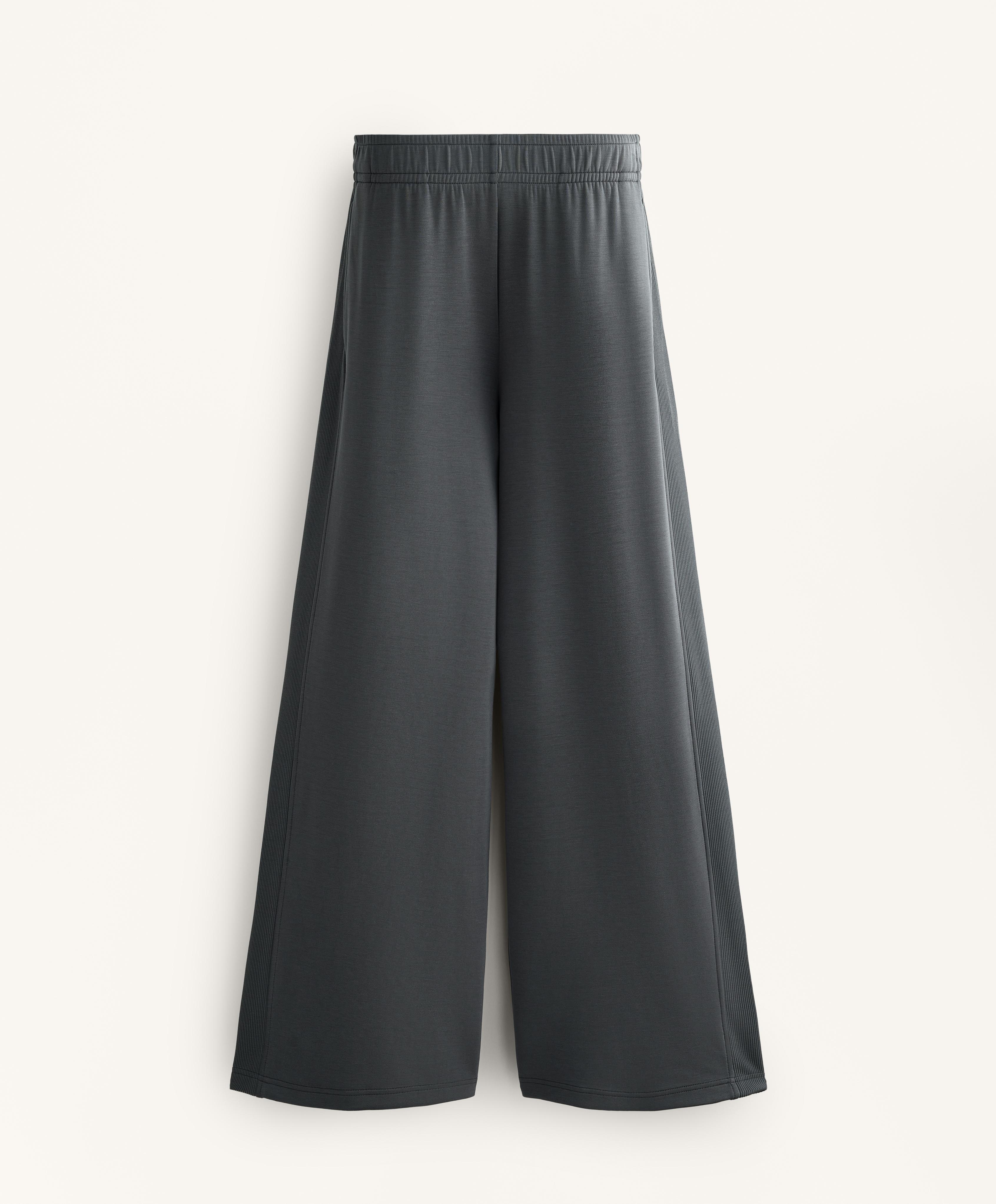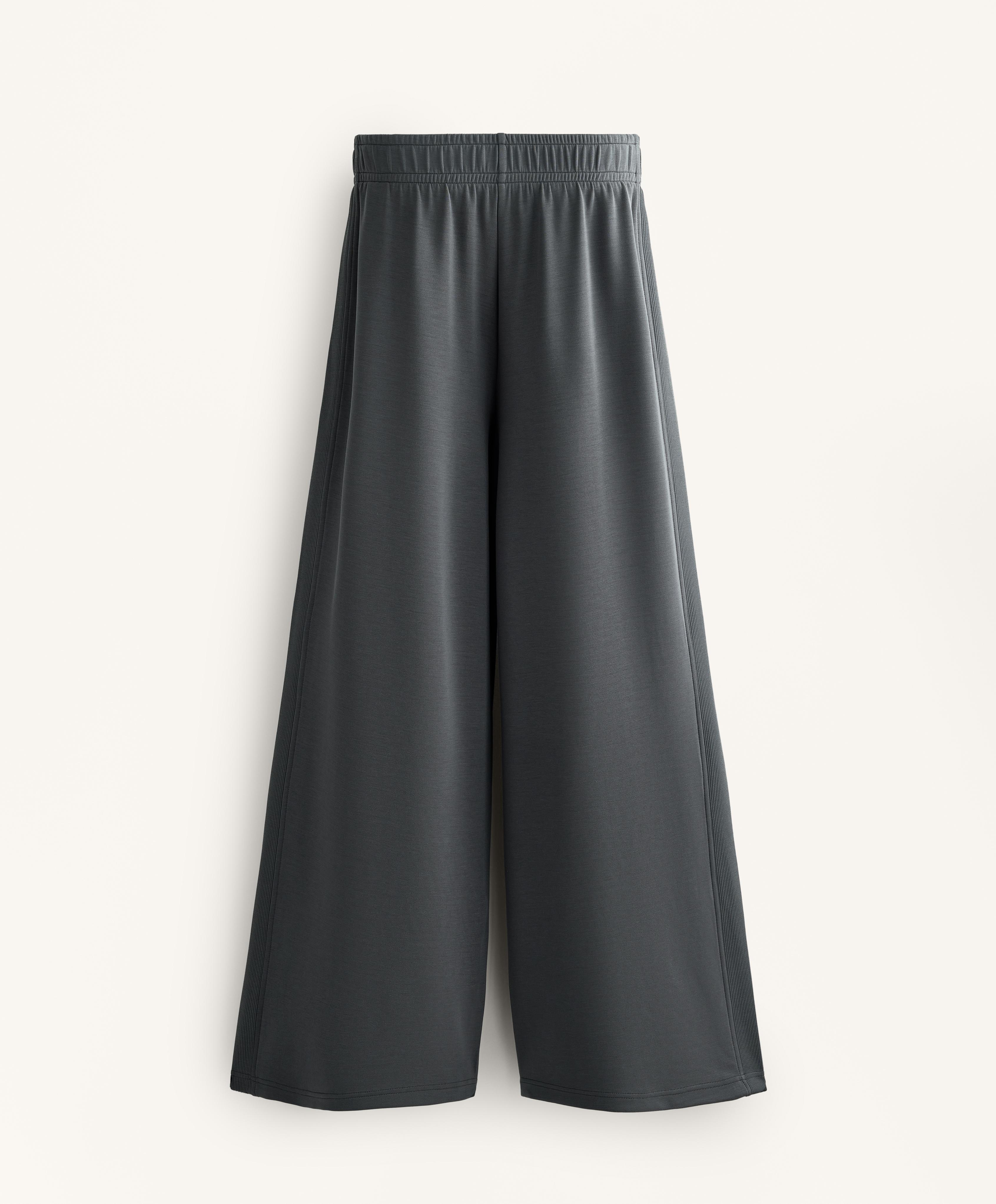 Широкие прямые брюки с ребристой отделкой по бокам. Регулируемый эластичный пояс и передние карманы. Дышащая ткань из модала, очень мягкая на ощупь.