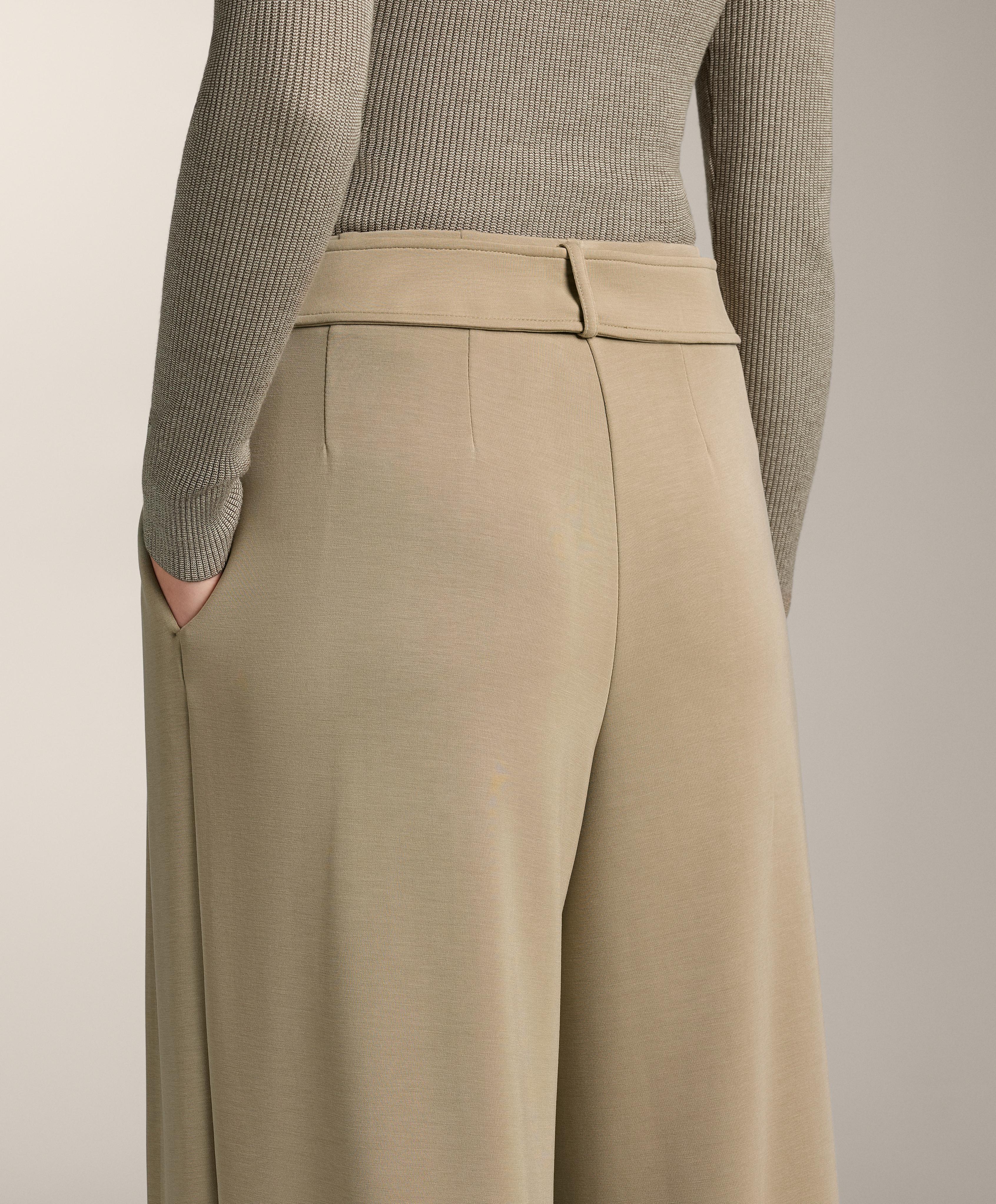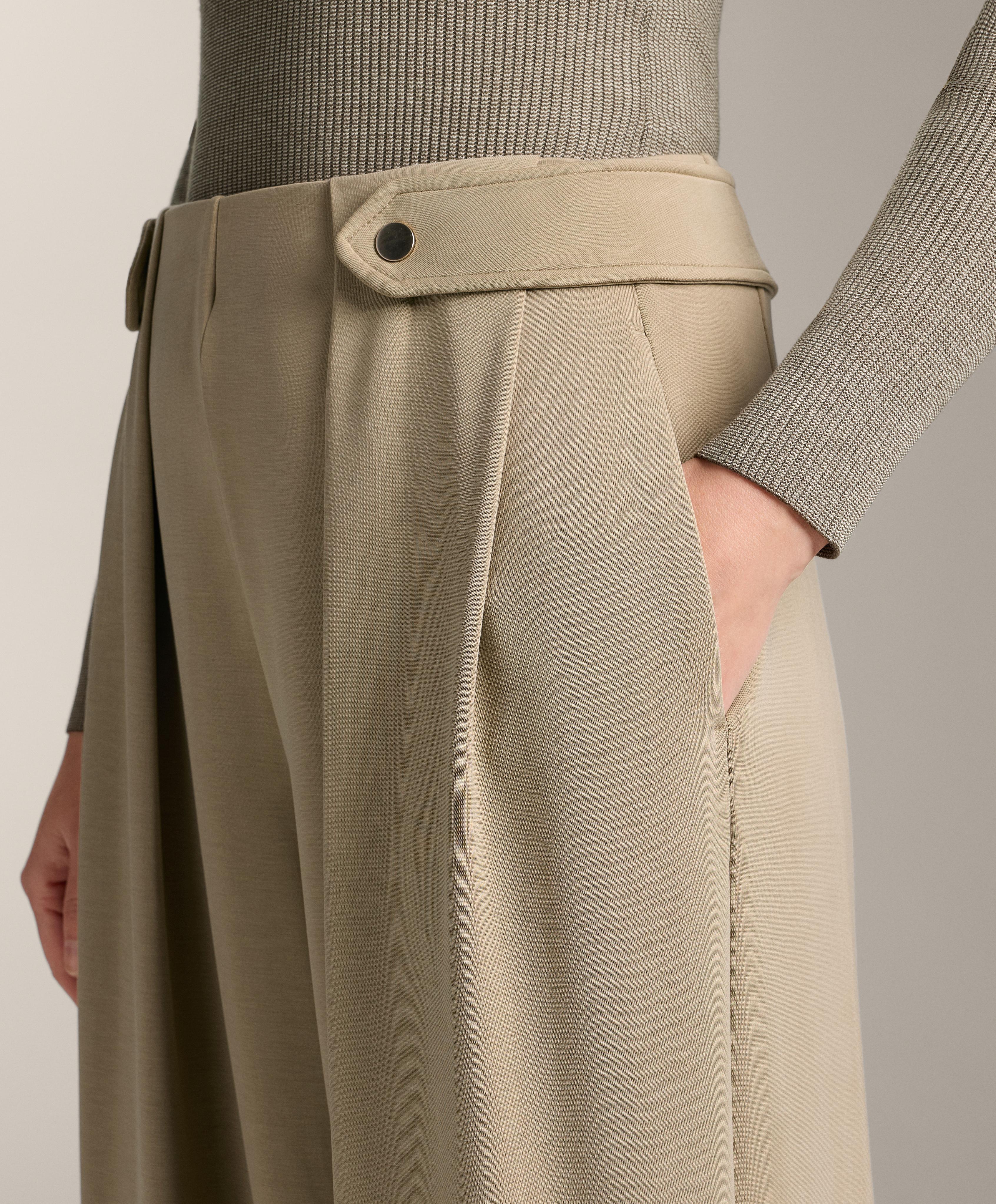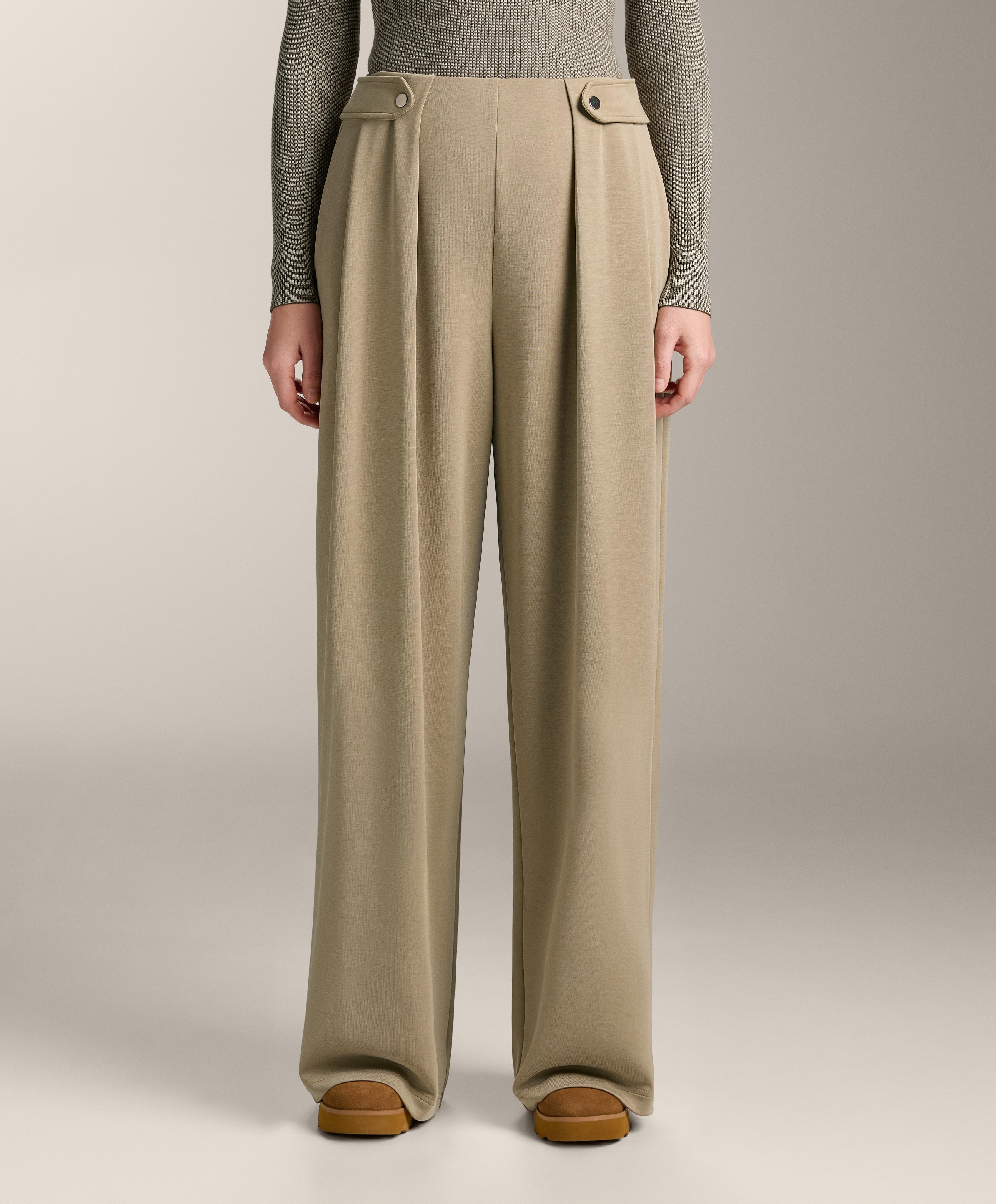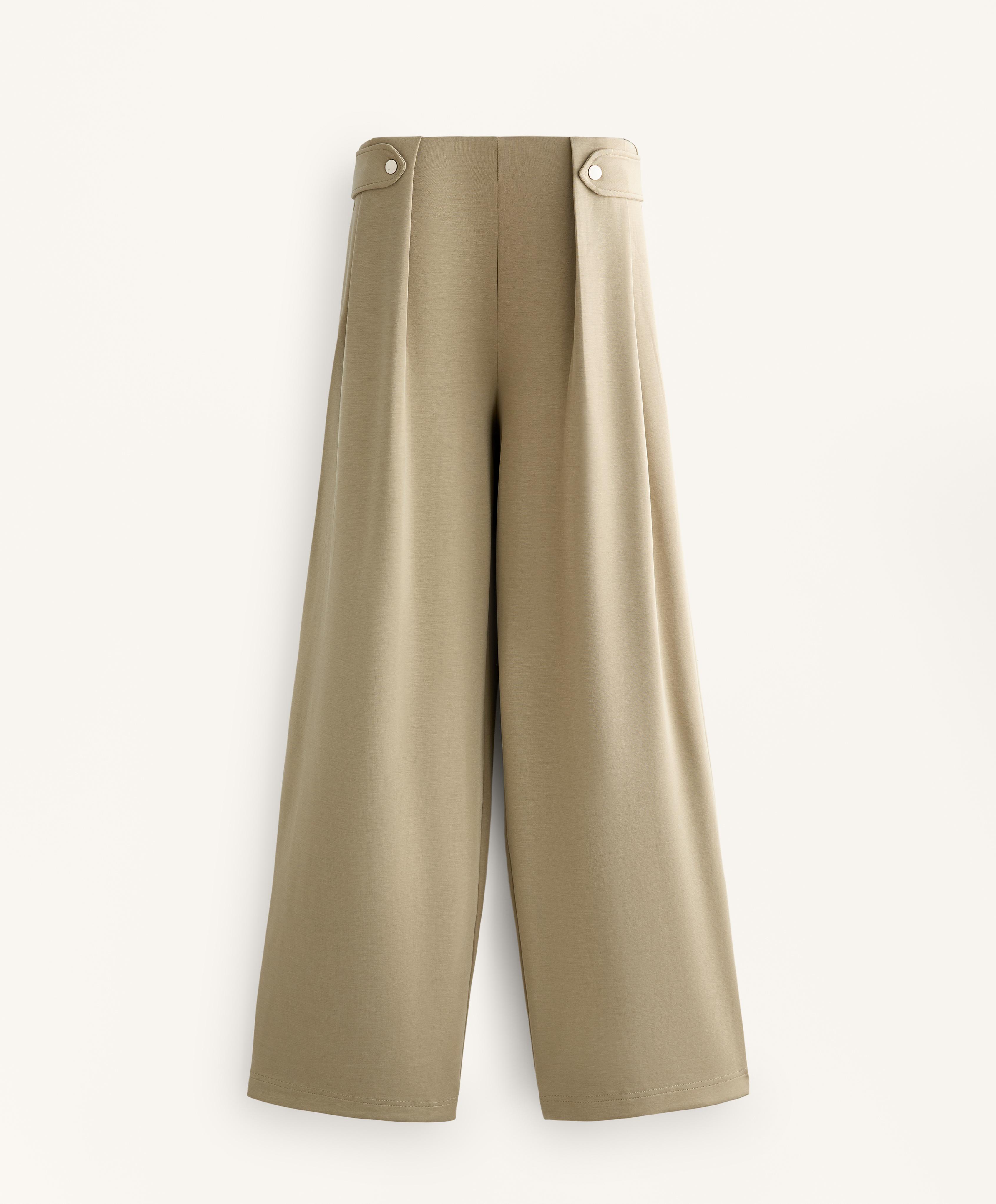 Длинные широкие брюки со складками спереди. Декоративный полупояс с двумя пуговицами спереди. Регулируемый эластичный пояс и передние карманы. Дышащая ткань из модала, очень мягкая на ощупь.