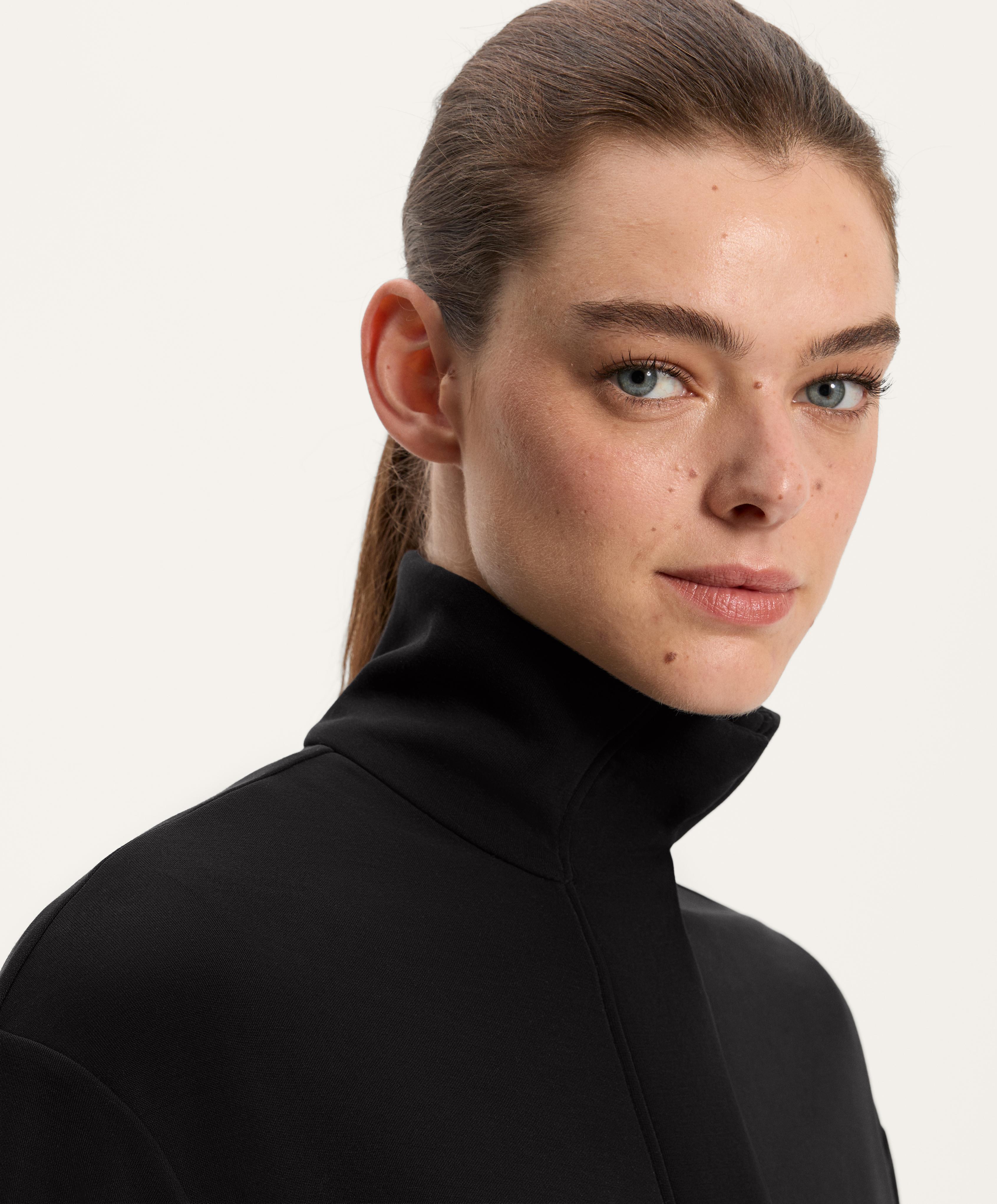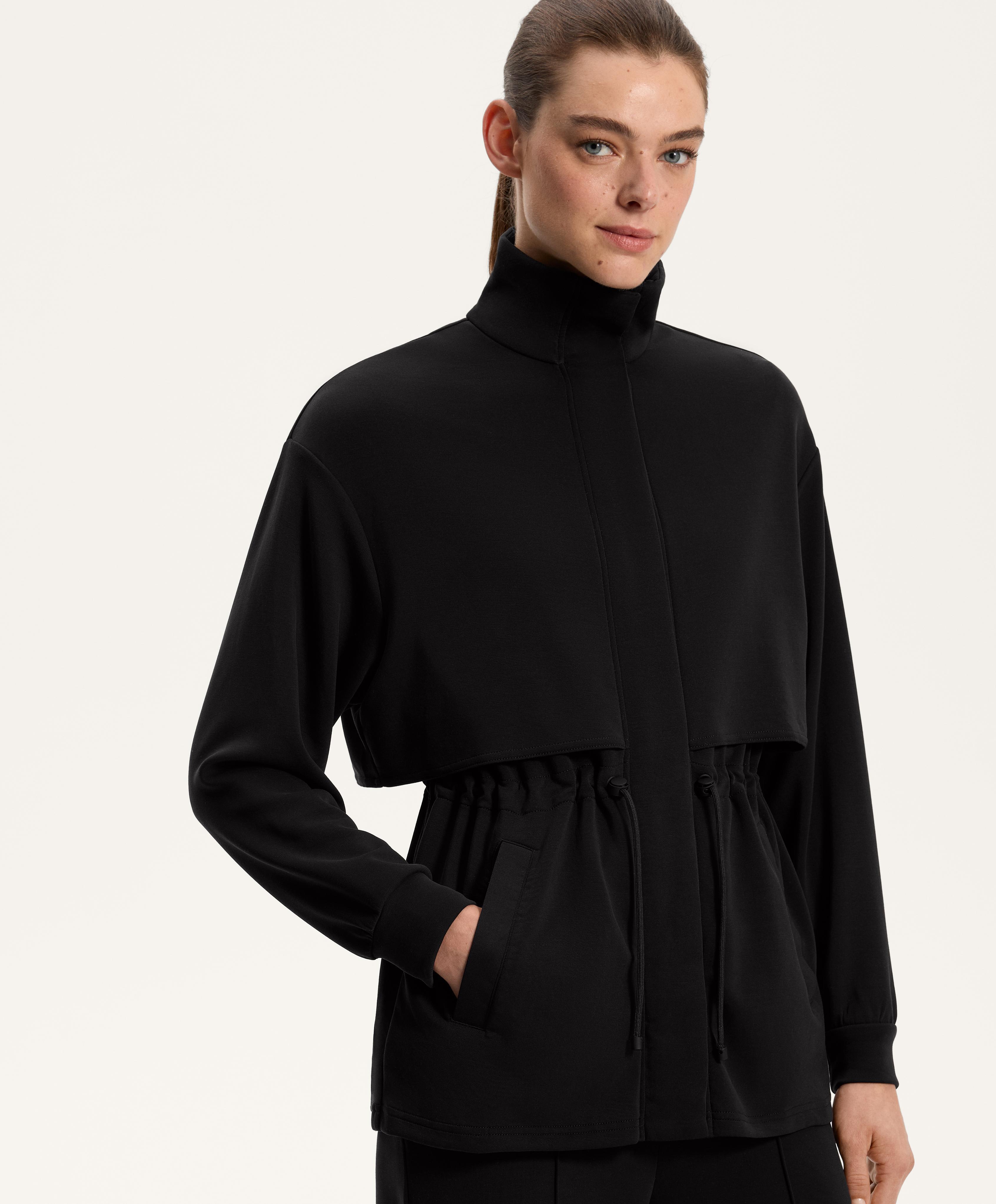 Длинная куртка с высоким воротником и застежкой на молнию и пуговицы спереди. Талия регулируется шнурком. Передние карманы. Дышащая ткань из модала, мягкая на ощупь.