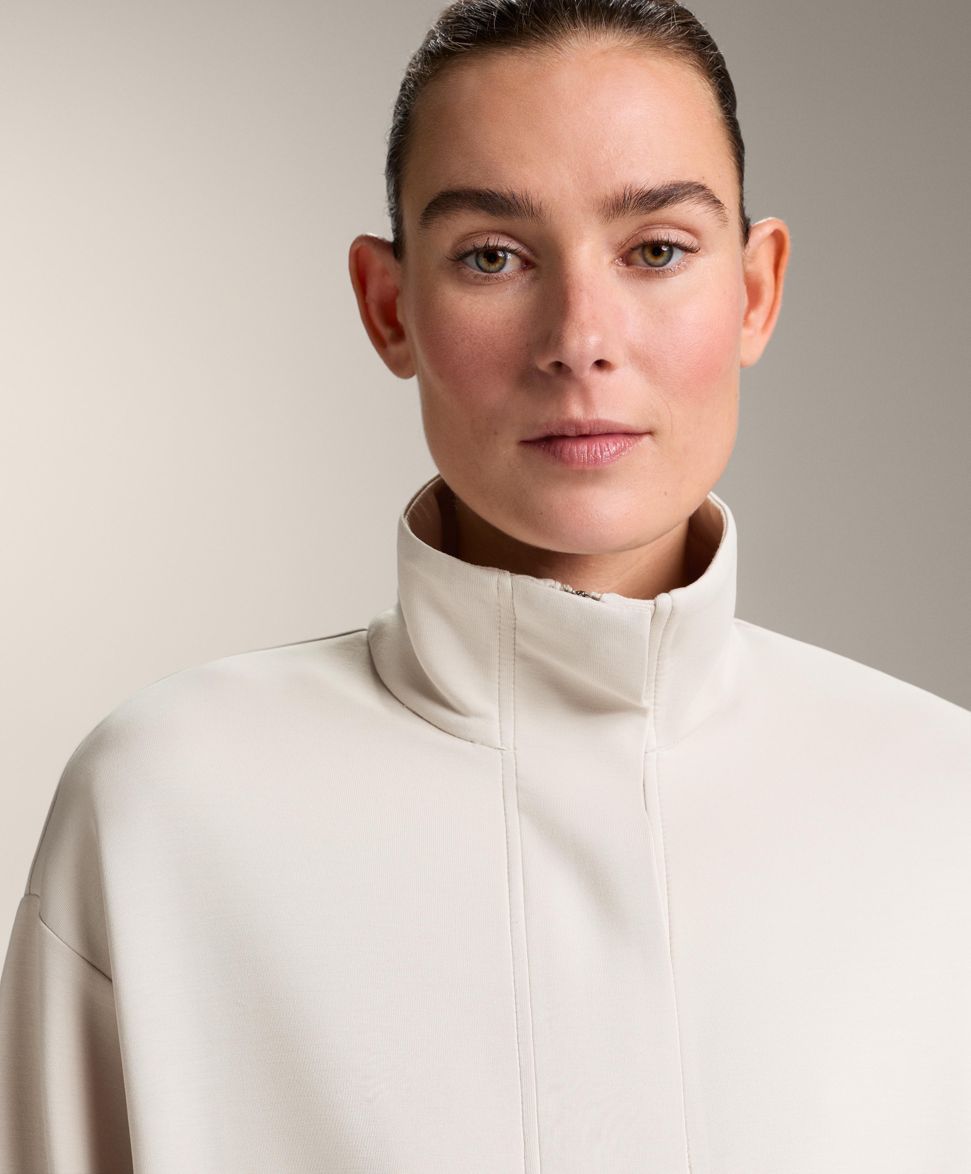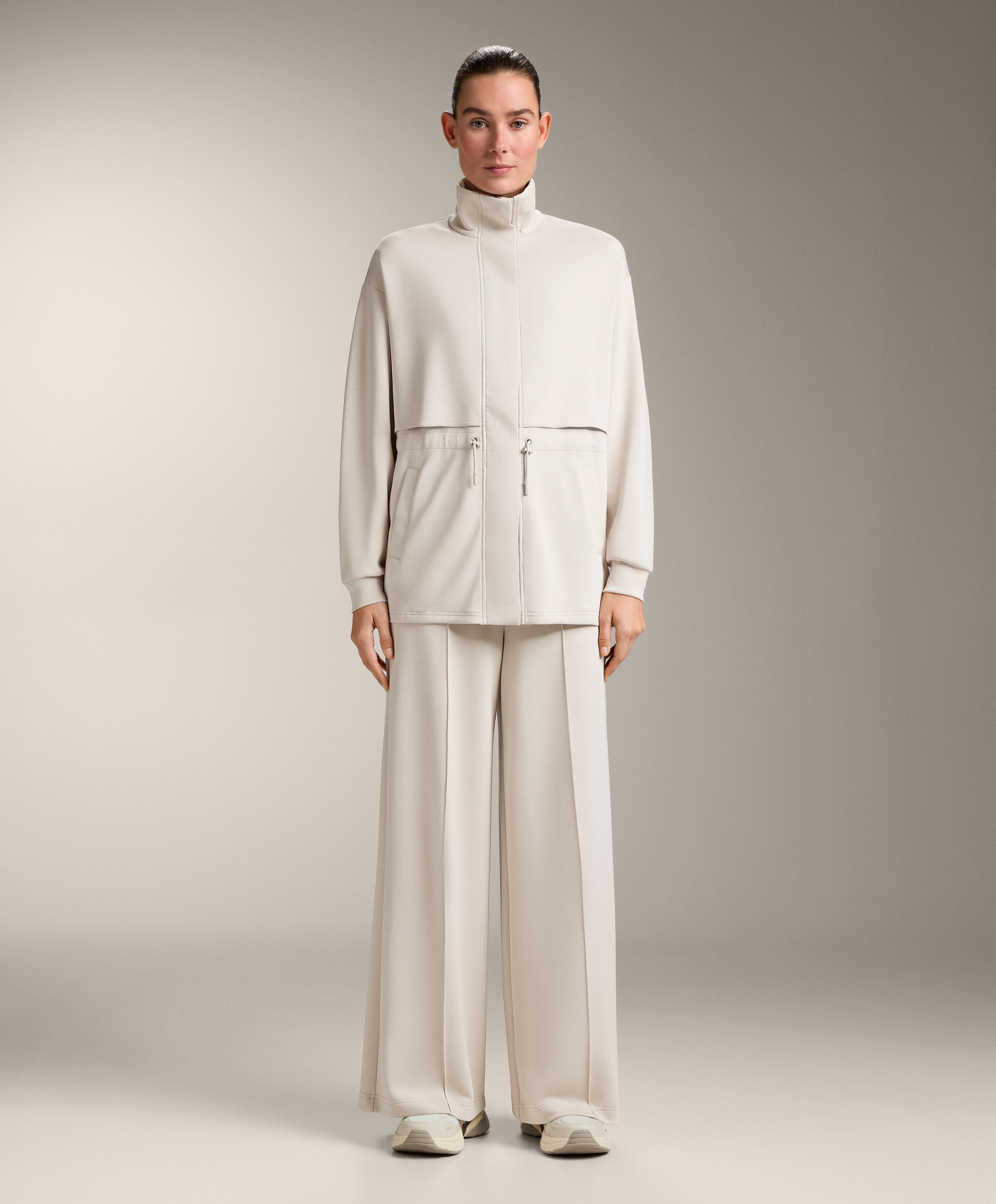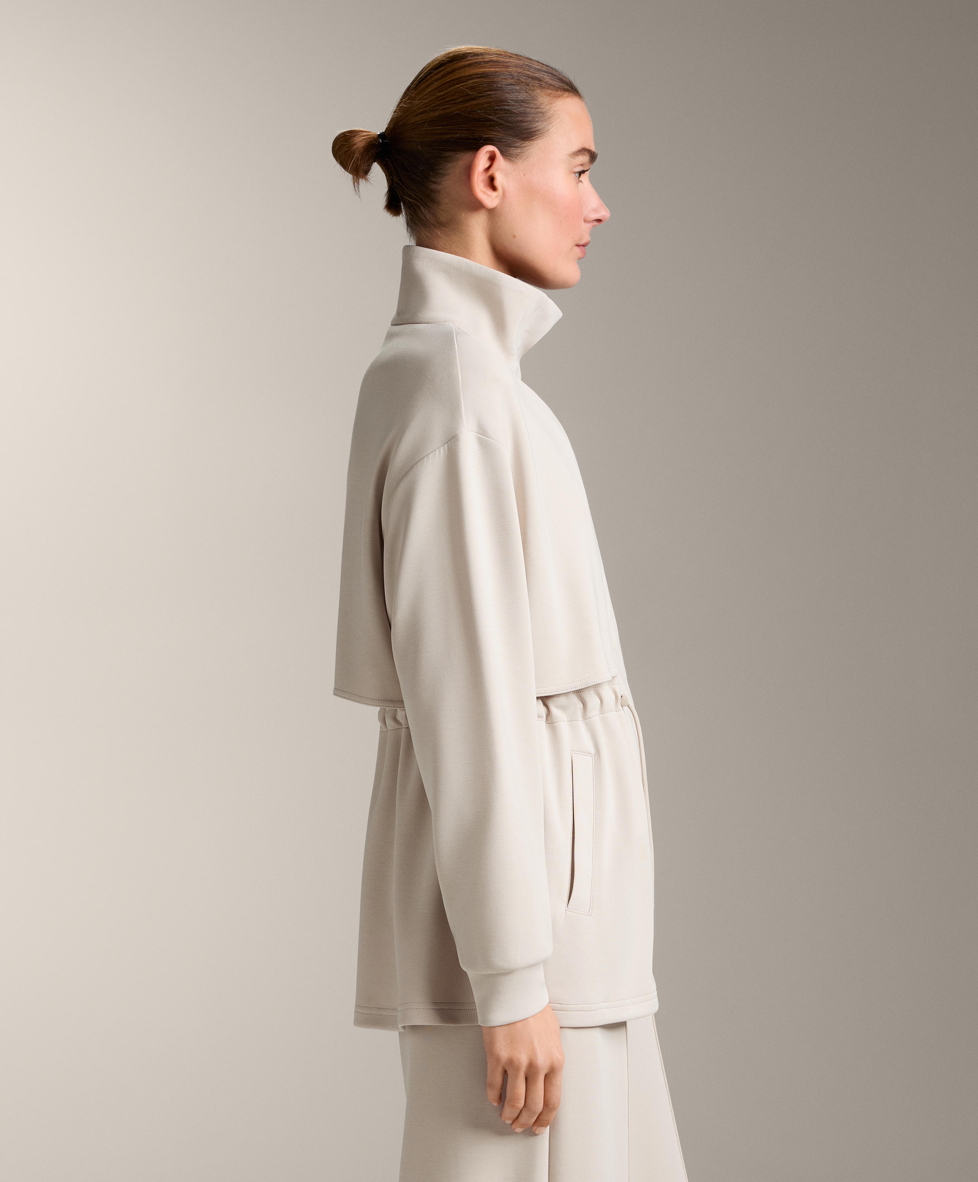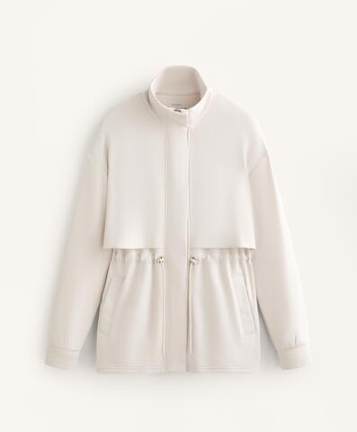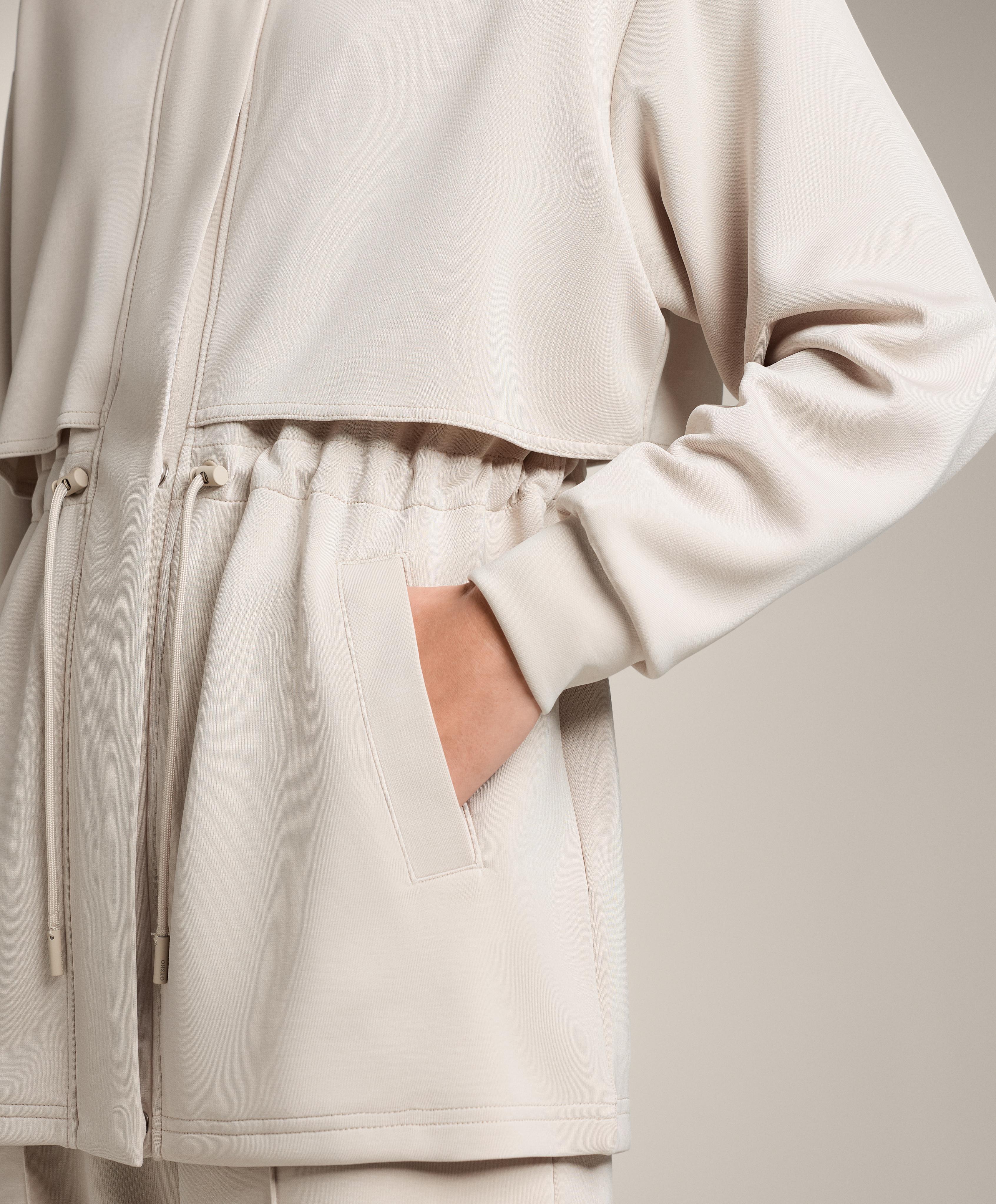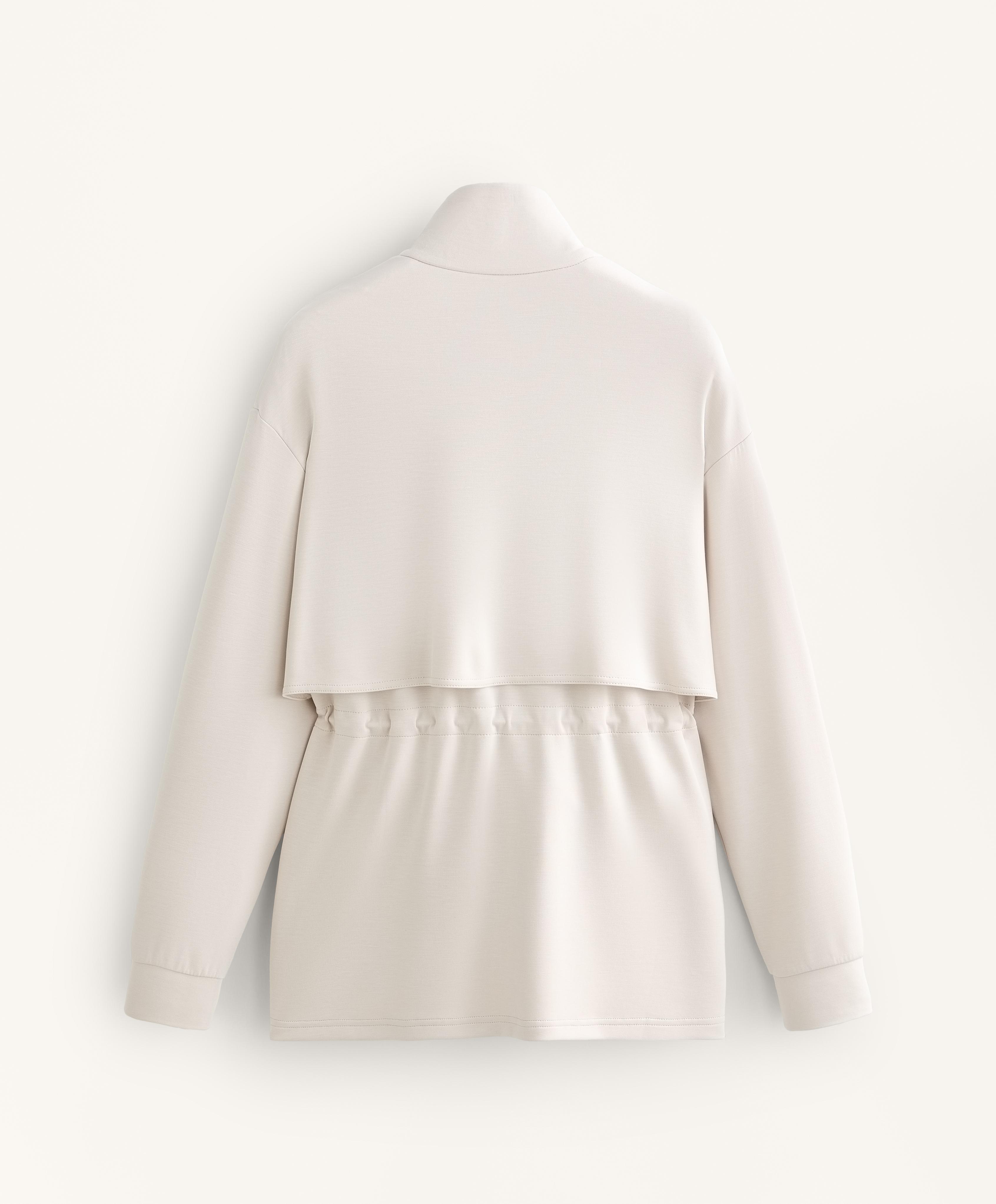 Длинная куртка с высоким воротником и застежкой на молнию и пуговицы спереди. Талия регулируется шнурком. Передние карманы. Дышащая ткань из модала, мягкая на ощупь.