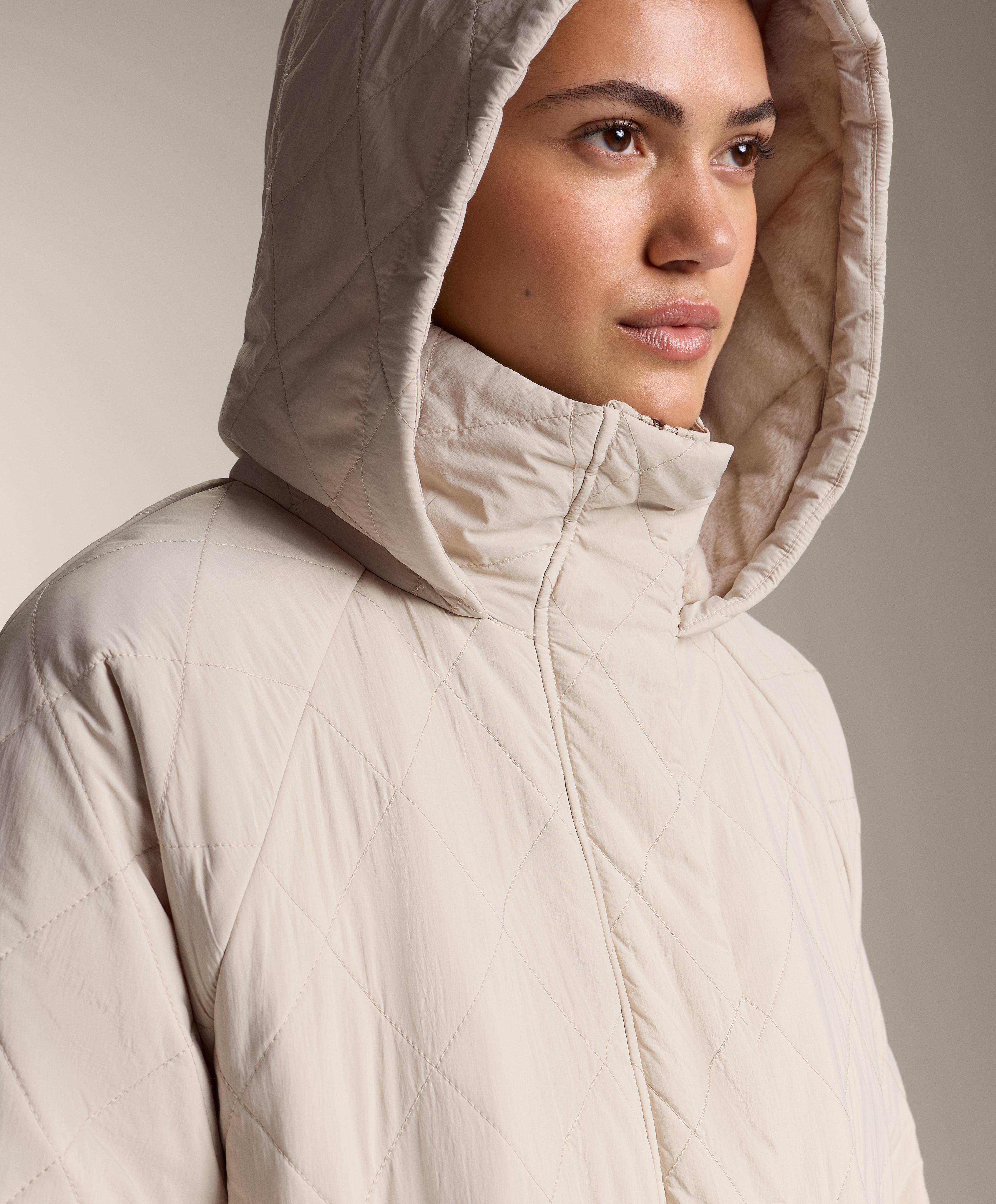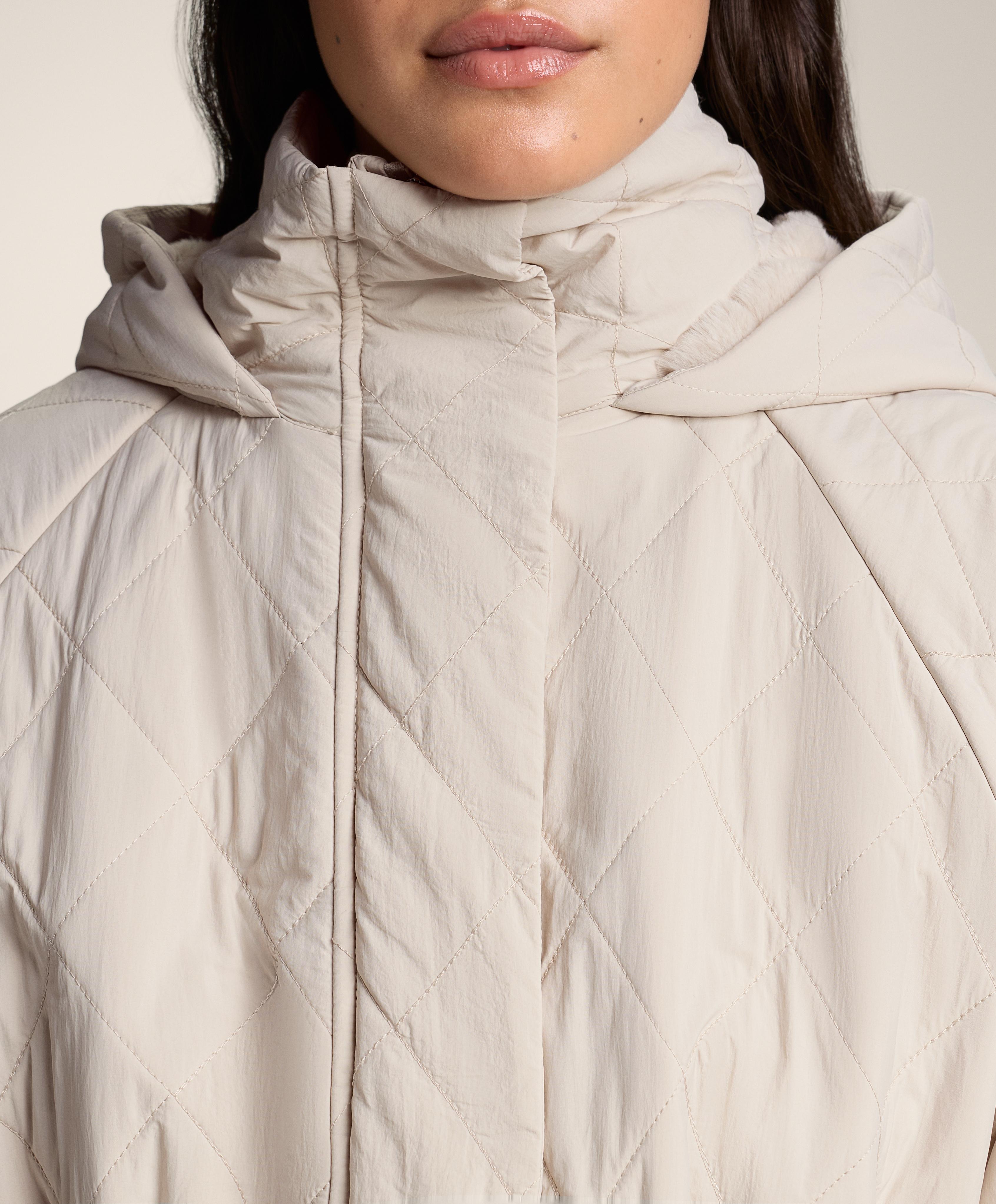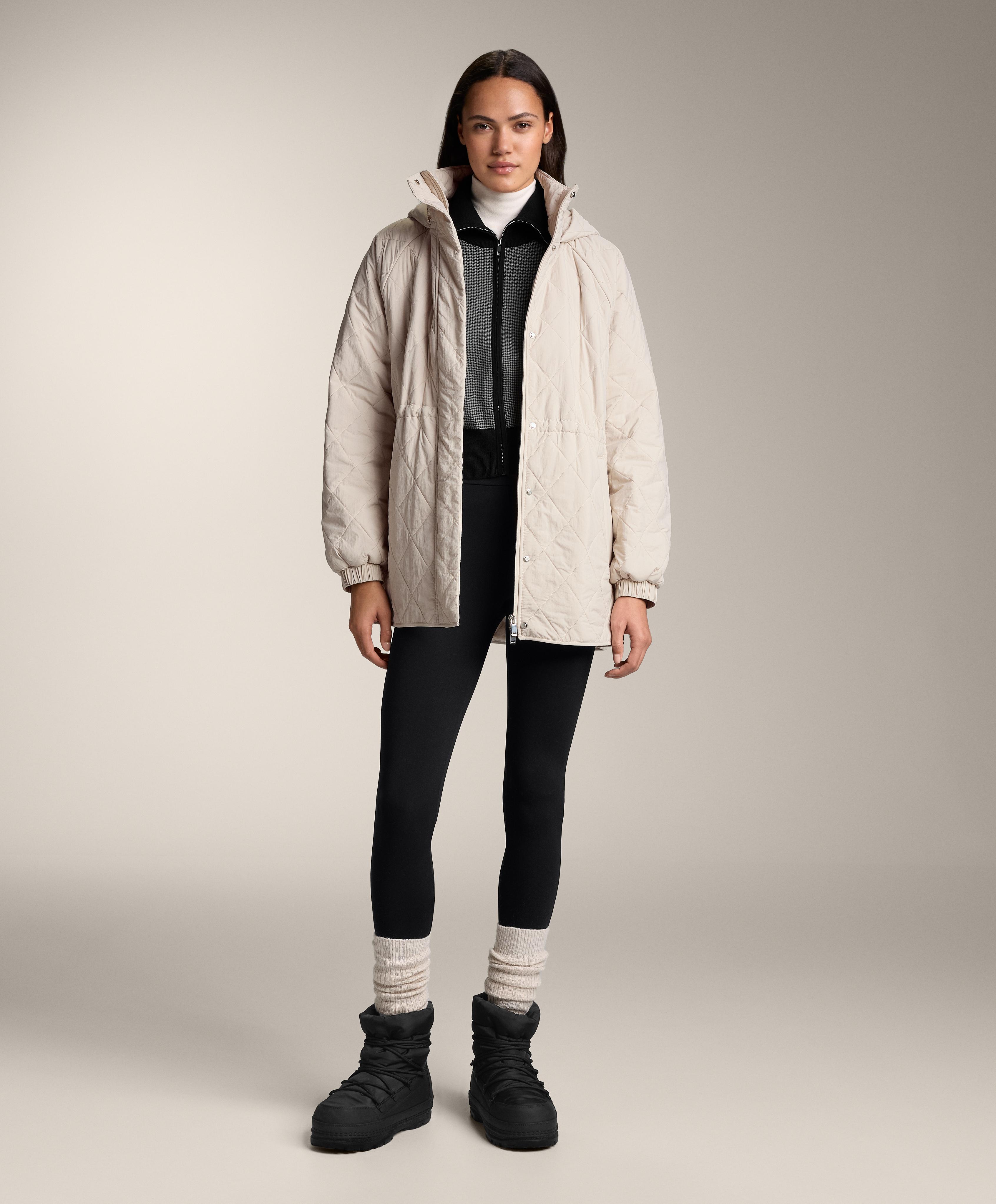 Длинная водоотталкивающая стеганая куртка с капюшоном и с наполнителем FELLEX® с AEROGEL. Технология FELLEX® AEROGEL сделана из полиэстера и содержит компонент AEROGEL, который позволяет увеличить теплоизоляцию, не добавляя лишнего веса одежде. Этот материал используется в комбинезонах космонавтов из-за его легкости и теплоемкости.
