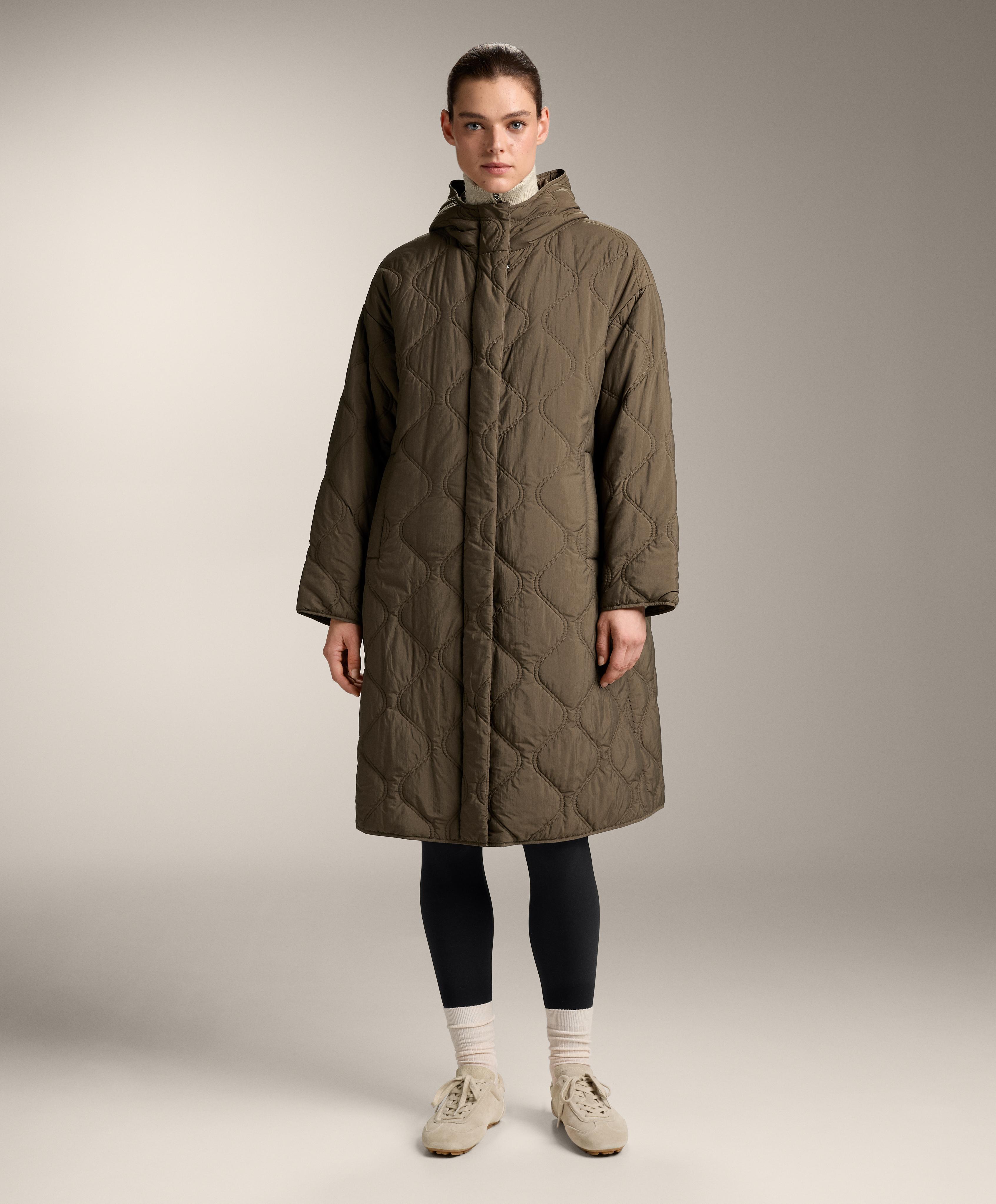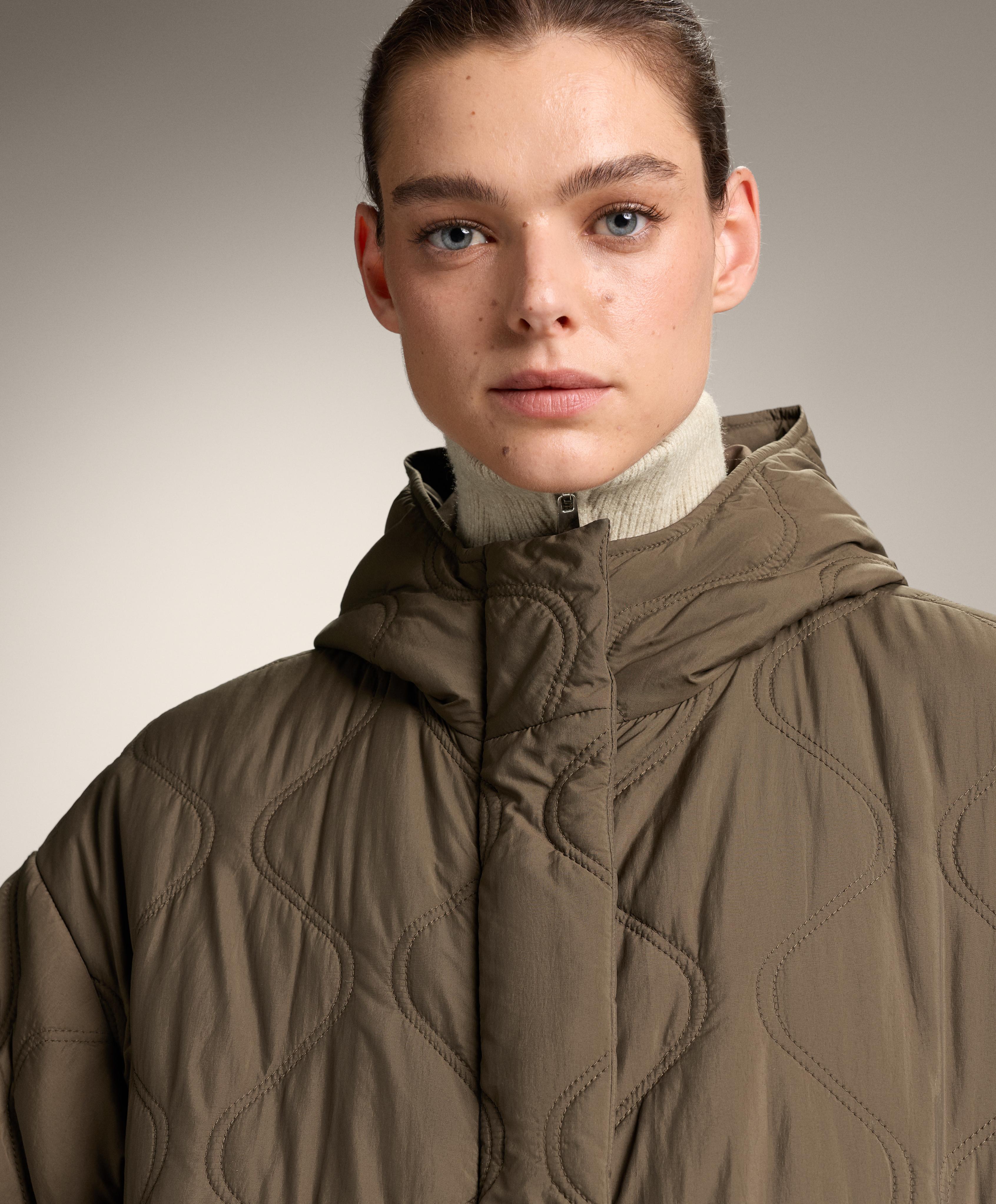 Длинная утепленная куртка с капюшоном, высоким воротником, застежкой на молнию и кнопку. Передние карманы с подкладкой из флиса и застежкой-молнией. Манжеты на рукавах. Водоотталкивающая, ветрозащитная и дышащая ткань.