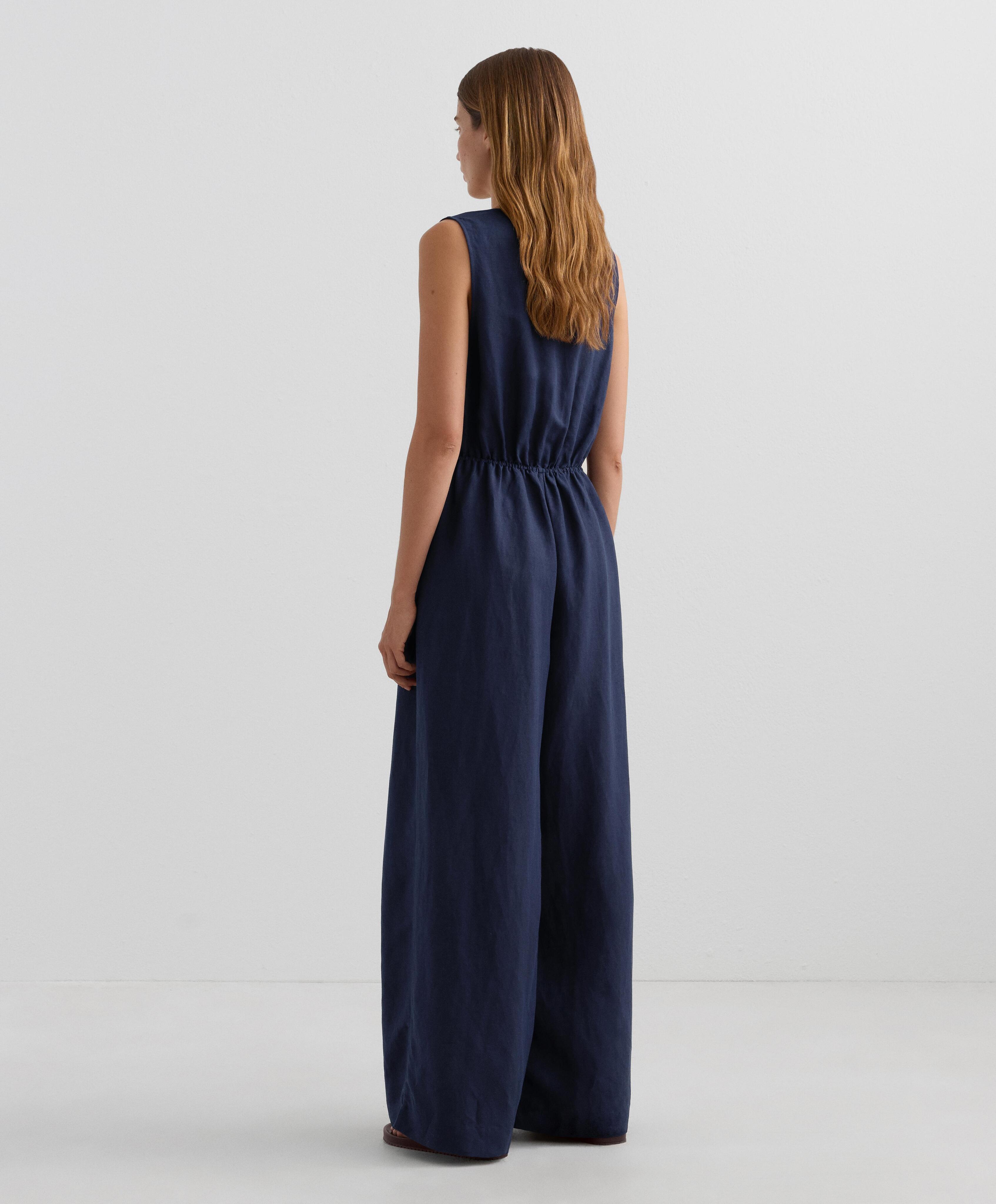 Длинный комбинезон с брюками-халатами и V-образным вырезом. Застежка на шнурке на талии. Ткань: лен.