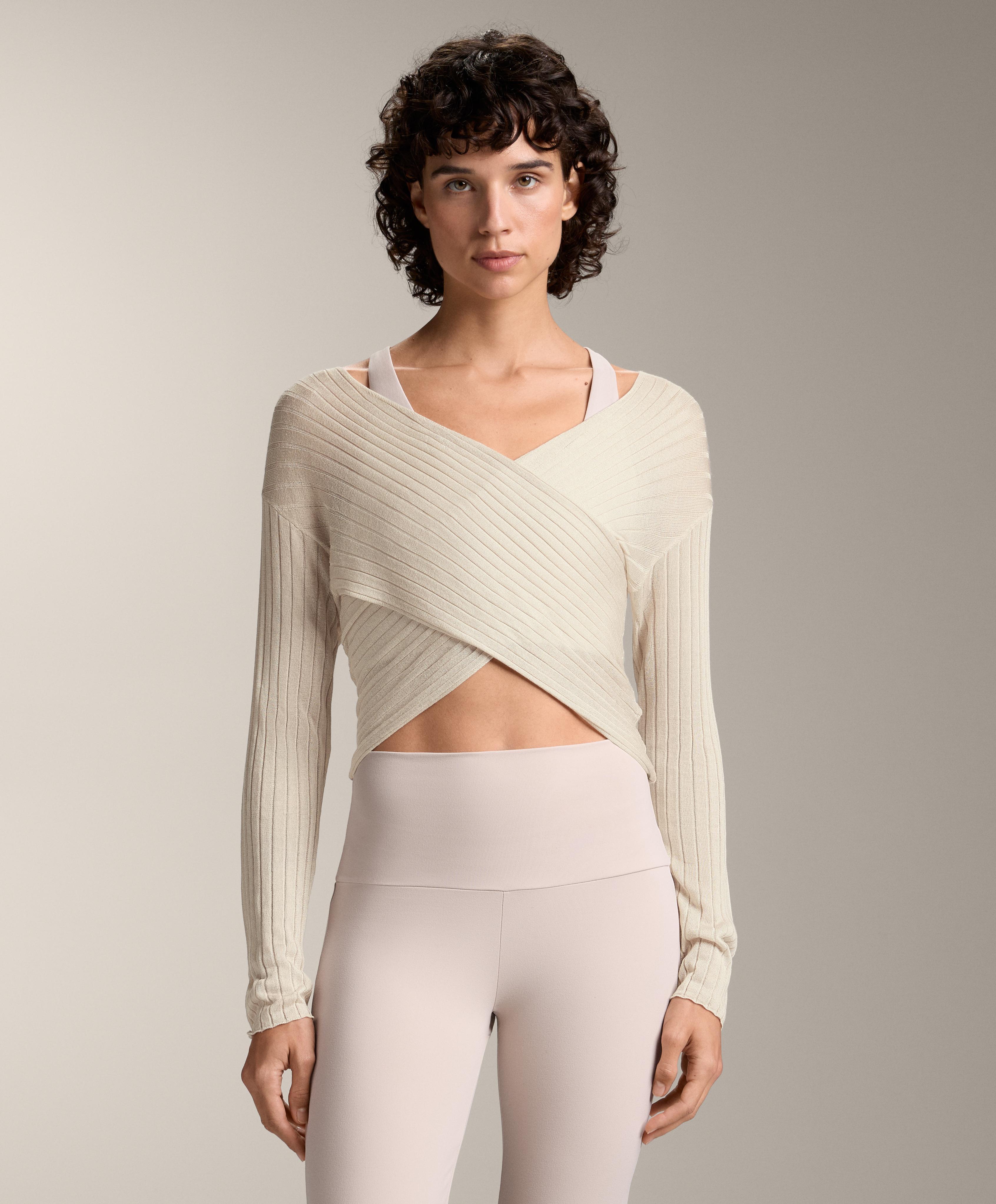Джемпер с длинными рукавами и запахом спереди. Трикотажная ткань в рубчик из тонкой полупрозрачной вязаной ткани.