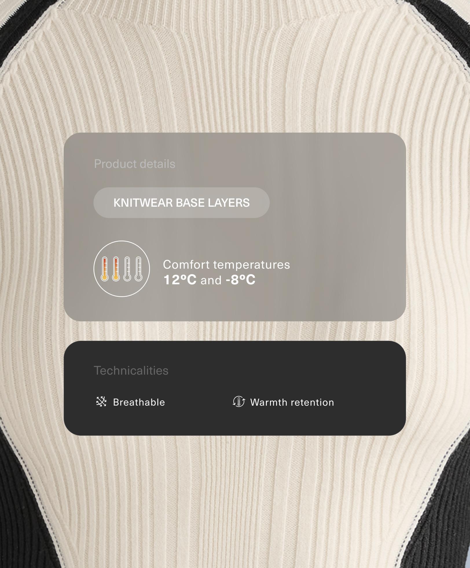 Этот предмет одежды сертифицирован и выдерживает температуру 12ºC при низкой активности и -8ºC при умеренной активности в ходе стандартизированного испытания с имитацией ветра 0,4 м/с с надетой курткой, брюками, нижним бельем, носками, обувью, перчатками и вязаной шапкой.