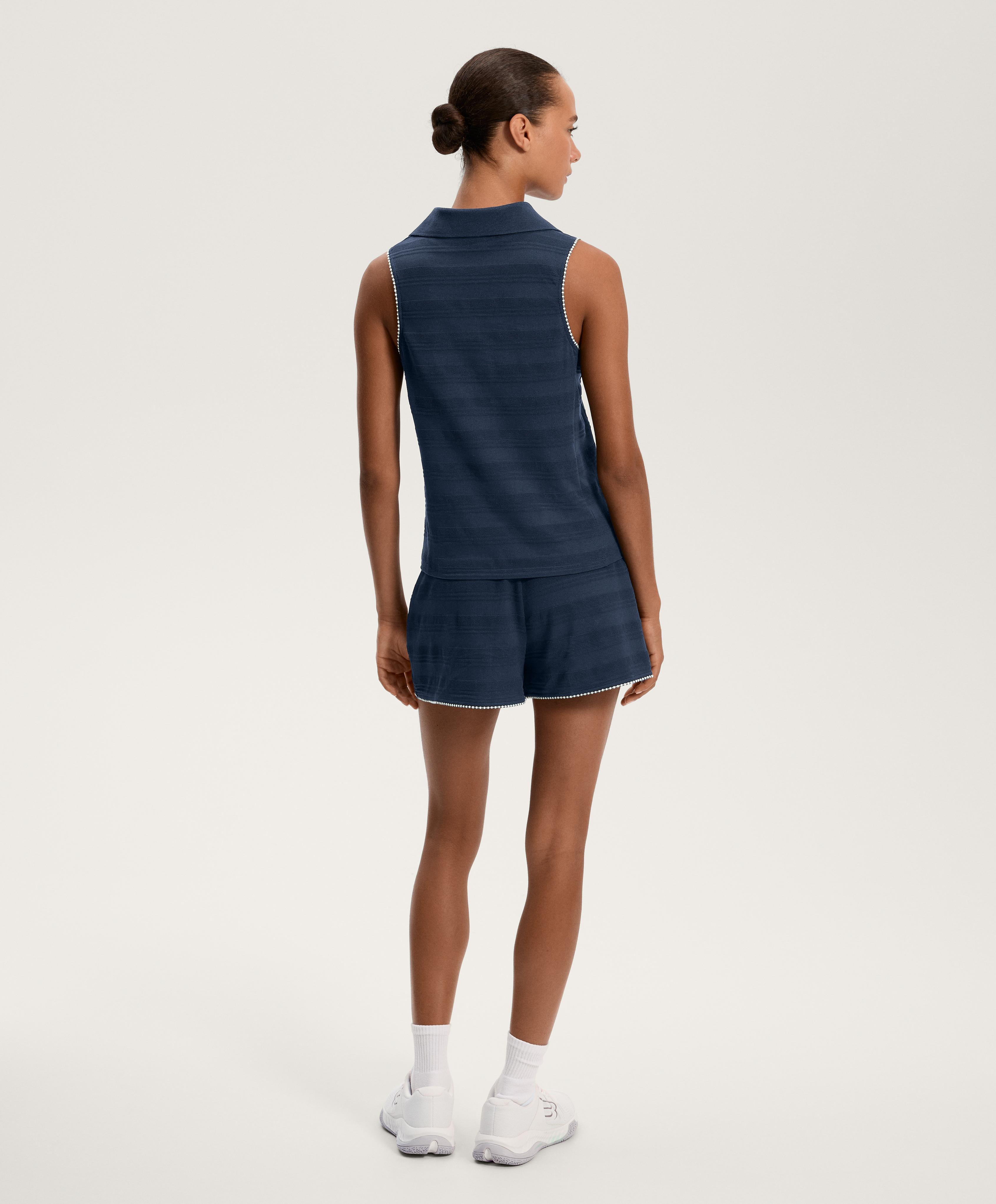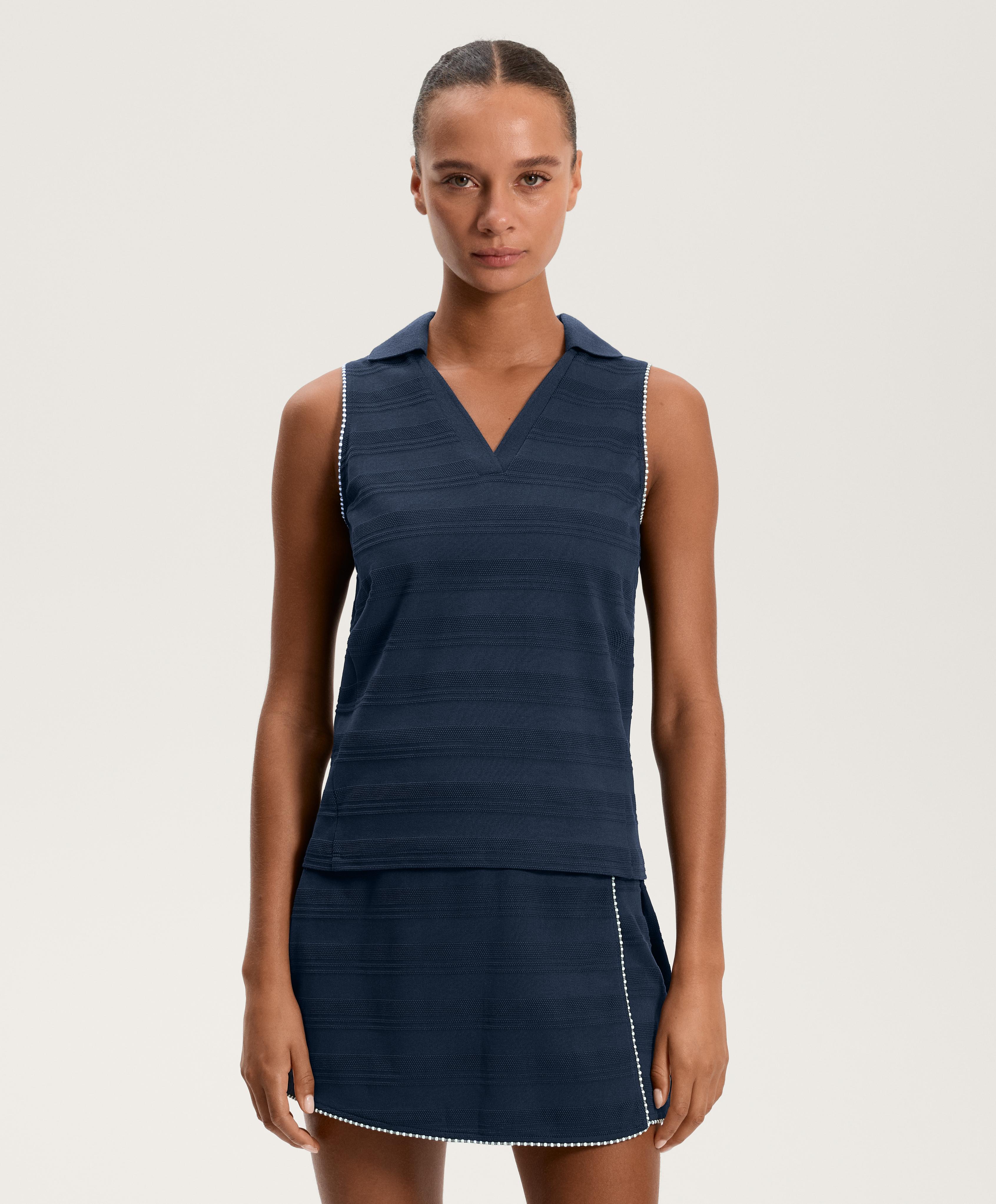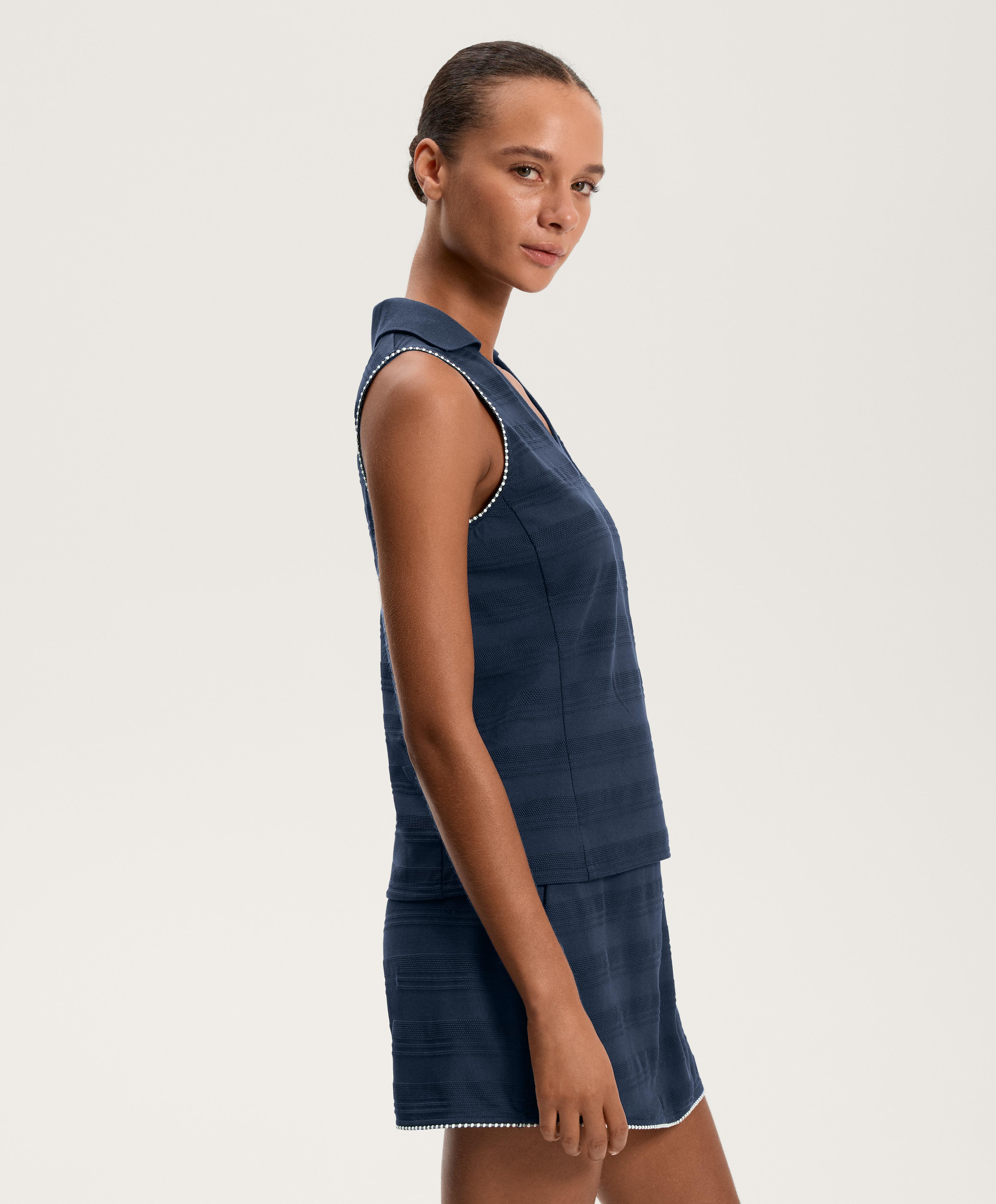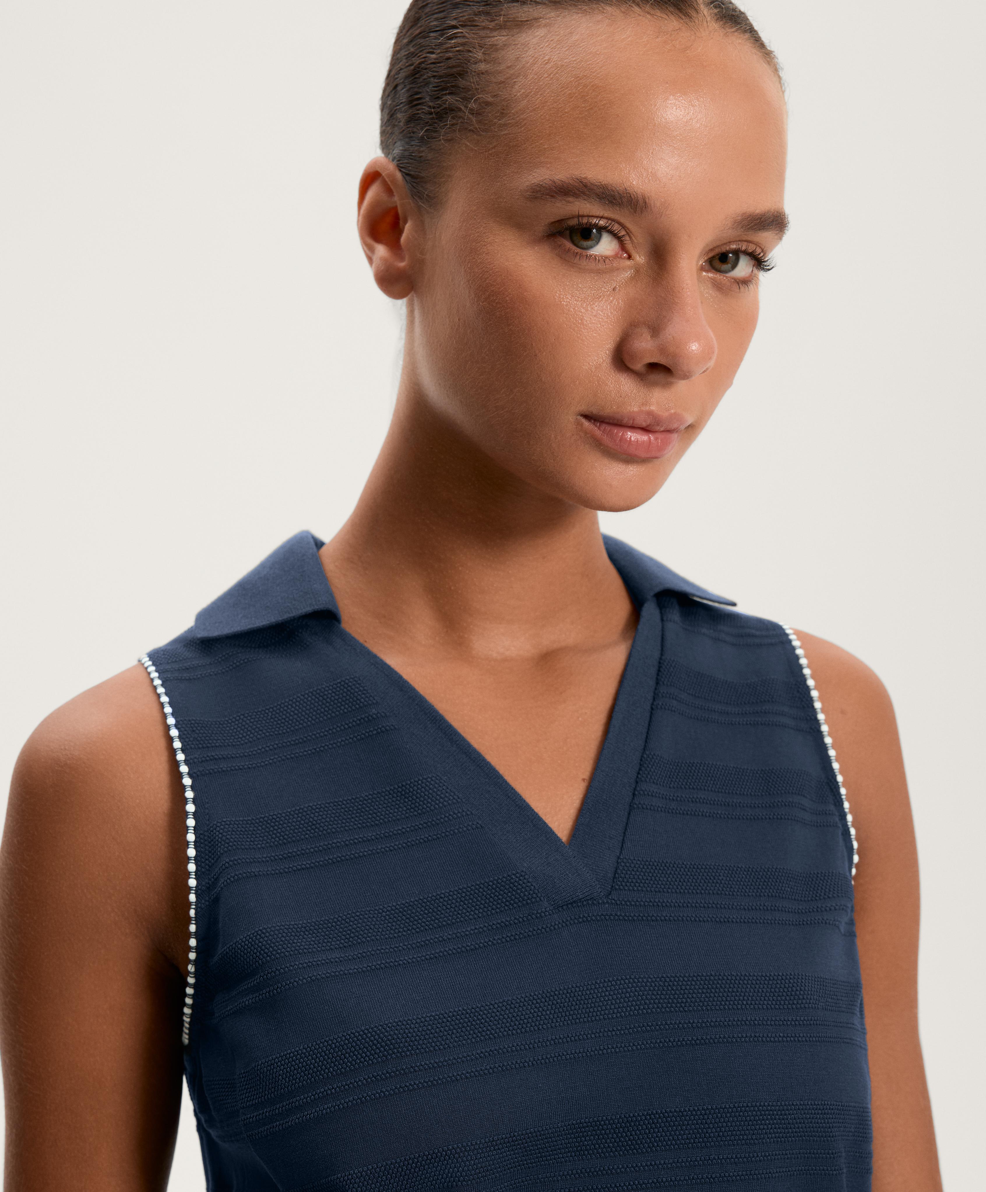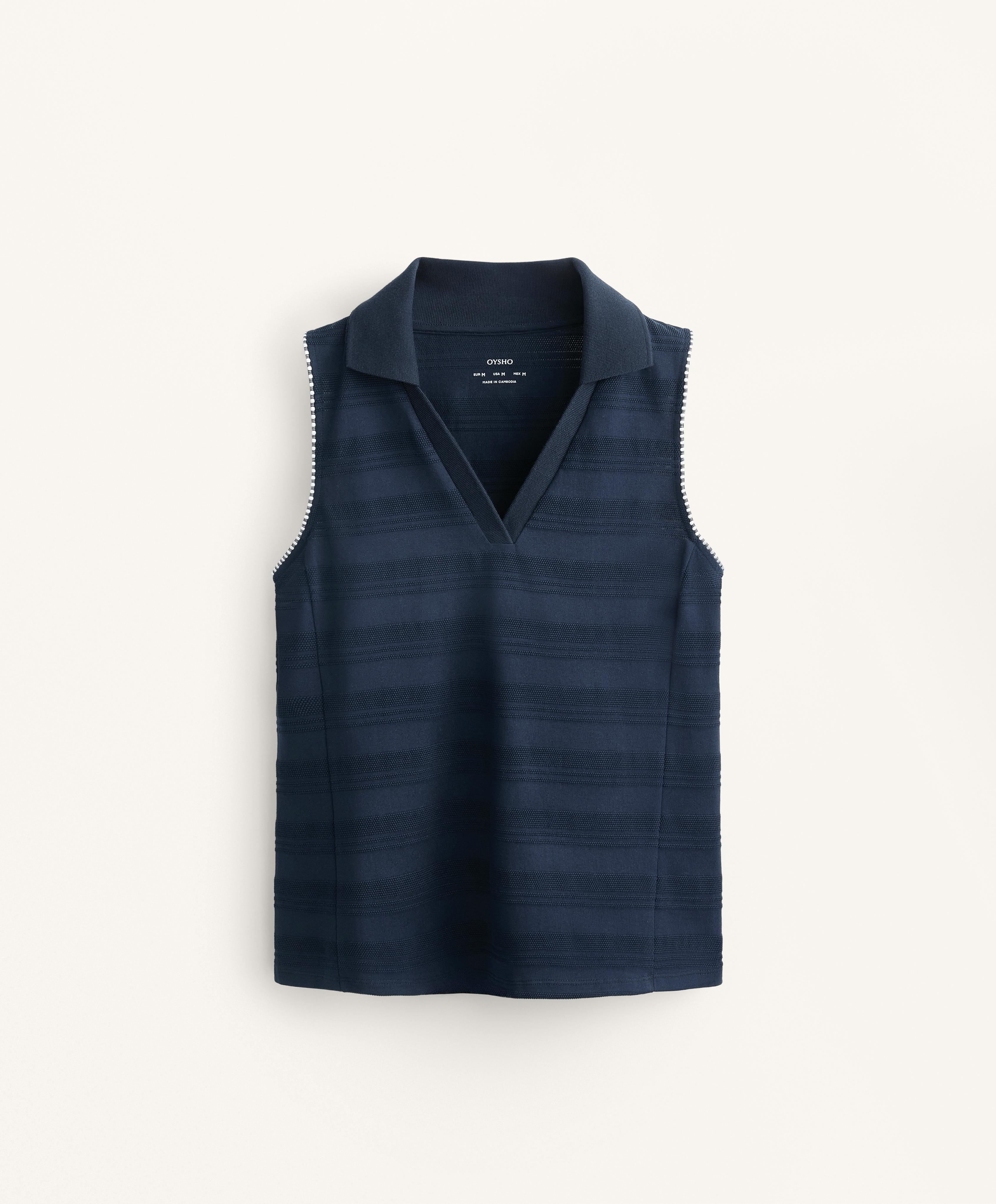 Поло без рукавов из жаккардовой ткани с V-образным вырезом. Декоративная контрастная отделка по проймам. Ткань: 100% хлопок.