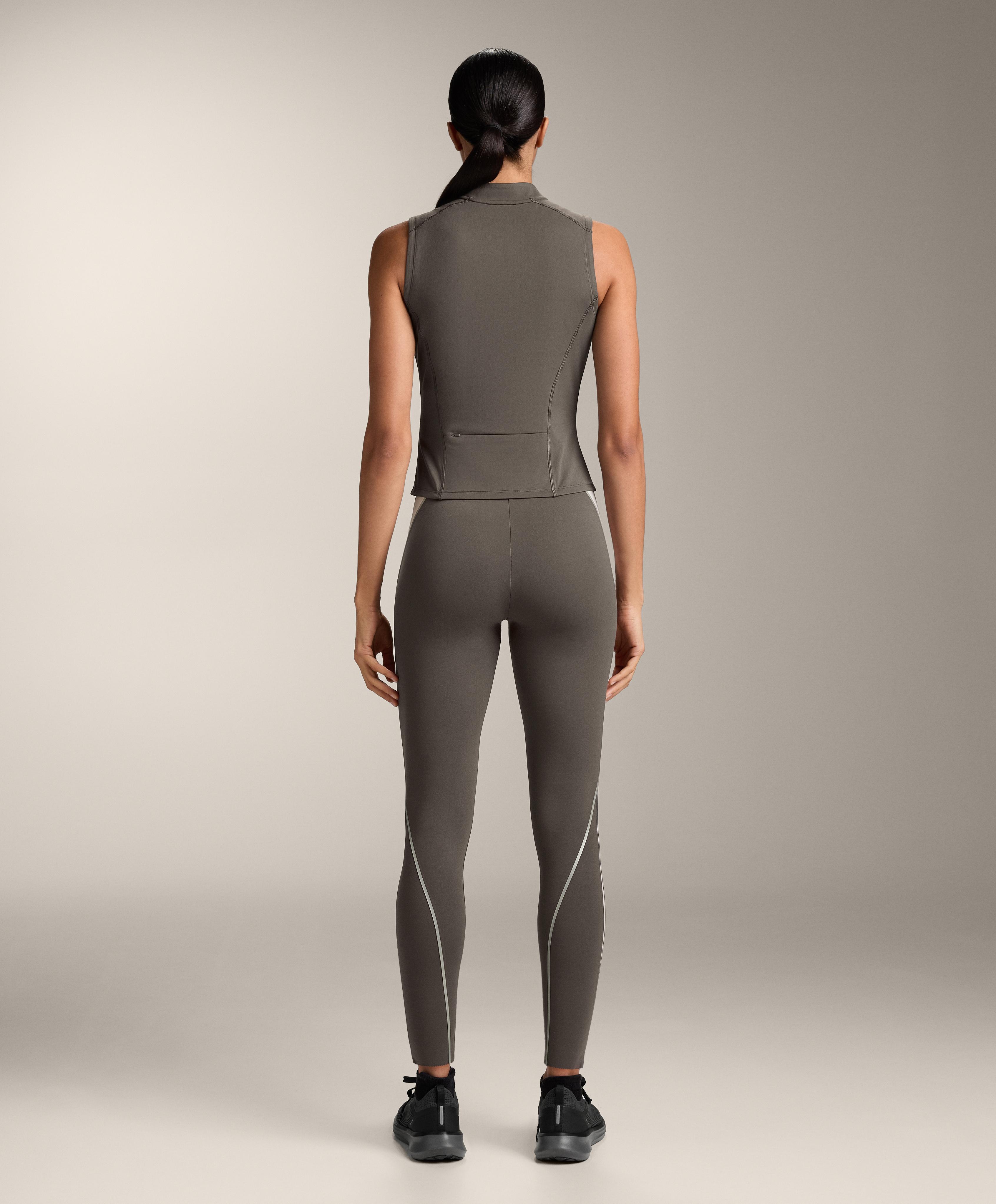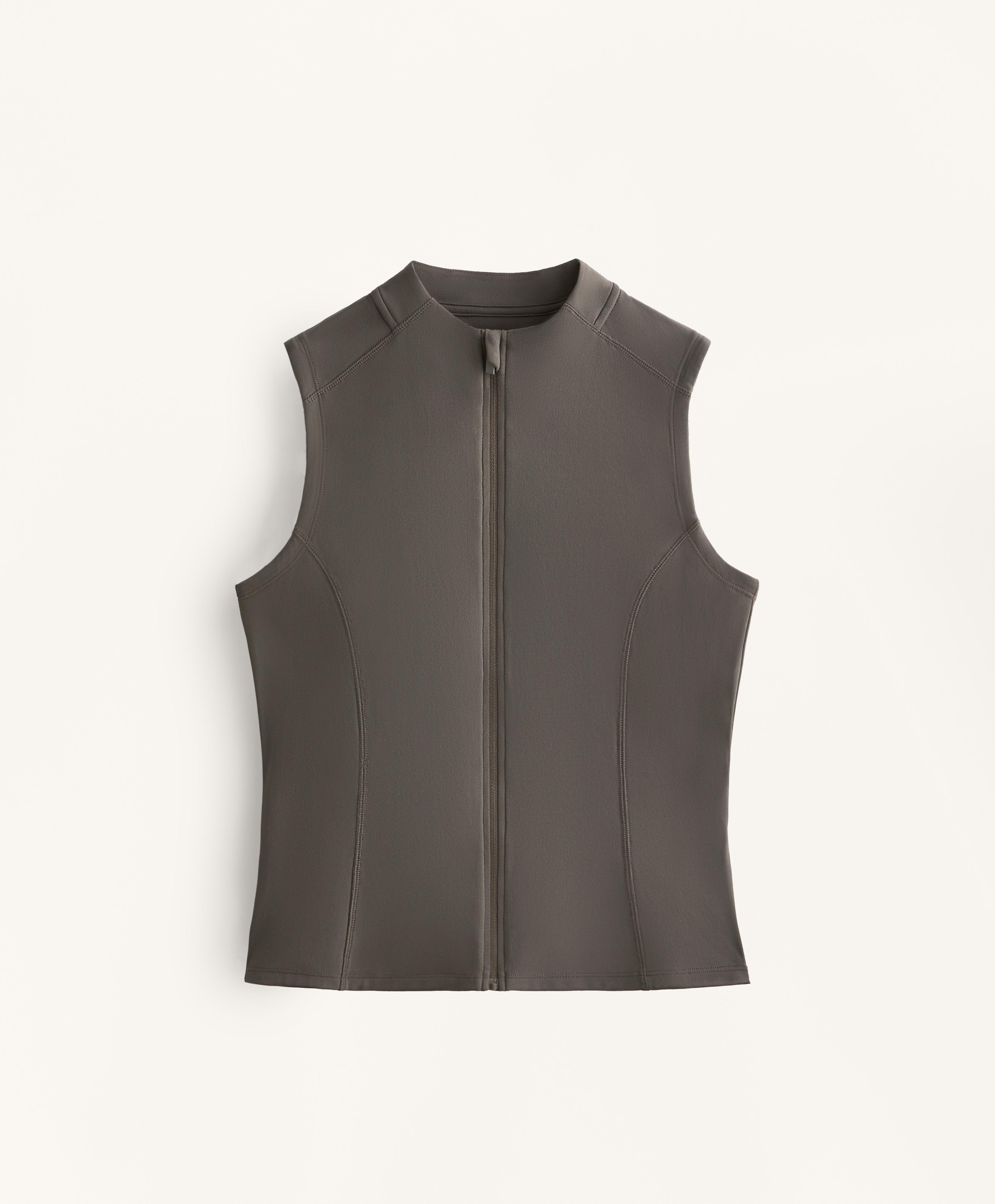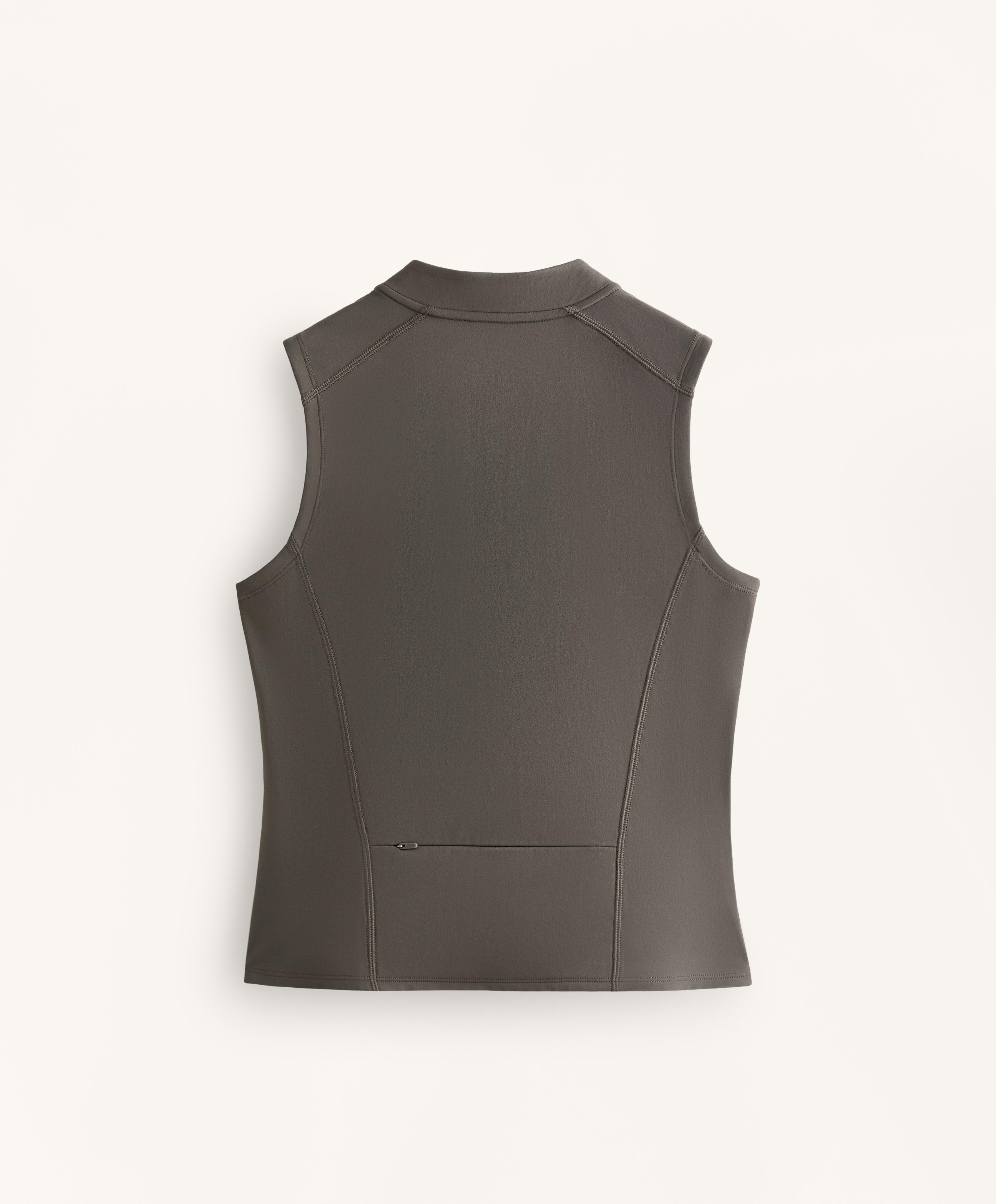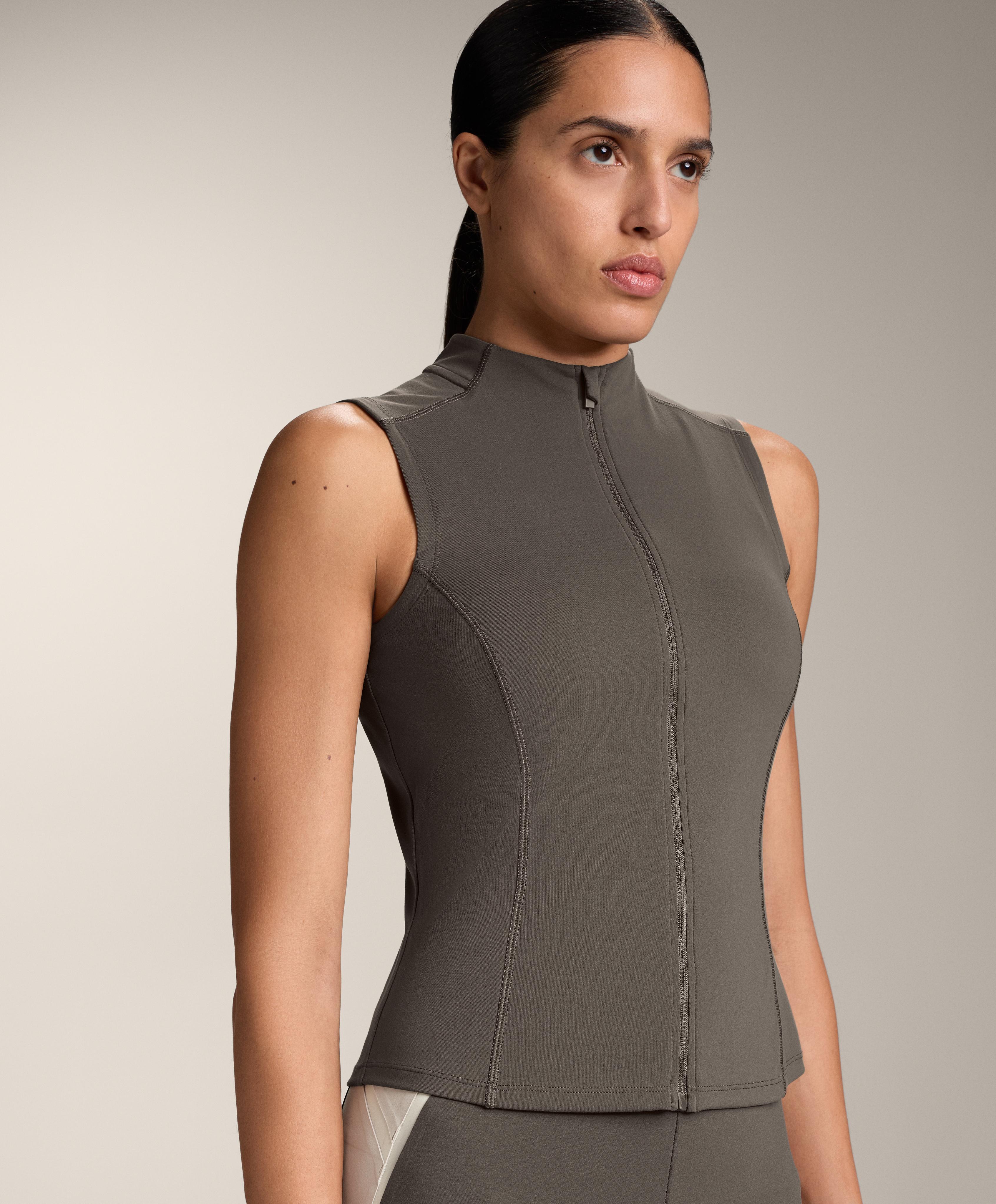 Футболка без рукавов. Разрез спереди на молнии. Воздухопроницаемая и быстросохнущая ткань.