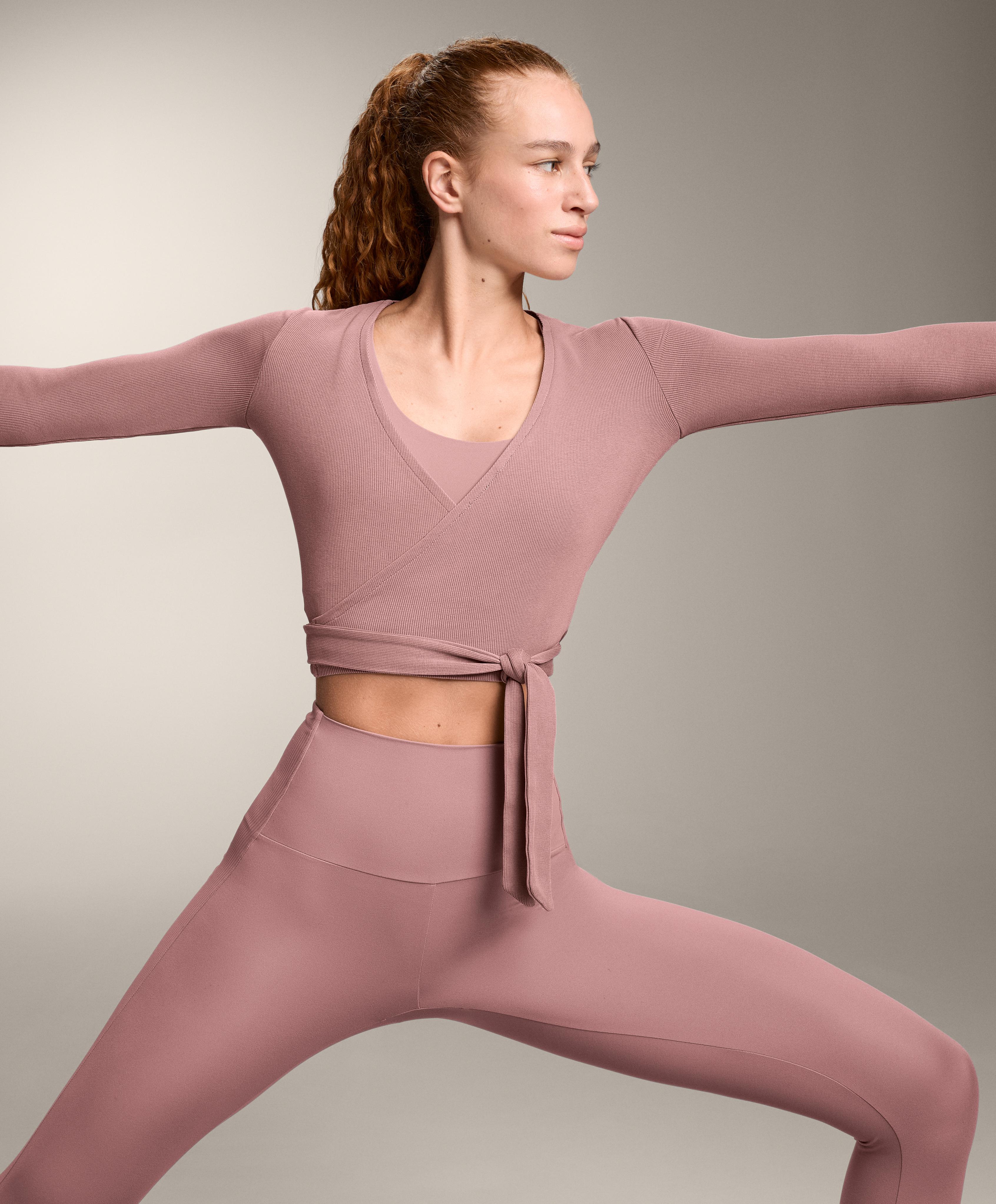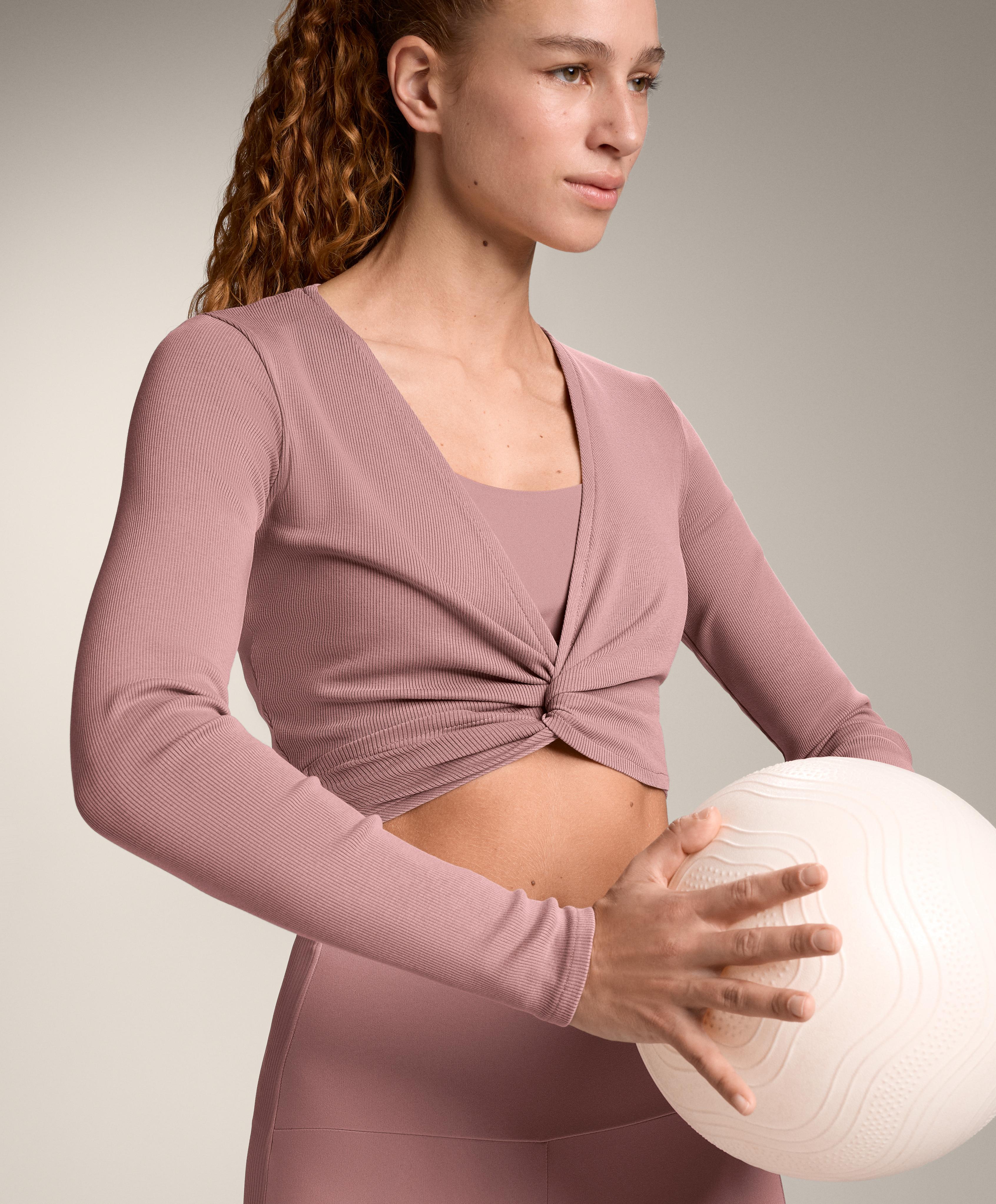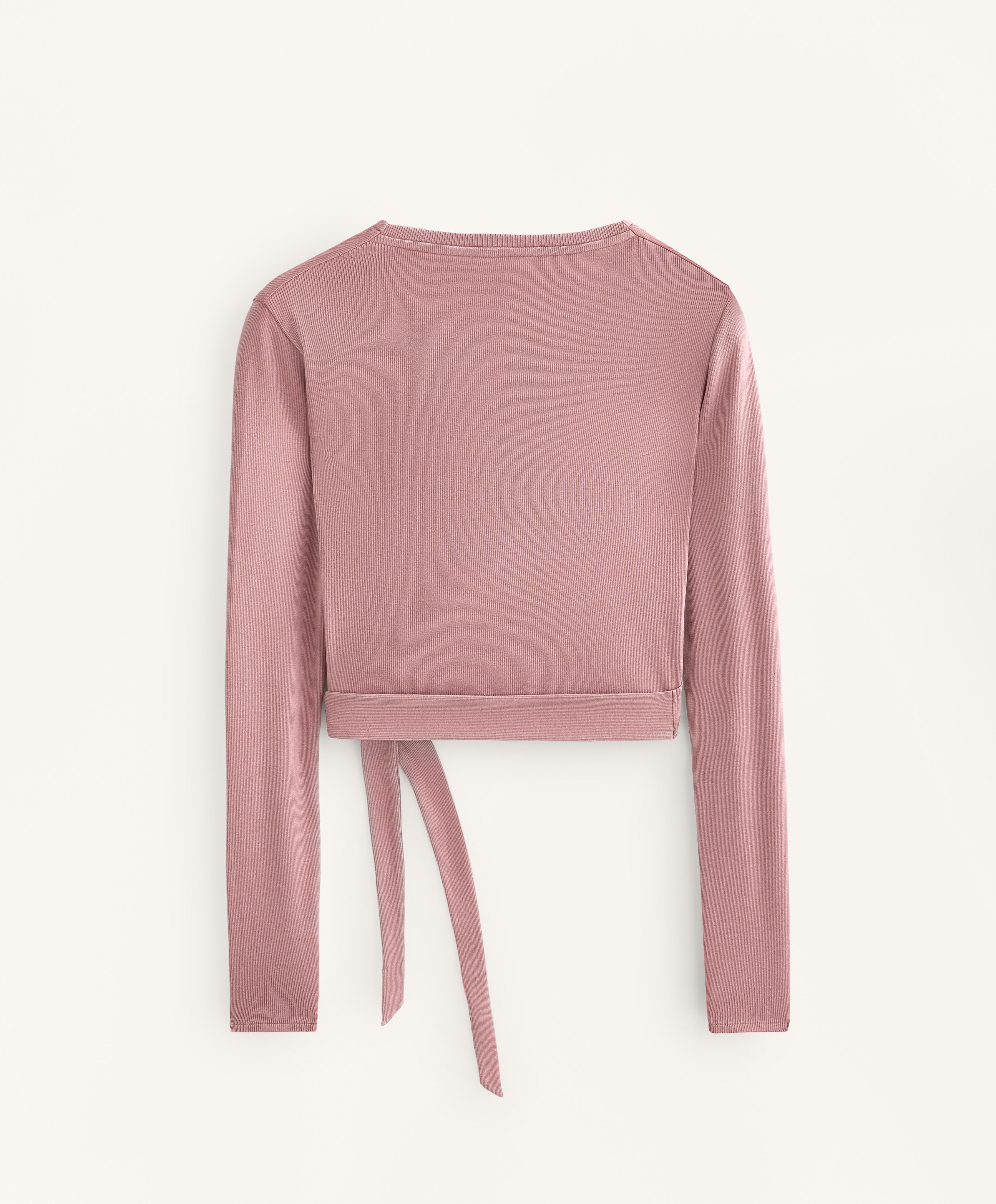 Футболка с длинными рукавами и запахом, с поясом на талии. Ткань в рубчик из смесового хлопка.