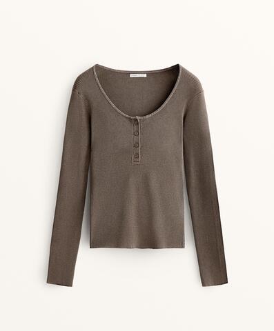 Облегающая футболка с длинными рукавами и круглым вырезом. Детали с пуговицами спереди до середины груди. Изготовлена из рубчатой ткани.
