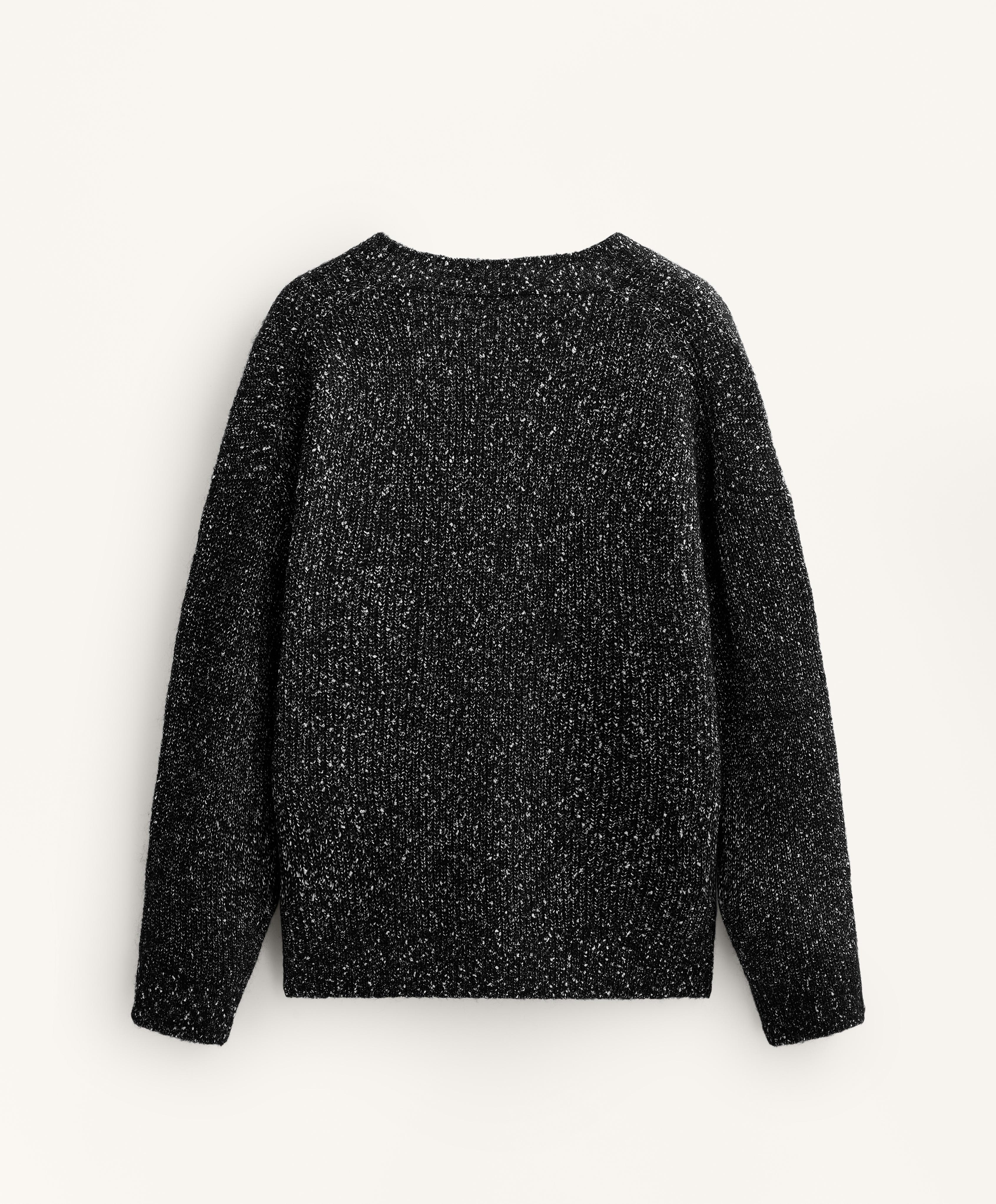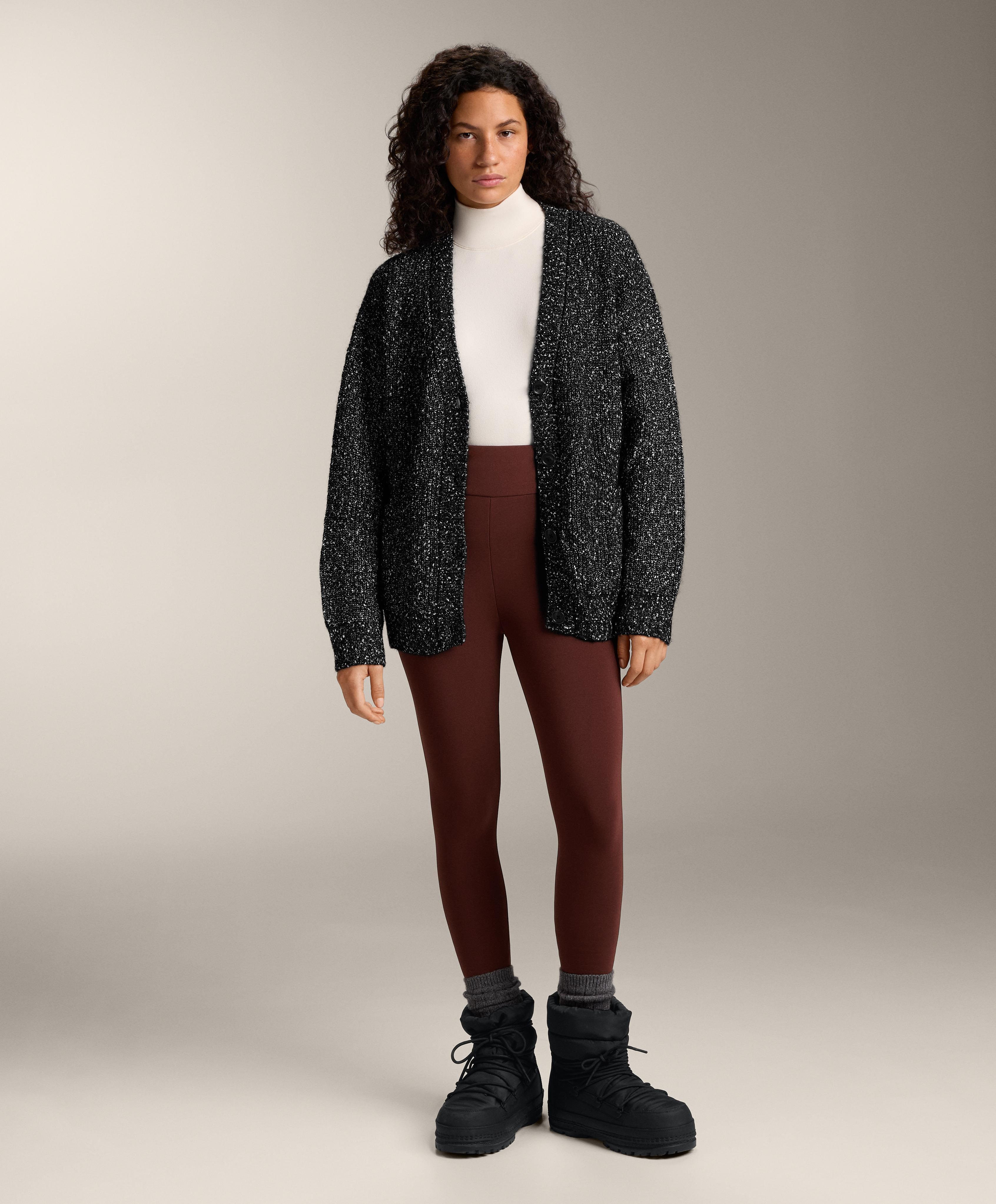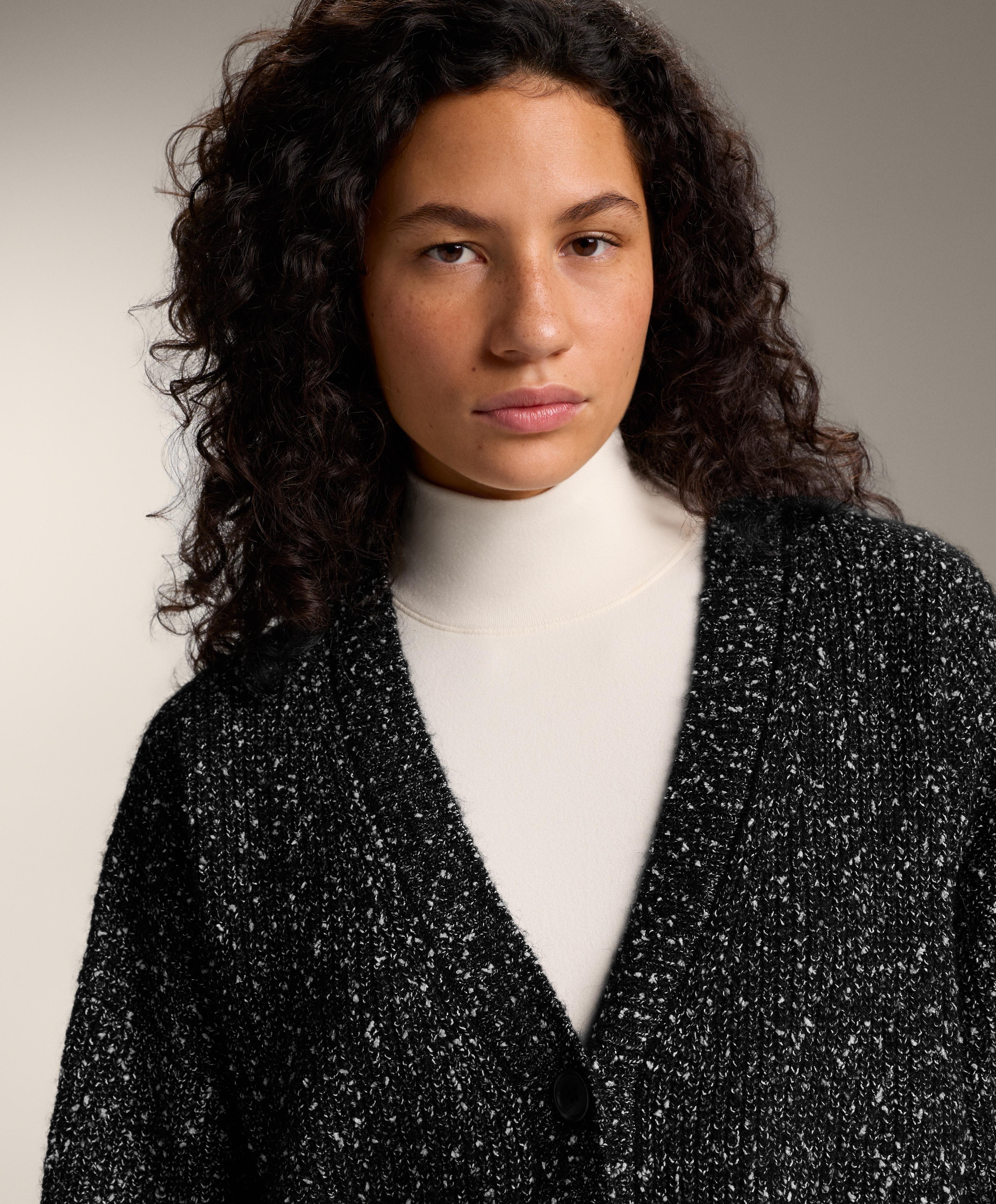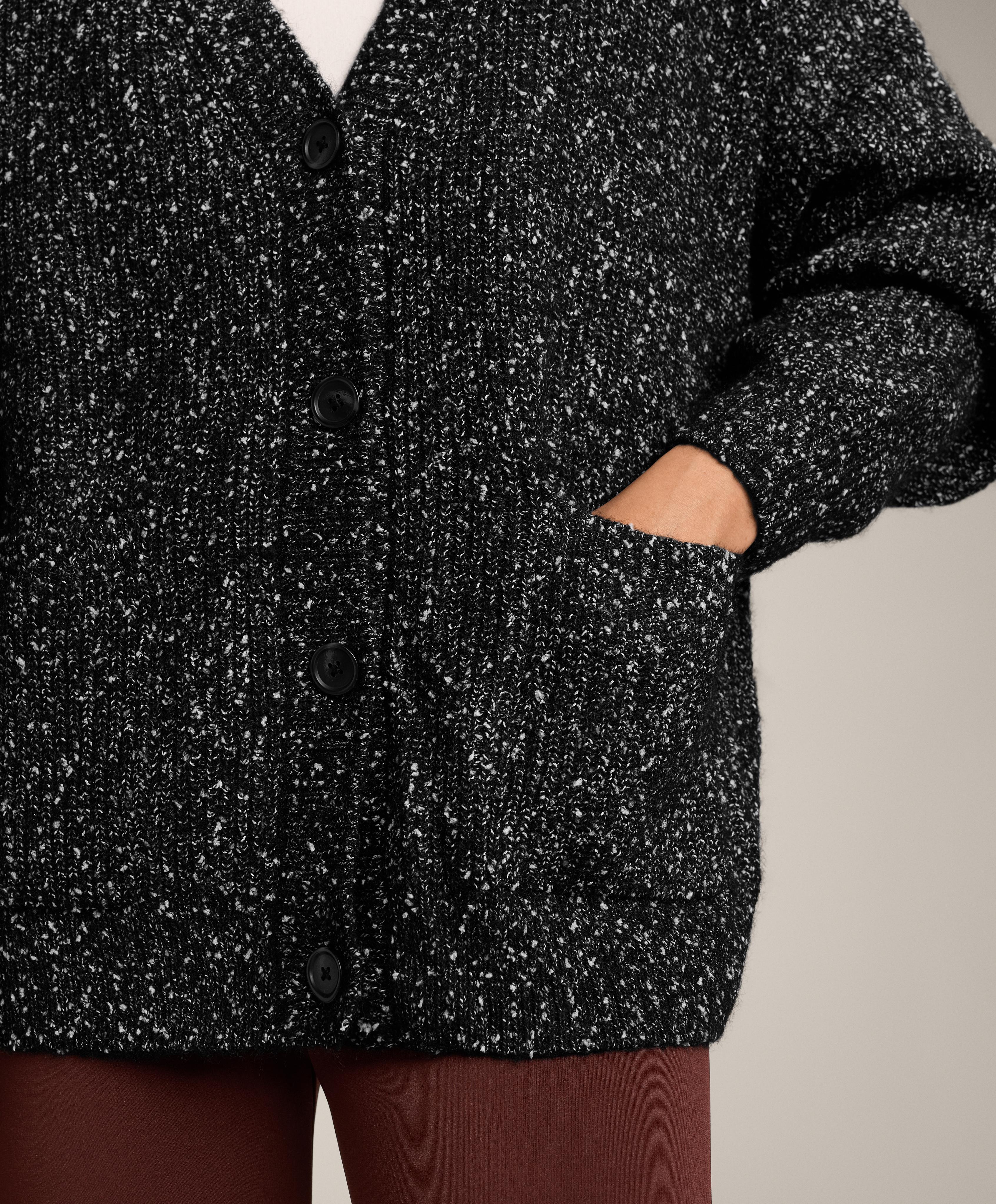 Кардиган с длинными рукавами, V-образным вырезом и застежкой на пуговицы спереди. Ткань с 27% содержанием шерсти и контрастными непсами по всему изделию.